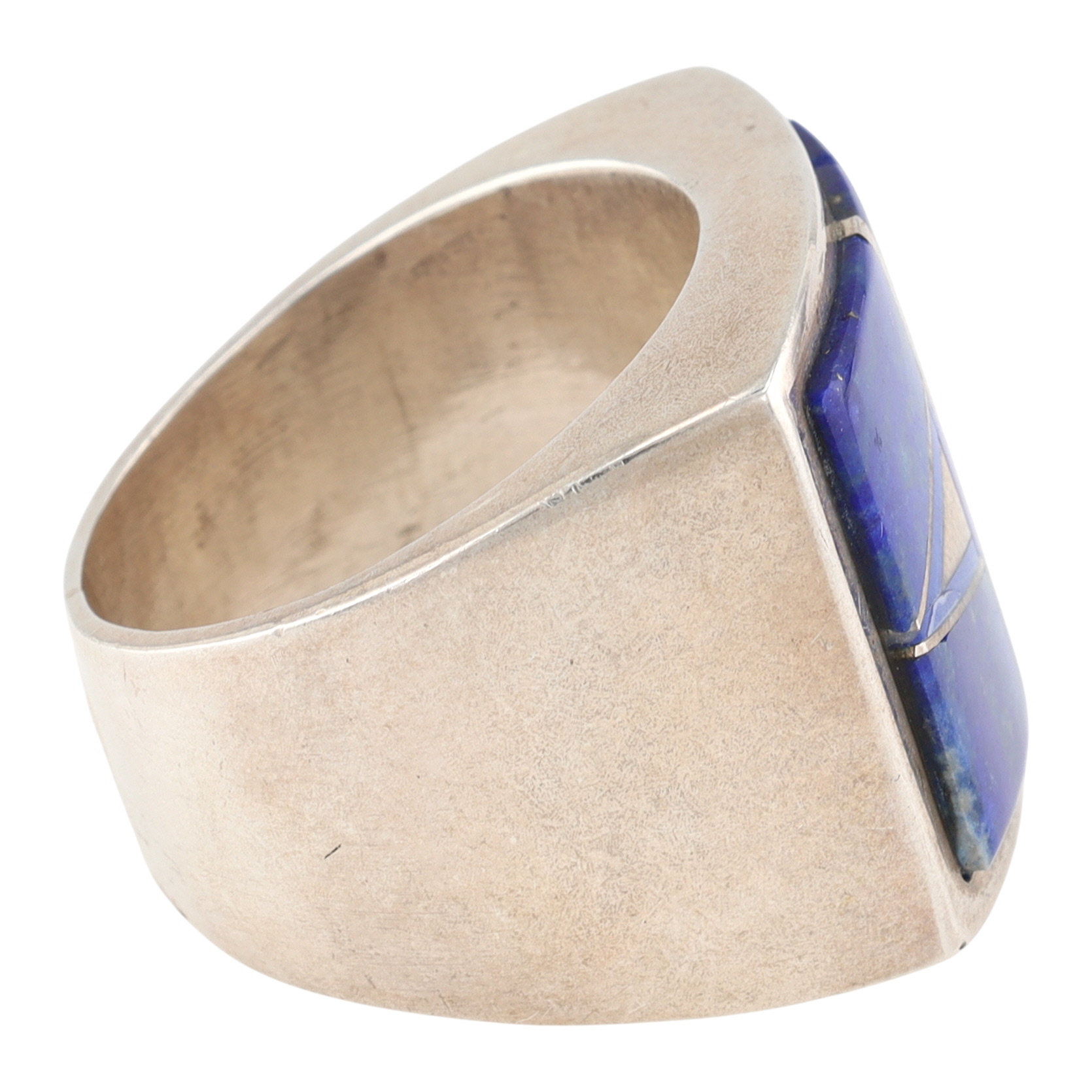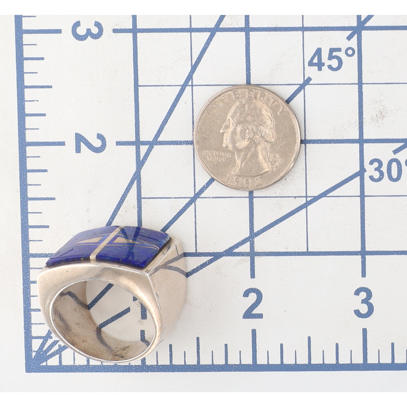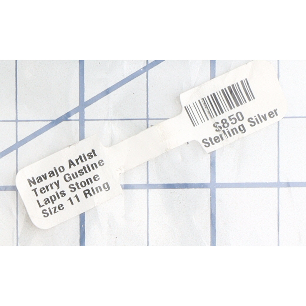 A Navajo sterling silver ring by Terry Gustine, featuring a wide, tapering band and a prominent rectangular face adorned with an intricate stone and metal inlay. The design utilizes deep blue lapis lazuli, exhibiting natural gold flecks, alongside silver-colored metal to create a geometric pattern of a central vertical bar intersected by triangular elements. The interior of the band is stamped with the Touch of Santa Fe shop mark "TSF, " the metal quality mark "STERLING, " and an additional "TG" artist hallmark. An accompanying tag identifies the piece as by "Navajo Artist Terry Gustine, " confirming the materials as "Lapis Stone" and "Sterling Silver."