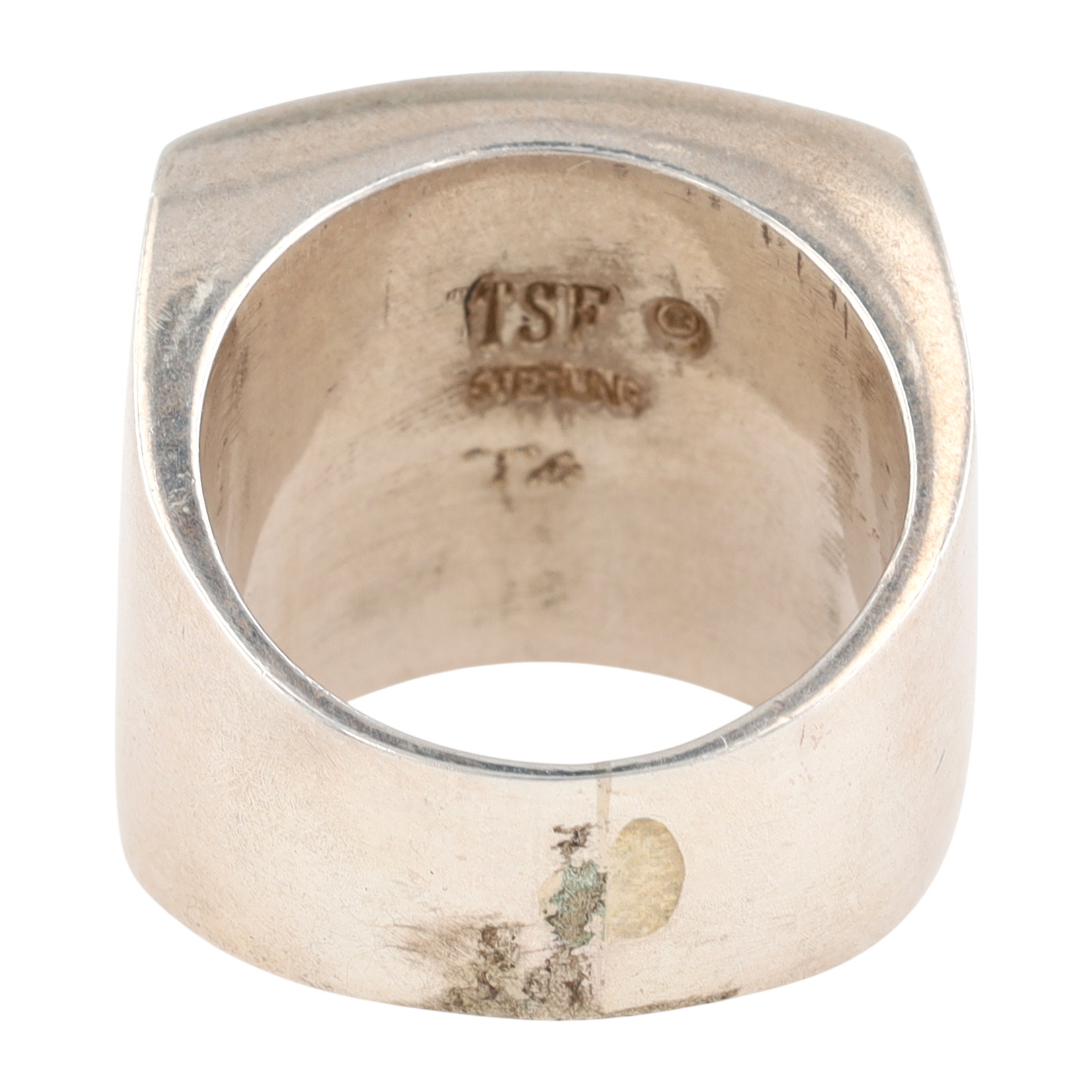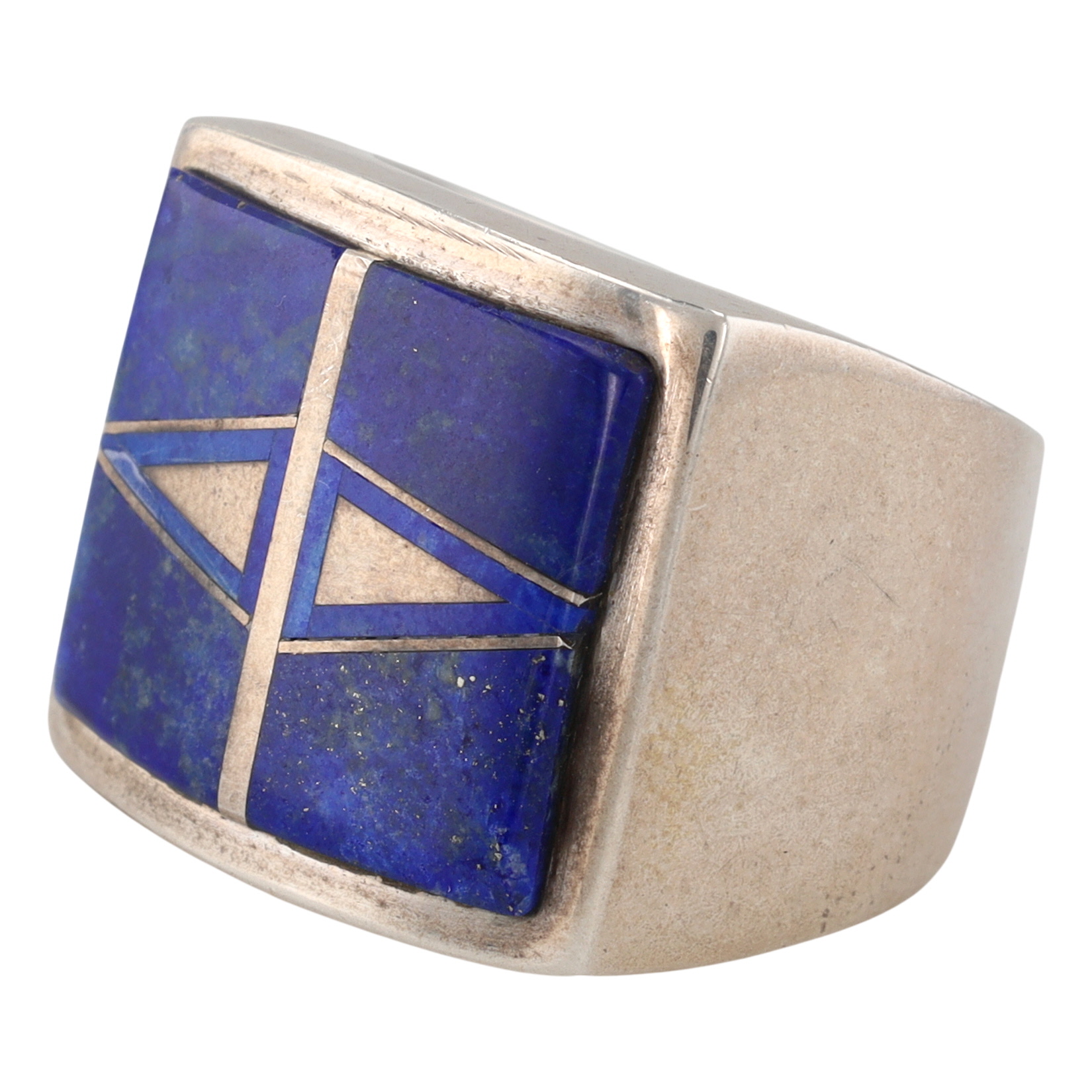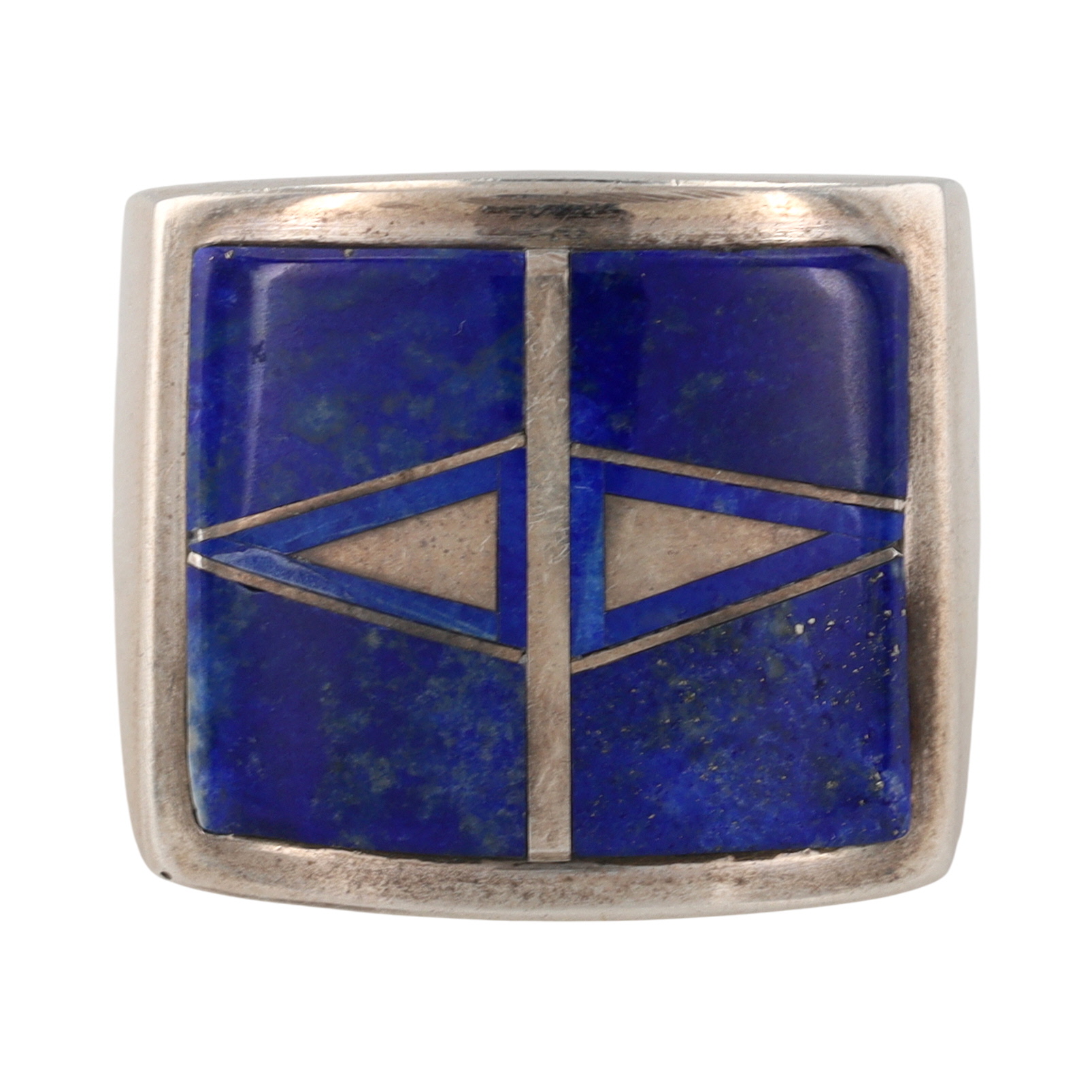 A Navajo sterling silver ring by Terry Gustine, featuring a wide, tapering band and a prominent rectangular face adorned with an intricate stone and metal inlay. The design utilizes deep blue lapis lazuli, exhibiting natural gold flecks, alongside silver-colored metal to create a geometric pattern of a central vertical bar intersected by triangular elements. The interior of the band is stamped with the Touch of Santa Fe shop mark "TSF, " the metal quality mark "STERLING, " and an additional "TG" artist hallmark. An accompanying tag identifies the piece as by "Navajo Artist Terry Gustine, " confirming the materials as "Lapis Stone" and "Sterling Silver."