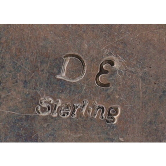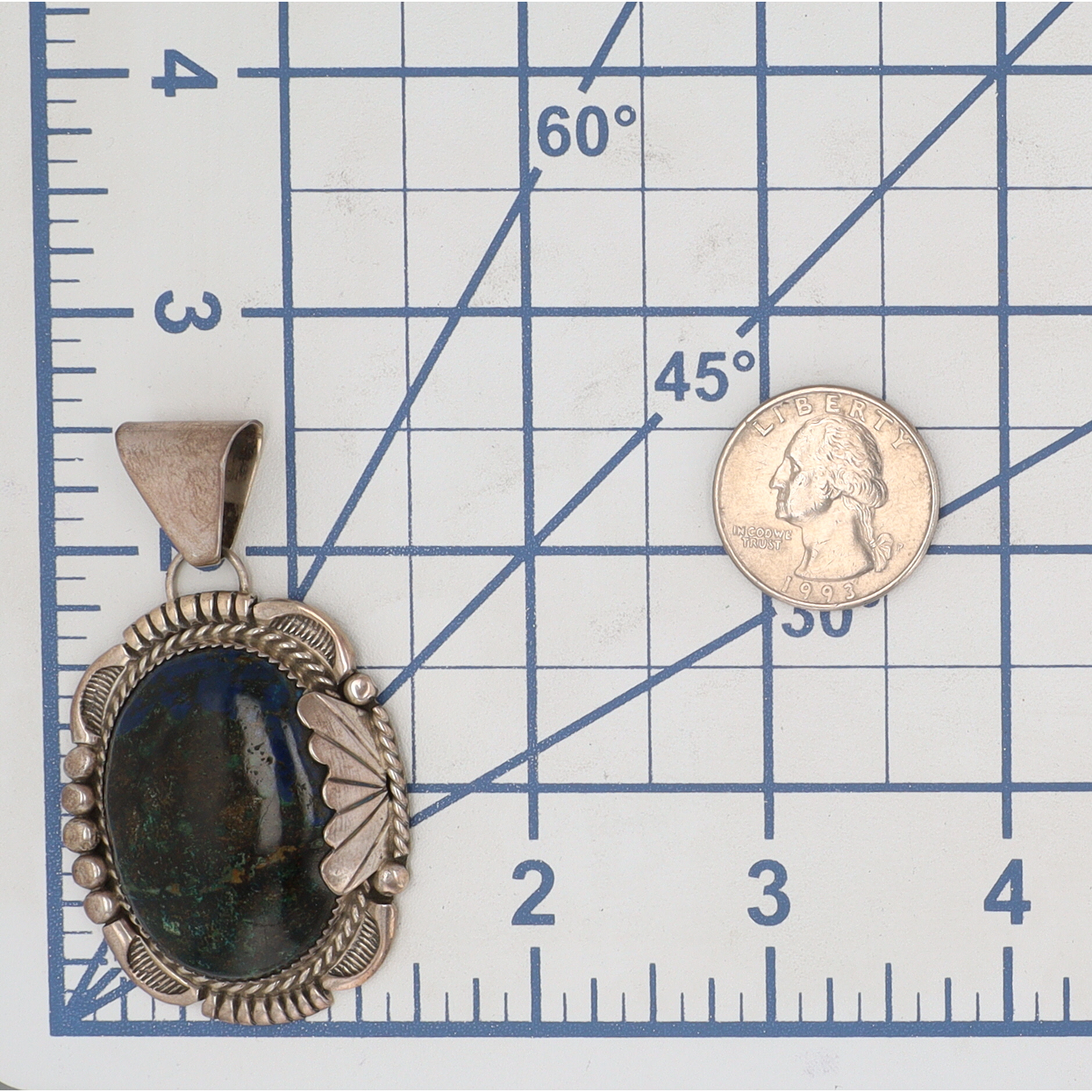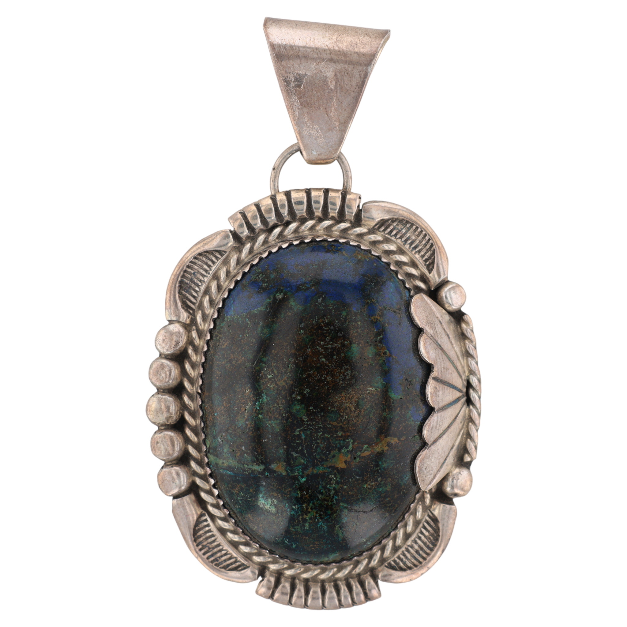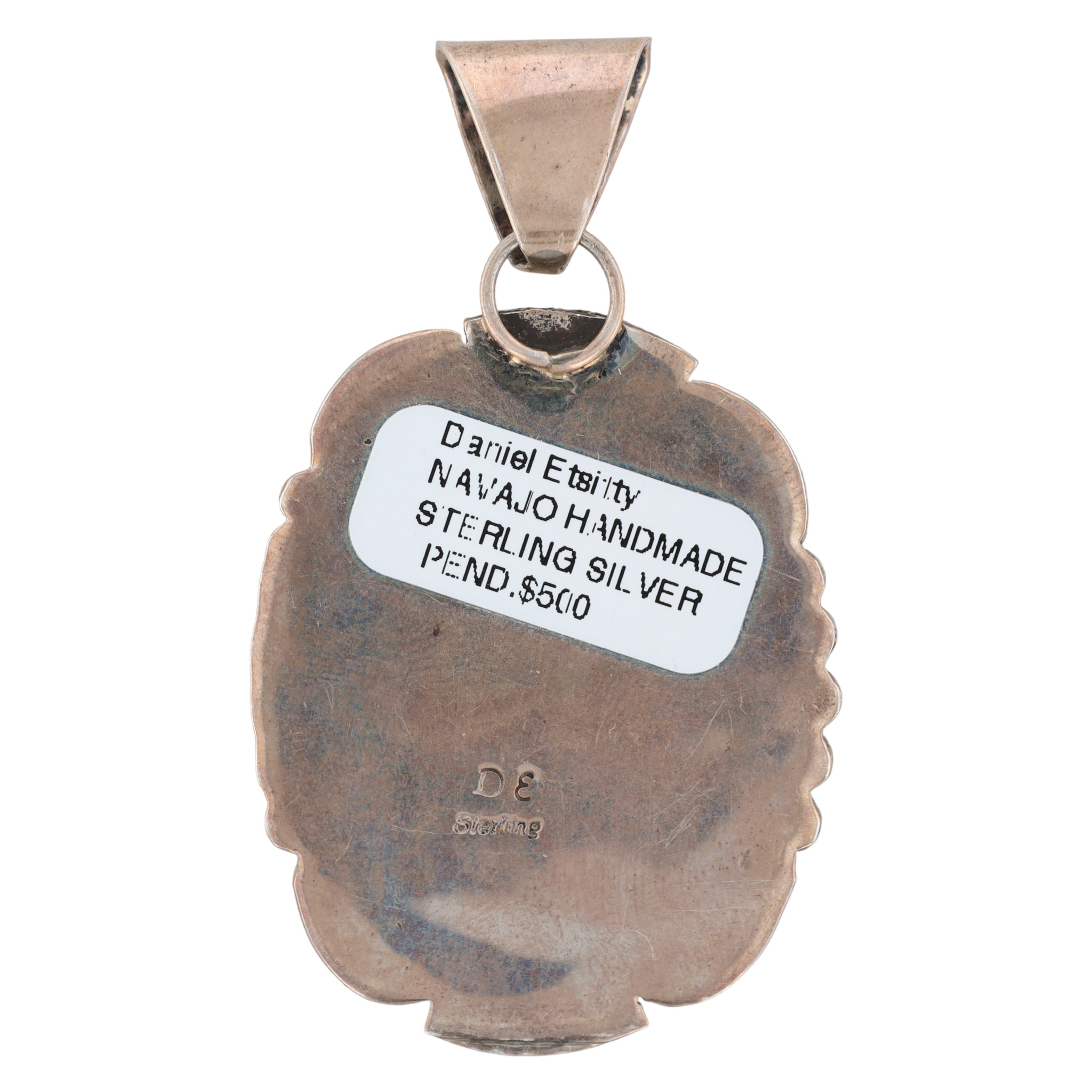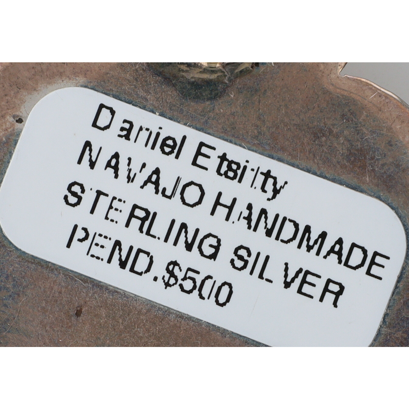 A Navajo sterling silver pendant by Daniel Etsitty featuring a large, oval cabochon stone displaying mottled dark blue and green hues, consistent with azurite-malachite mixtures. The stone is set within a decorative bezel, and the silverwork includes twisted rope detailing, applied spherical elements, and stamped fan-like motifs on the sides. The reverse of the pendant bears an adhesive label identifying the maker as "Daniel Etbitty", stating "NAVAJO HANDMADE" and "STERLING SILVER". Below the label, stamped hallmarks "DE" and "Sterling" are visible.