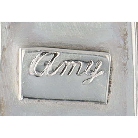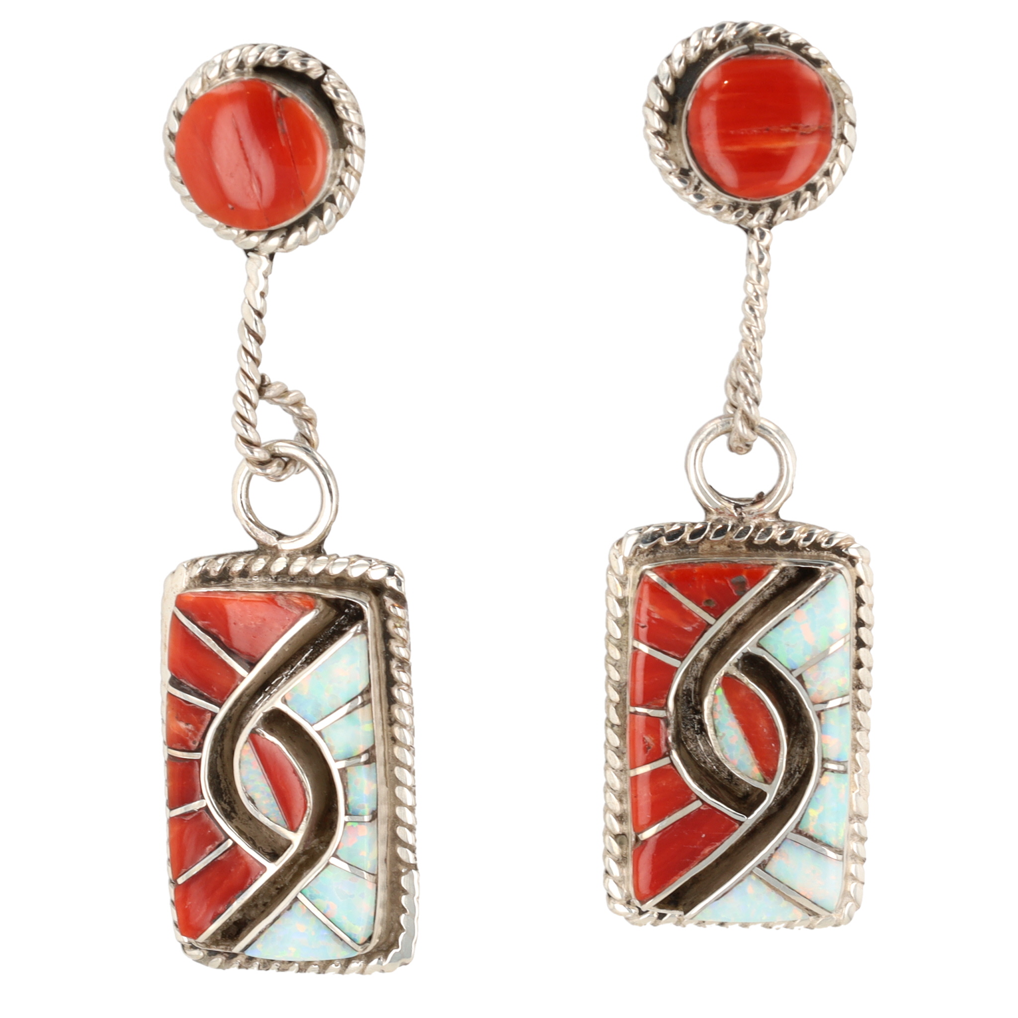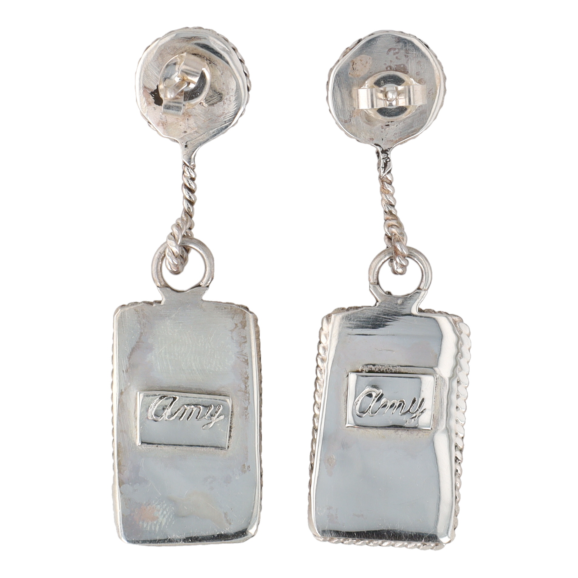 A pair of Zuni sterling silver dangle earrings by Amy Locaspino. Each earring features a circular stud top set with a polished red cabochon stone, connected via a twisted rope link to a rectangular dangle. The rectangular dangles showcase intricate mosaic inlay, composed of fitted pieces of coral, opal, and dark shadow oxidized separators, arranged in a curvilinear pattern. The metalwork incorporates twisted rope details around the bezels. The reverse of each rectangular dangle bears a raised rectangular plaque with the script signature "Amy."