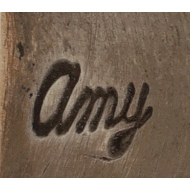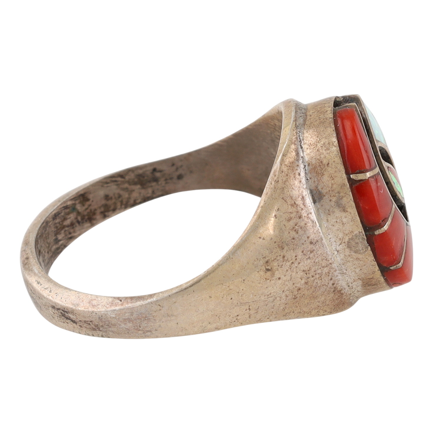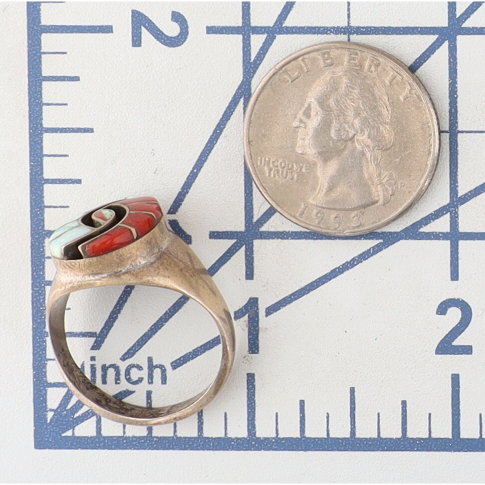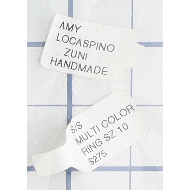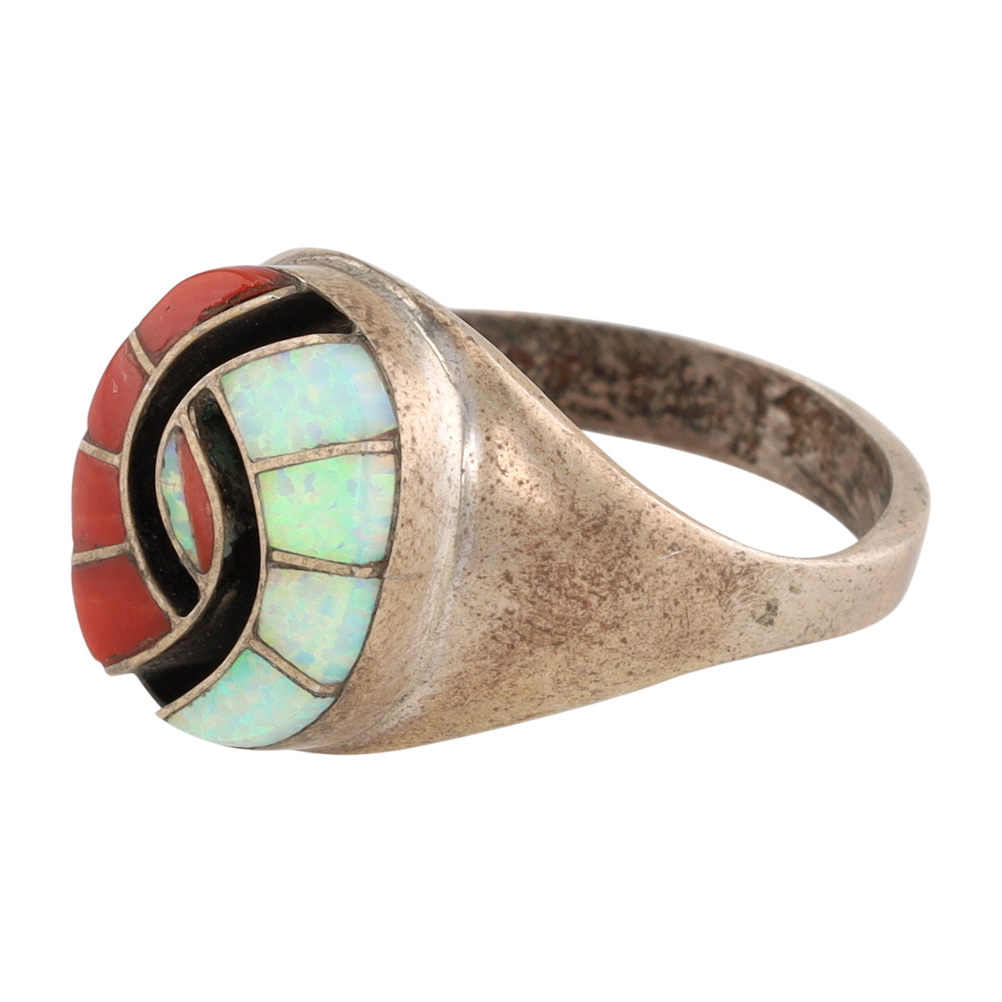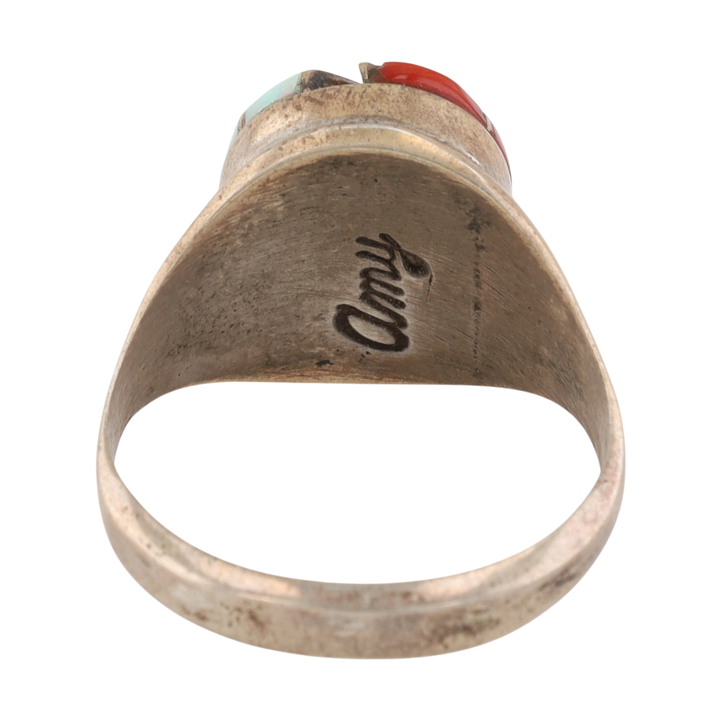 A Zuni Native American sterling silver ring by Amy Locaspino. The ring features an oval-shaped bezel with a multi-stone inlay design. The inlay consists of precisely cut pieces of red coral, black oxidized channel, and iridescent white opal, arranged in a stylized, swirling pattern. The interior of the band is visibly marked with the script signature "Amy".