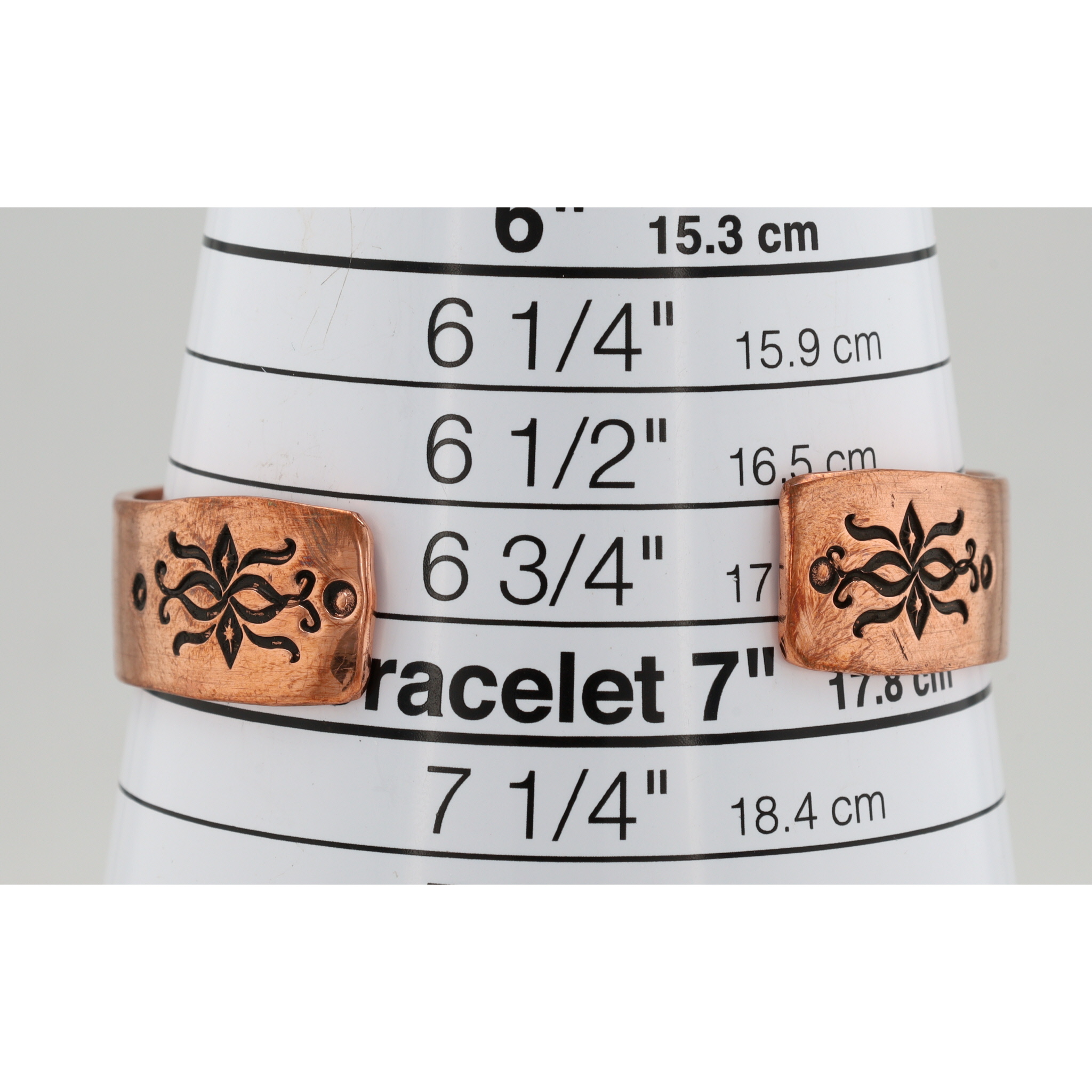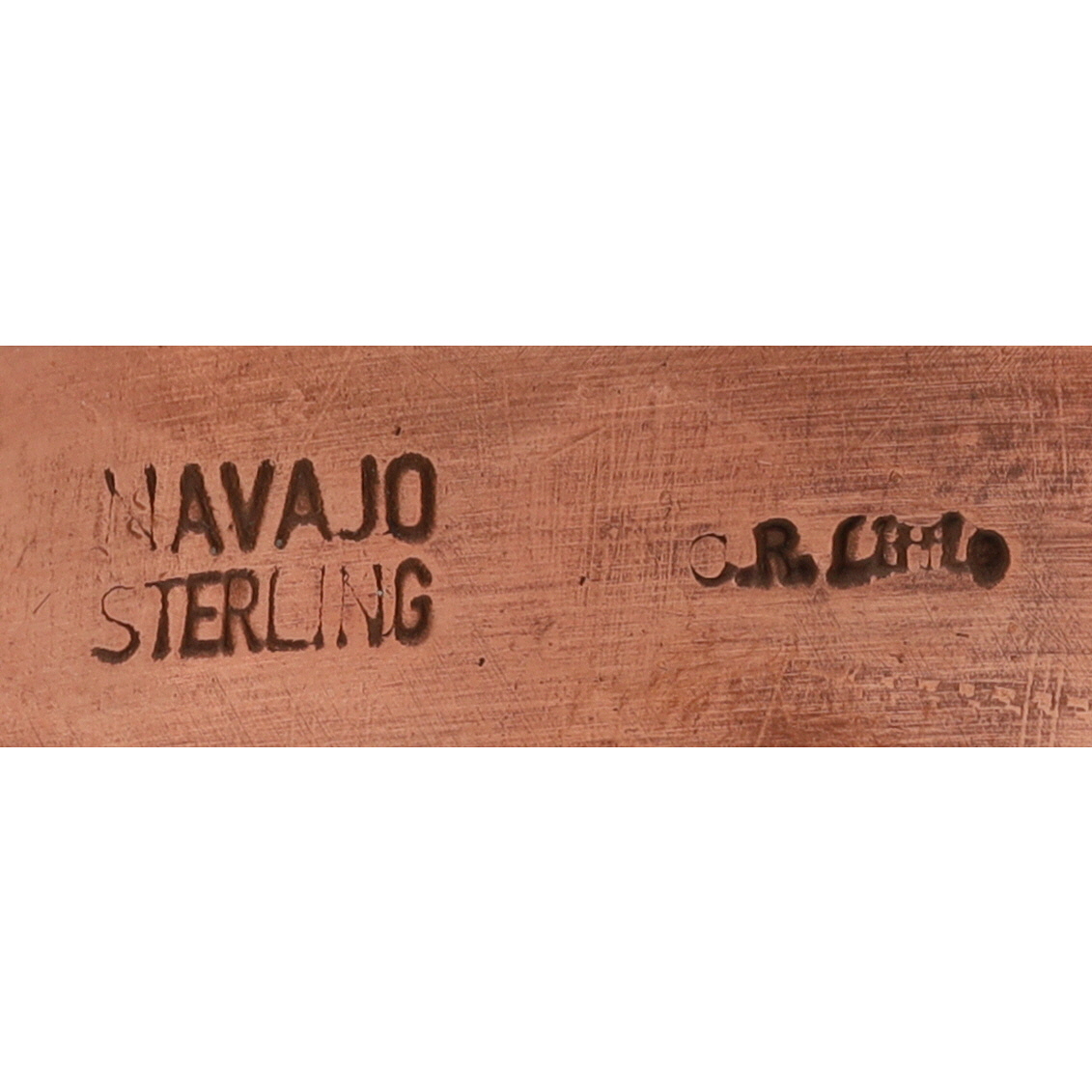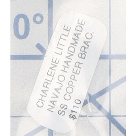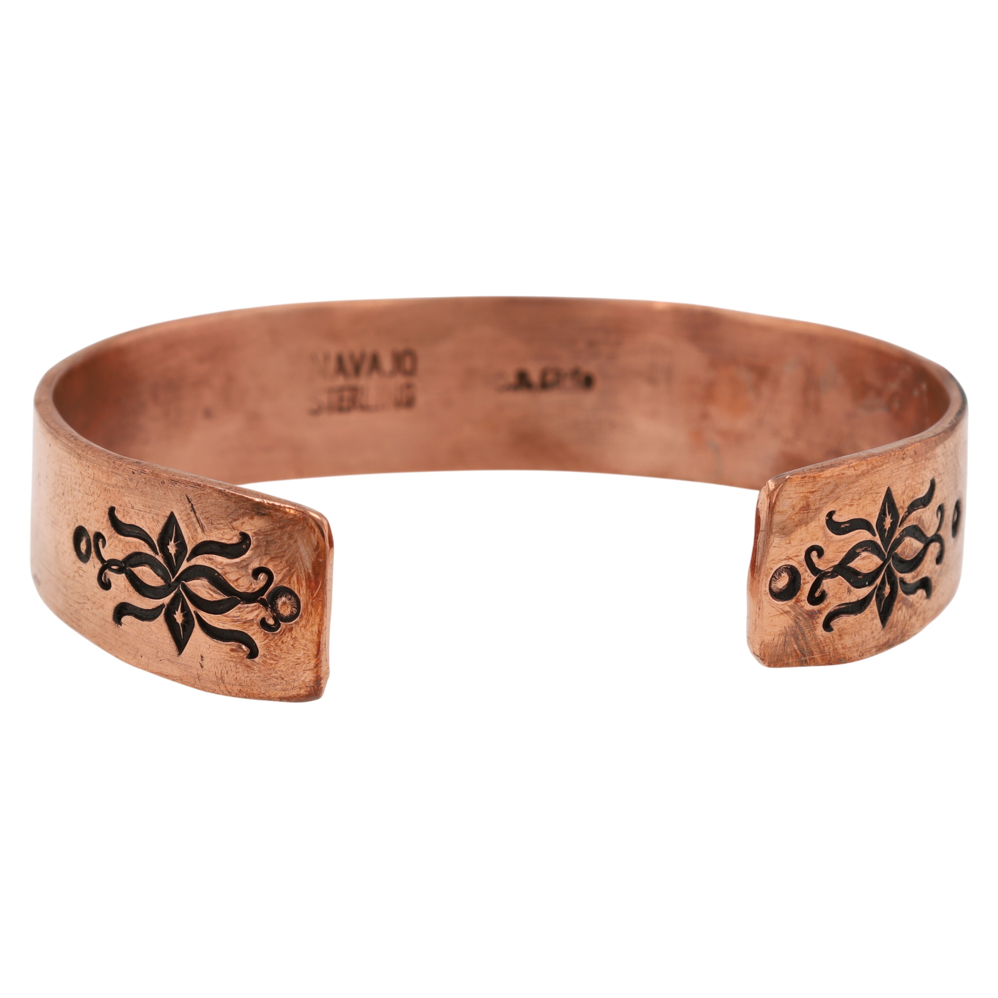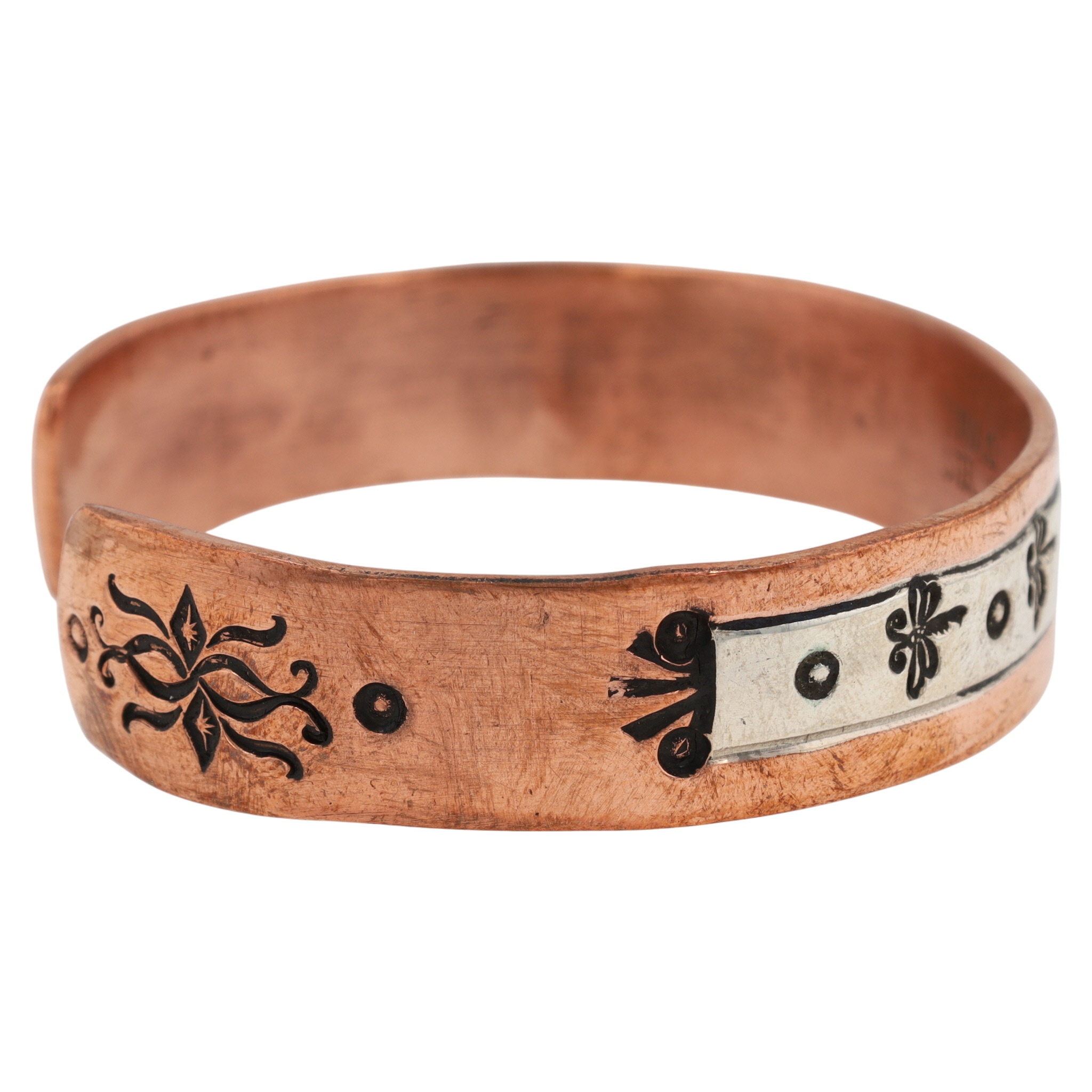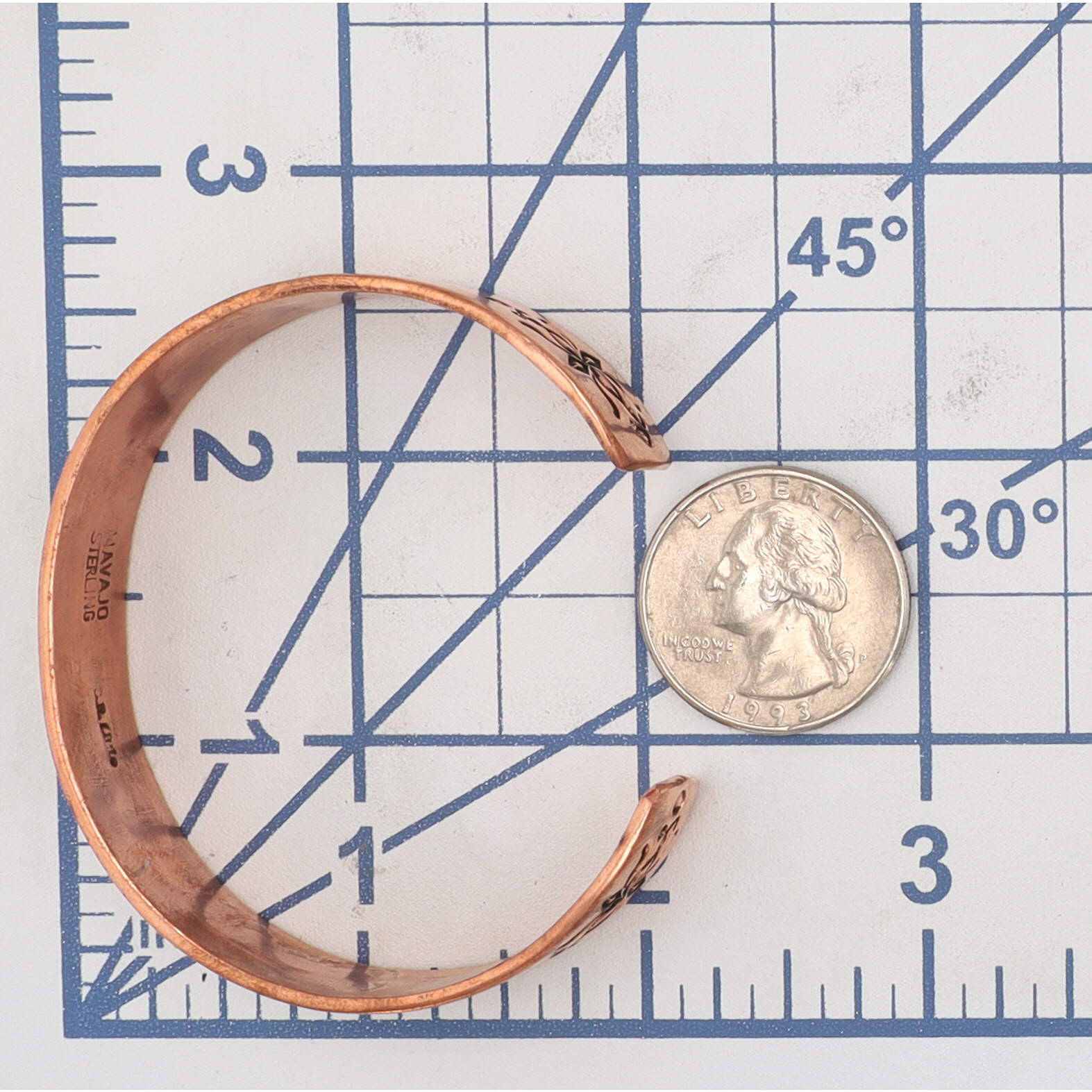 A Navajo sterling silver and copper cuff bracelet by Charlene R. Little. The bracelet features a central applied band of sterling silver, decorated with regularly spaced, stylized dragonfly motifs alternating with small circular dots. The copper ends display an engraved or stamped floral scroll pattern. The interior of the copper cuff is stamped "NAVAJO STERLING" and with the artisan’s mark "C.R. Little."