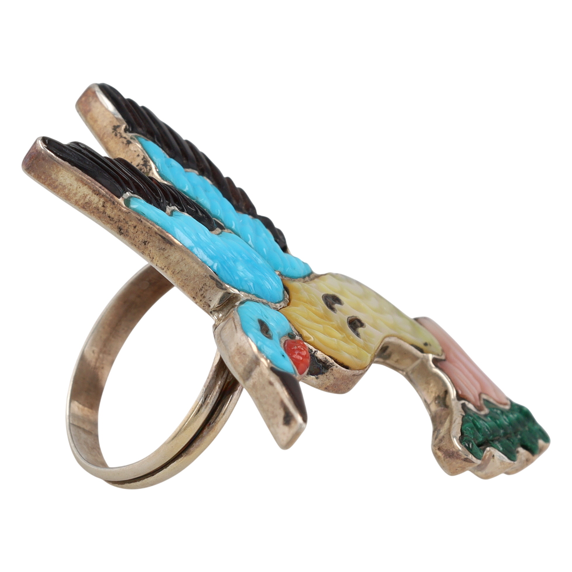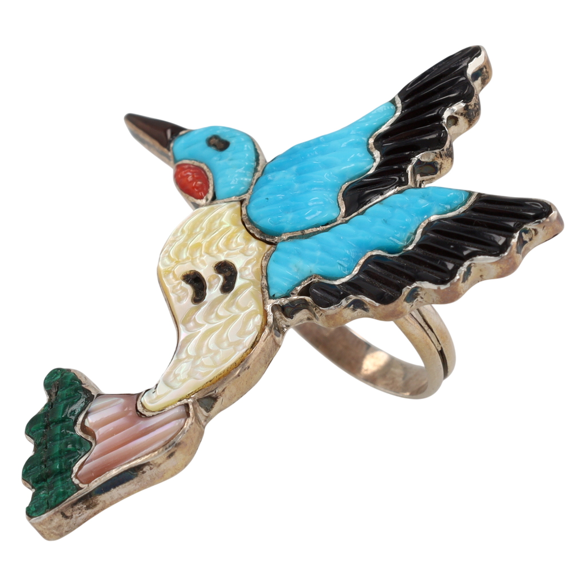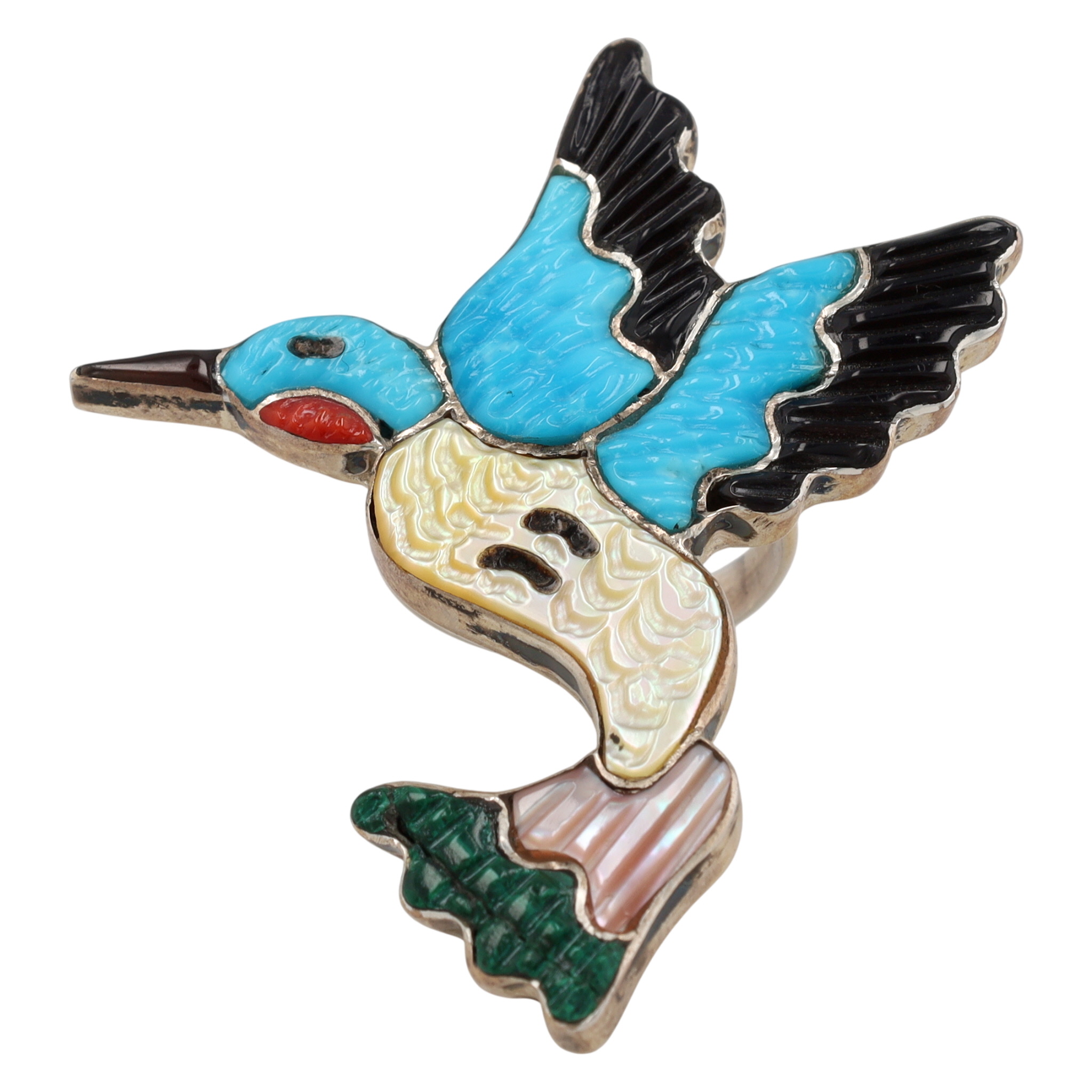 A contemporary Zuni sterling silver multi-stone inlay ring by Tamara Pinto, depicting a hummingbird in flight. The detailed design features precisely cut and fitted inlaid materials, including bright blue turquoise, black onyx, iridescent white mother-of-pearl, red coral, and a dark green malachite. The reverse of the silver setting is etched with the signature ‘TAMARA PINTO ZUNI’.