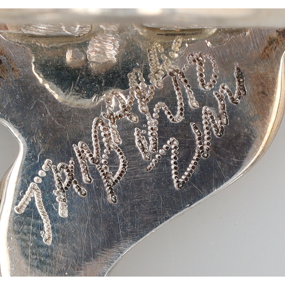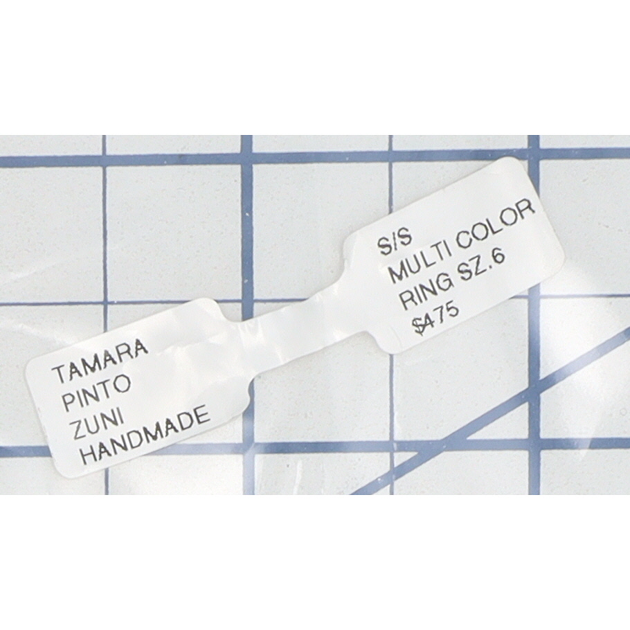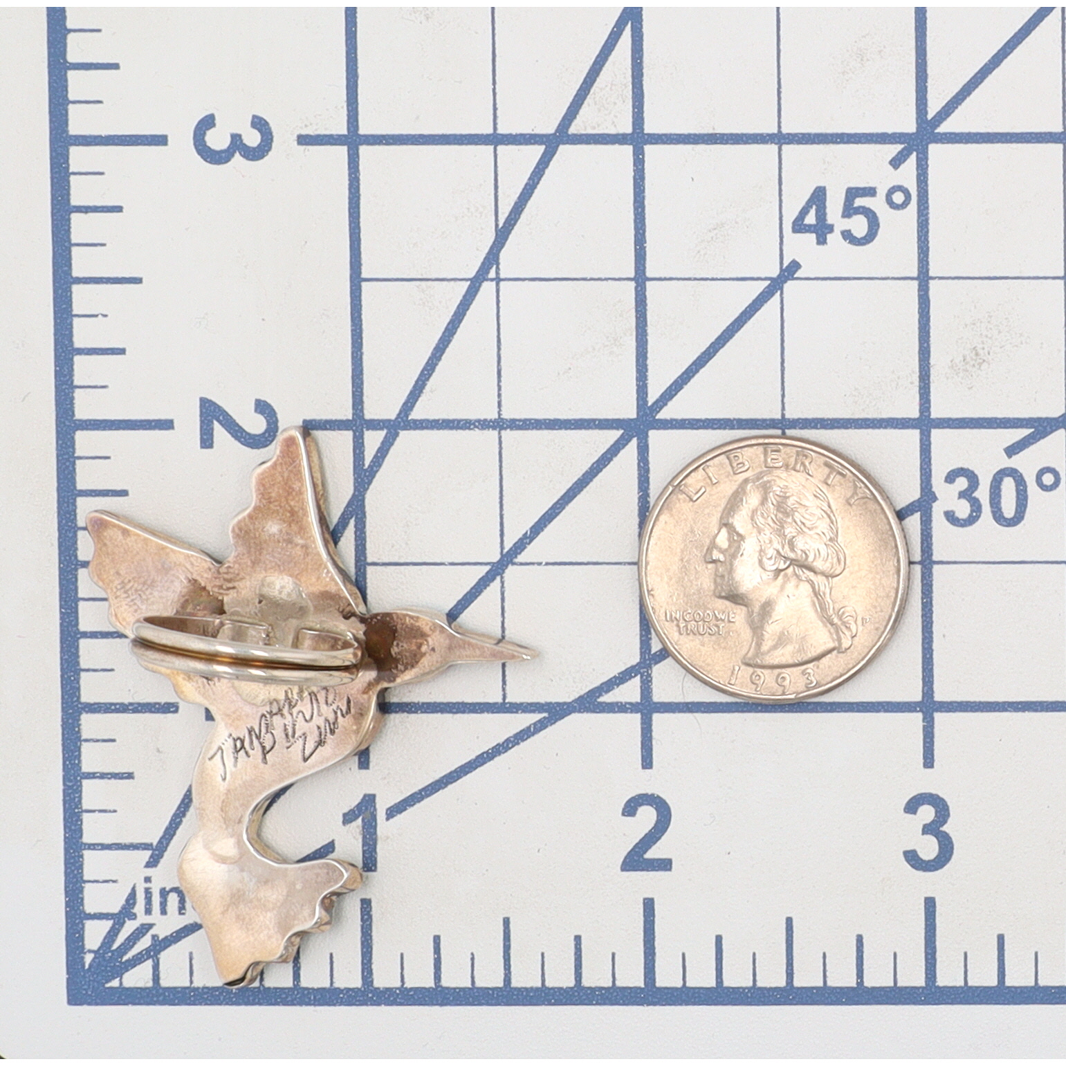 A contemporary Zuni sterling silver multi-stone inlay ring by Tamara Pinto, depicting a hummingbird in flight. The detailed design features precisely cut and fitted inlaid materials, including bright blue turquoise, black onyx, iridescent white mother-of-pearl, red coral, and a dark green malachite. The reverse of the silver setting is etched with the signature ‘TAMARA PINTO ZUNI’.