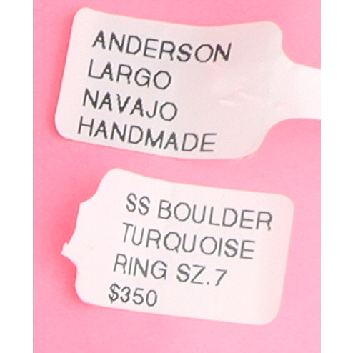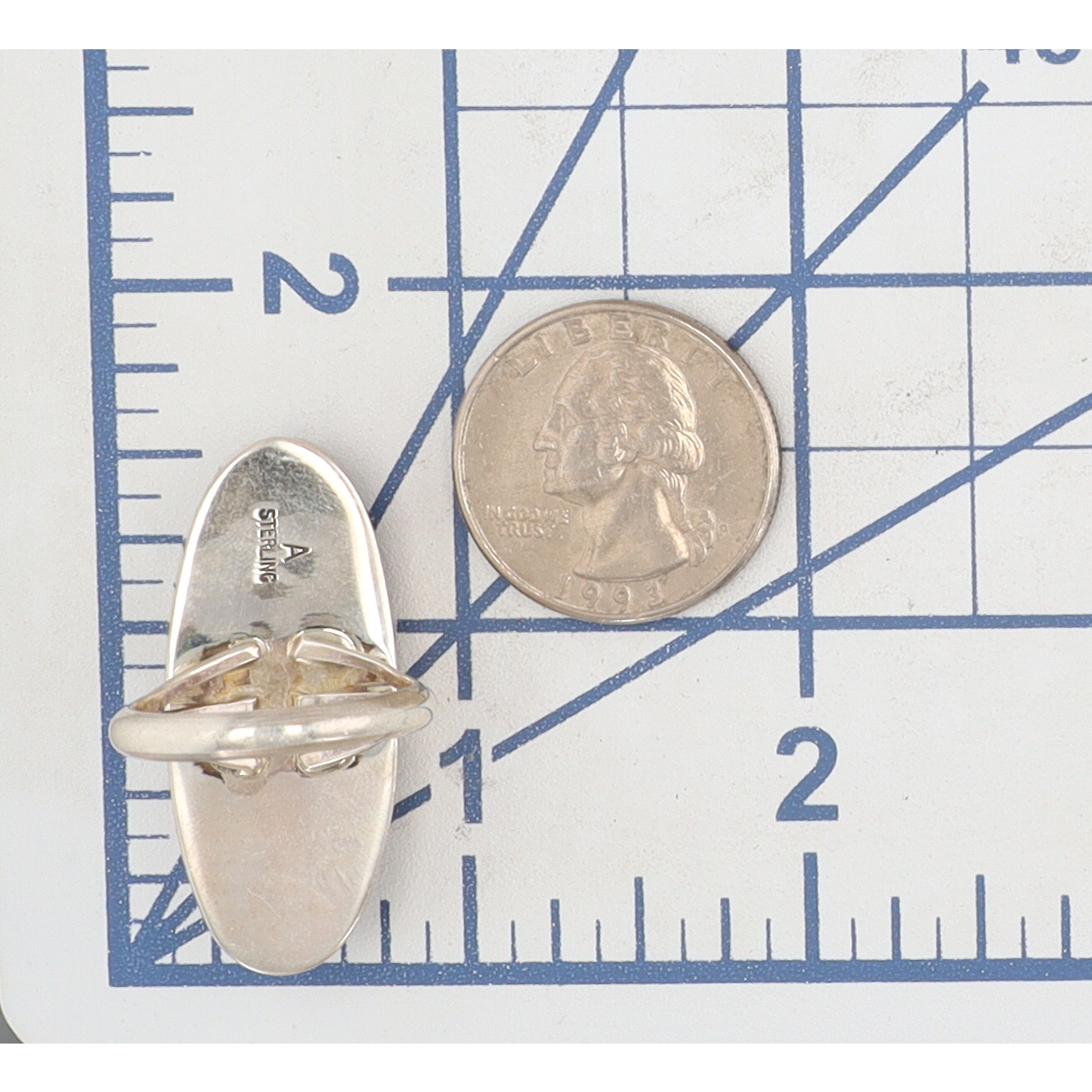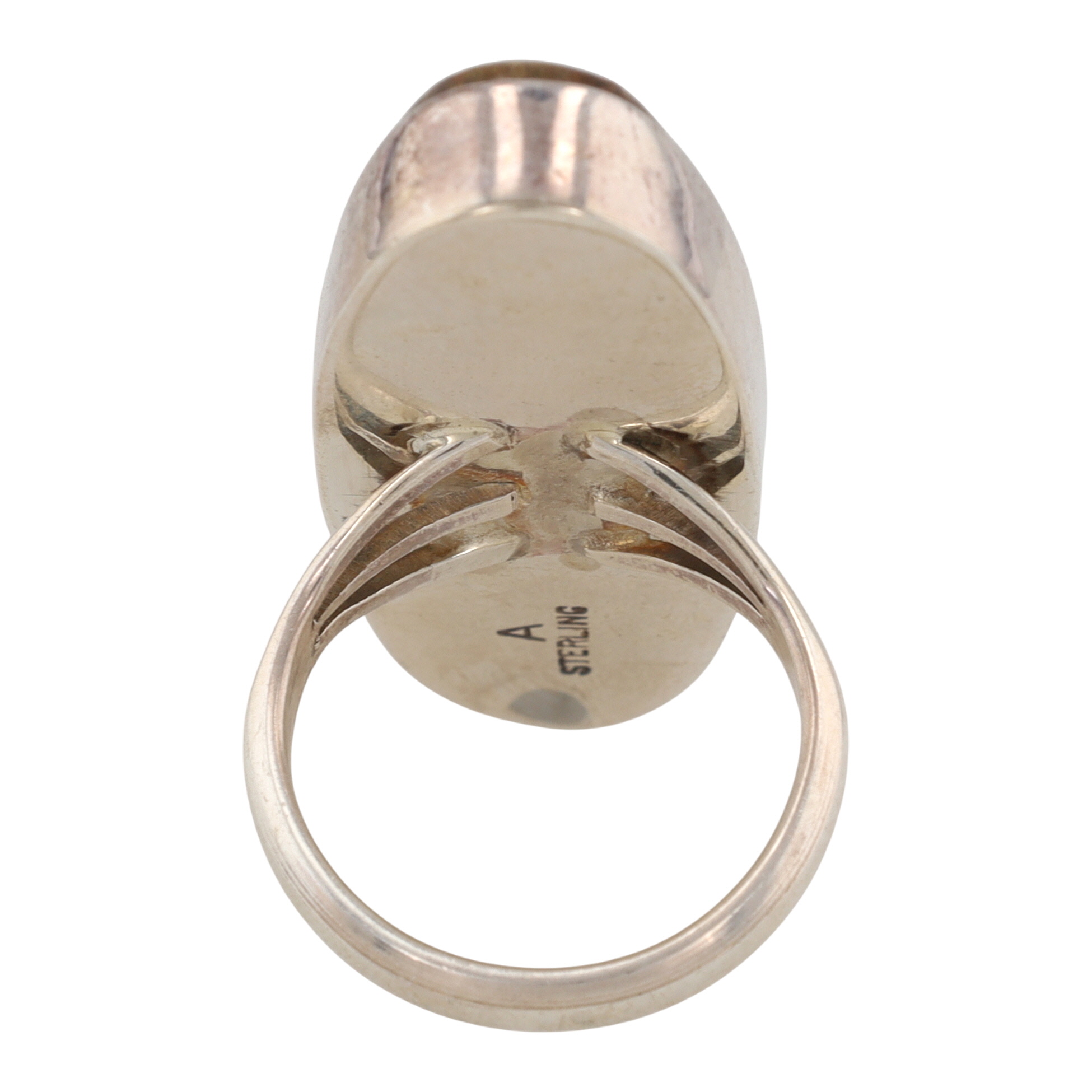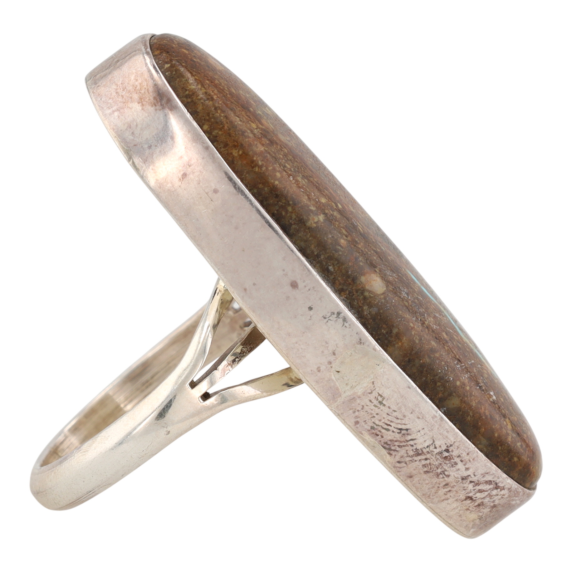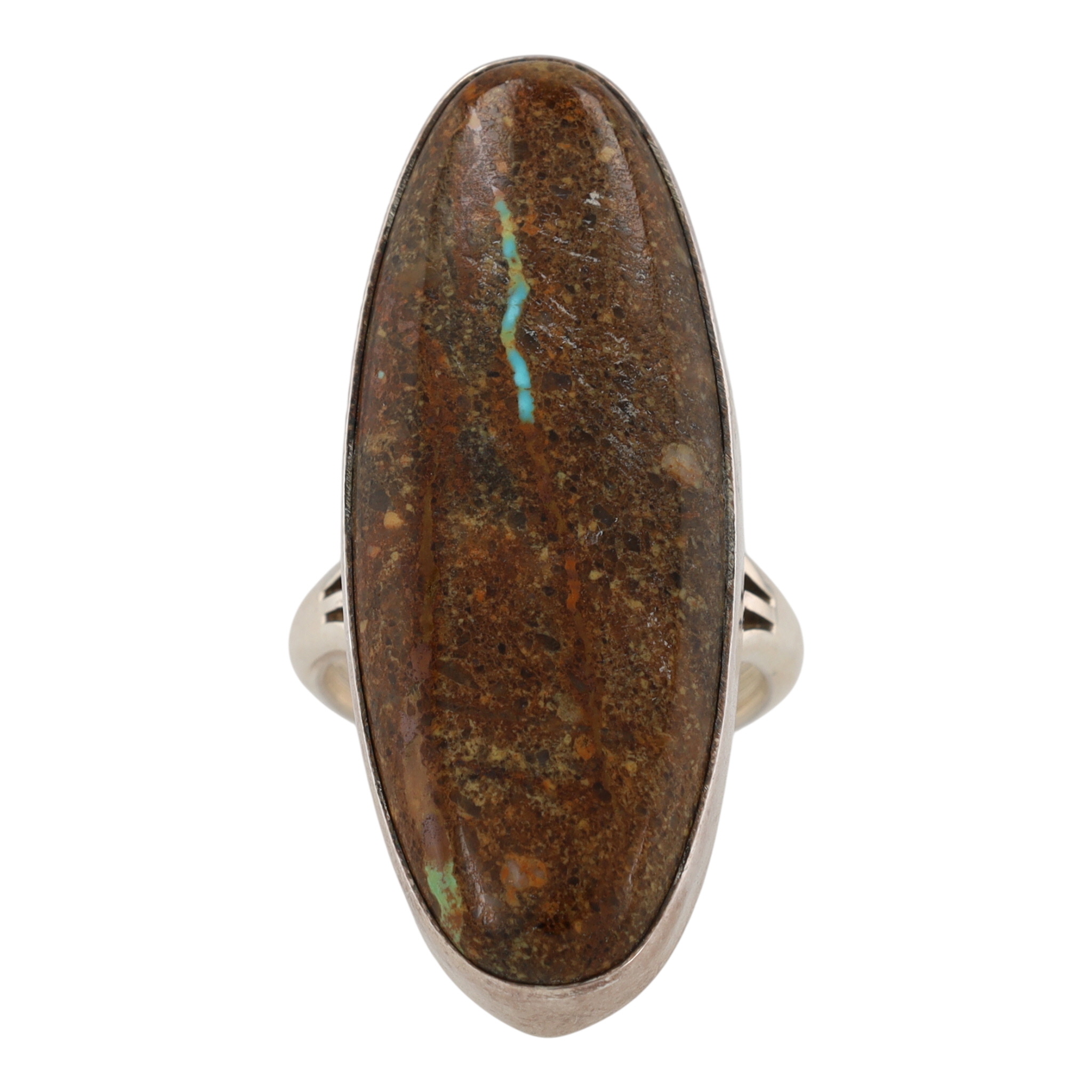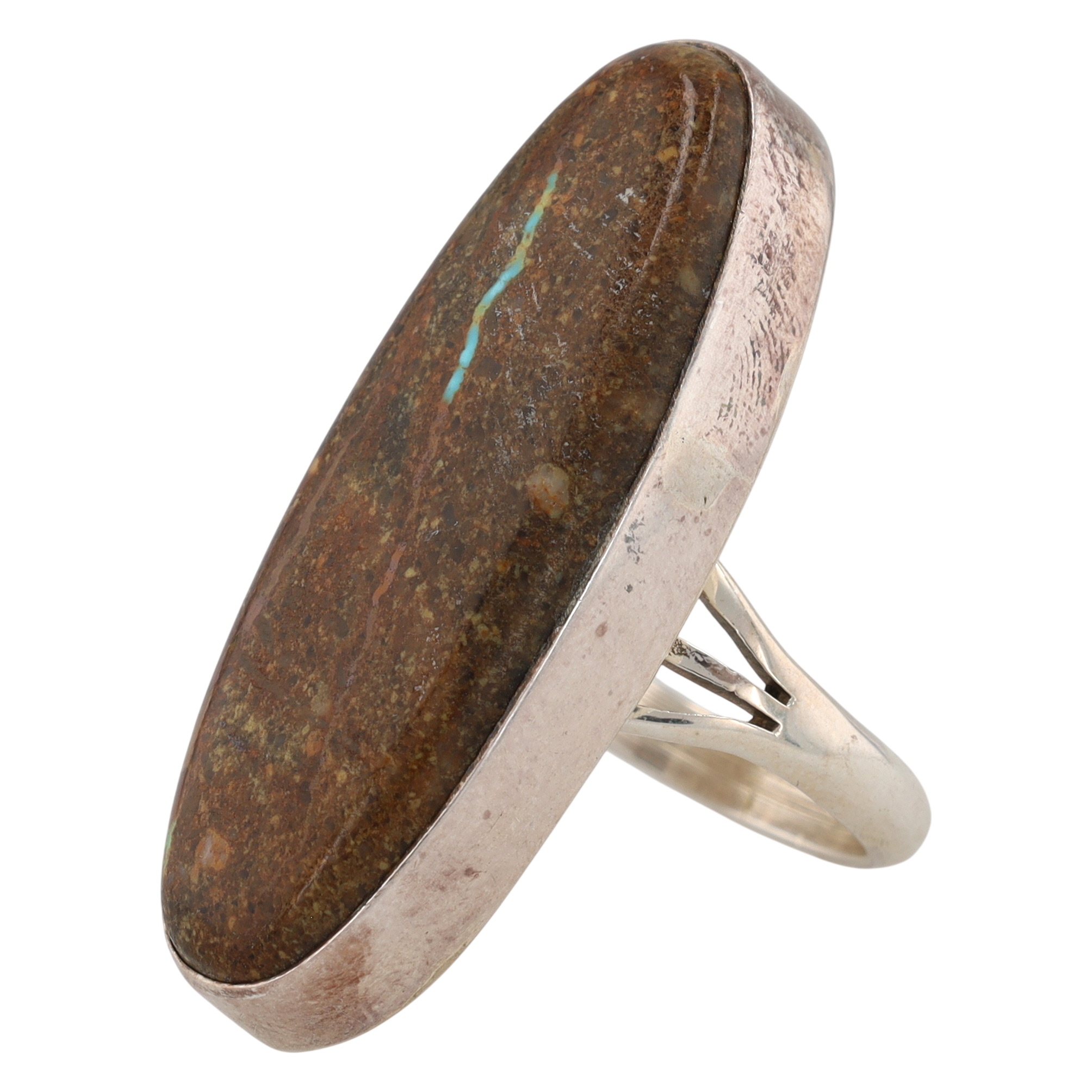 Anderson Largo Navajo sterling silver finger ring featuring a large, elongated oval-shaped cabochon boulder turquoise. The prominent stone is predominantly a mottled reddish-brown color, exhibiting distinct veins and patches of bright greenish-blue turquoise. It is set within a plain bezel with a simple, split-shank band. The reverse of the bezel is stamped with the marks "A" and "STERLING."