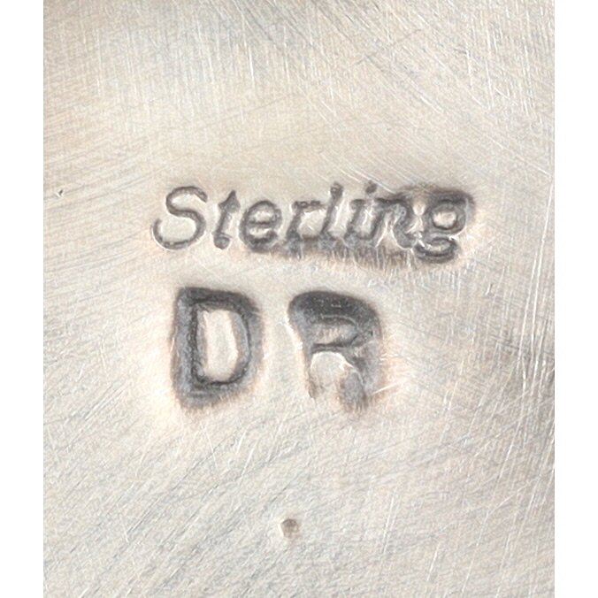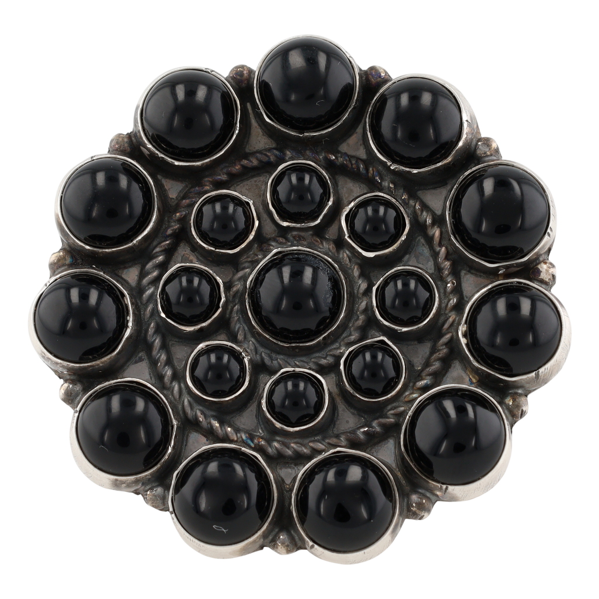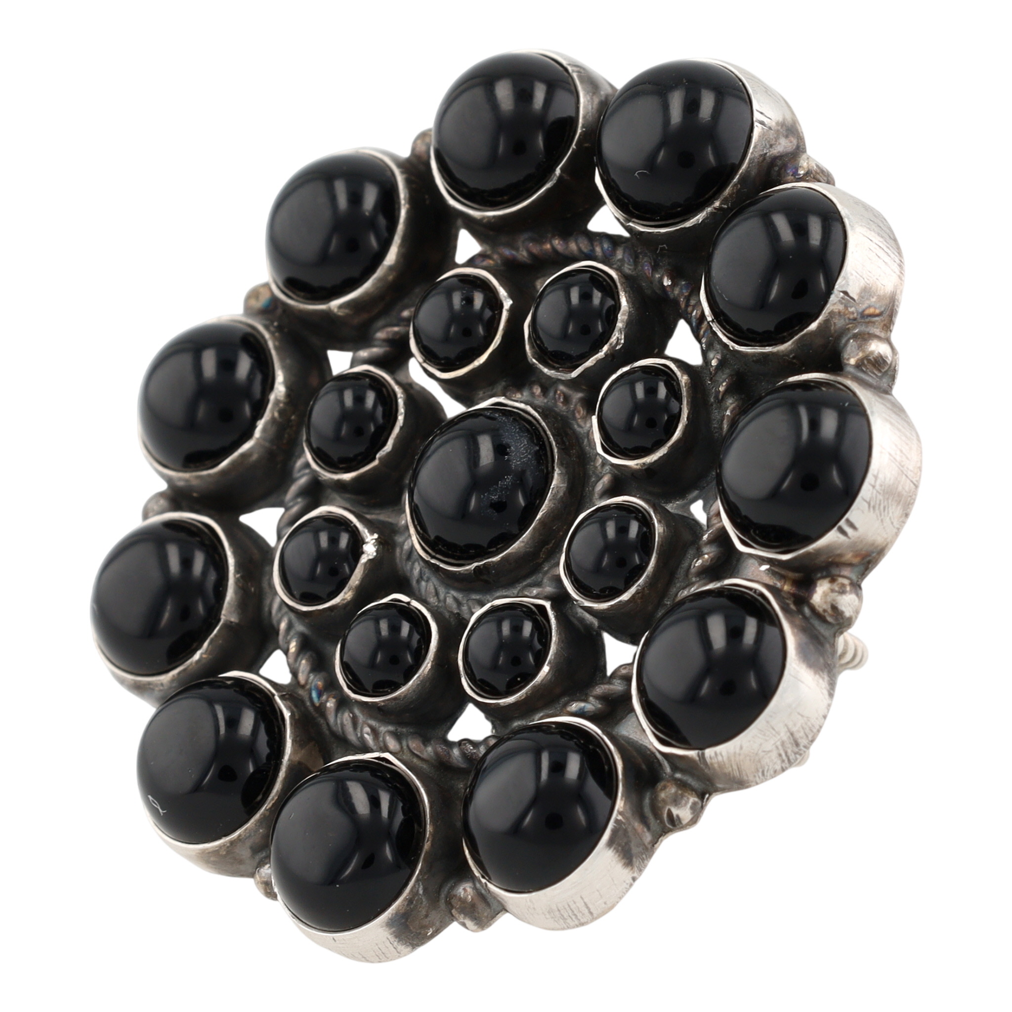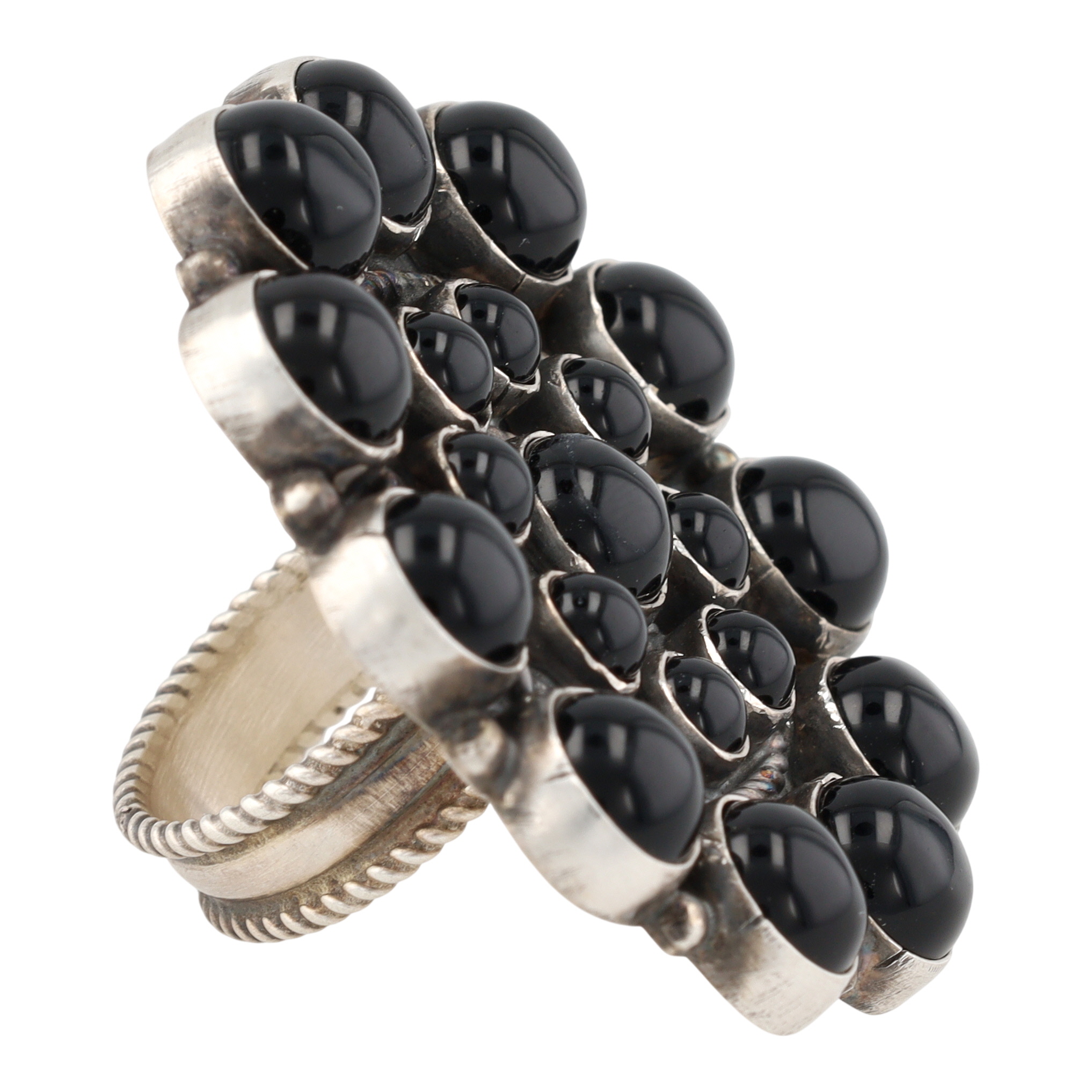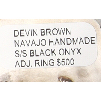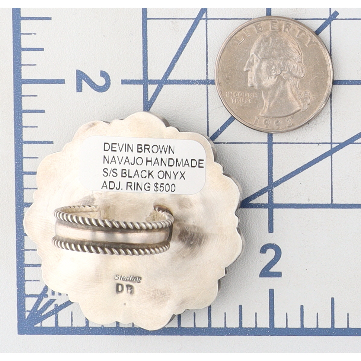 A Navajo sterling silver and black onyx cluster adjustable ring by Devin Brown. This large, circular cluster-style finger ring features a central round black onyx cabochon, surrounded by two concentric rings of smaller, similarly domed black onyx stones, all individually bezel-set. The silver setting incorporates twisted wire details around the stone clusters and on the adjustable, double-banded shank. The reverse of the ring is stamped "Sterling" and "DB". An adhesive label on the reverse identifies the item as "DEVIN BROWN NAVAJO HANDMADE S/S BLACK ONYX ADJ. RING $500".