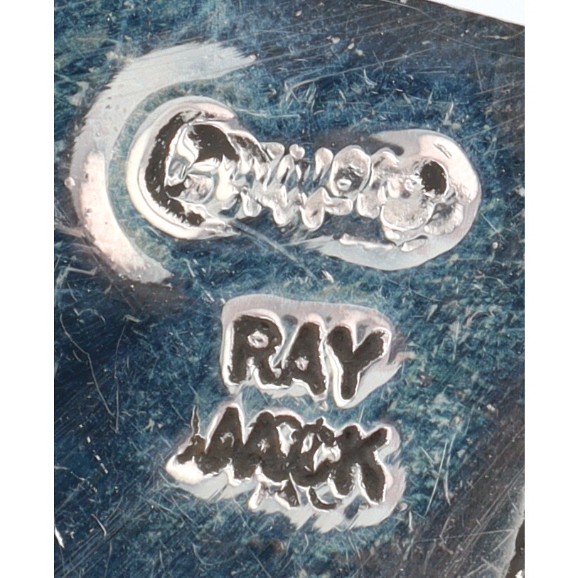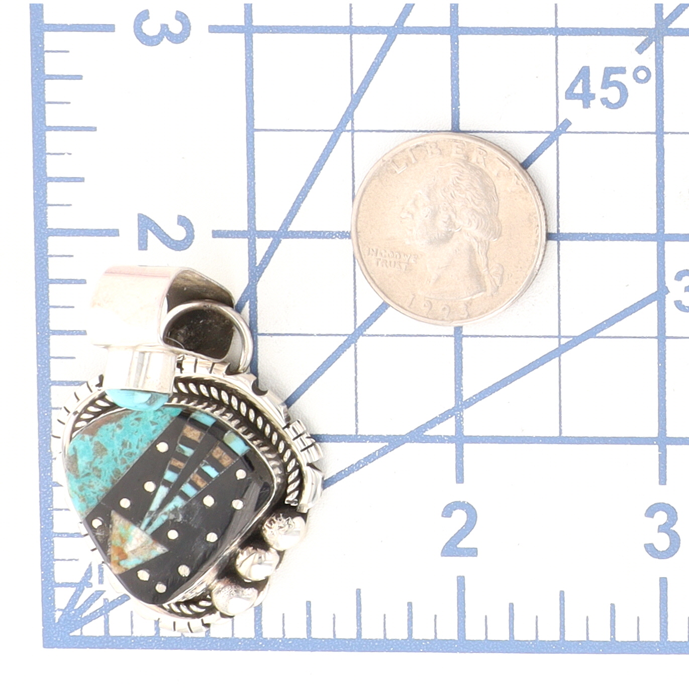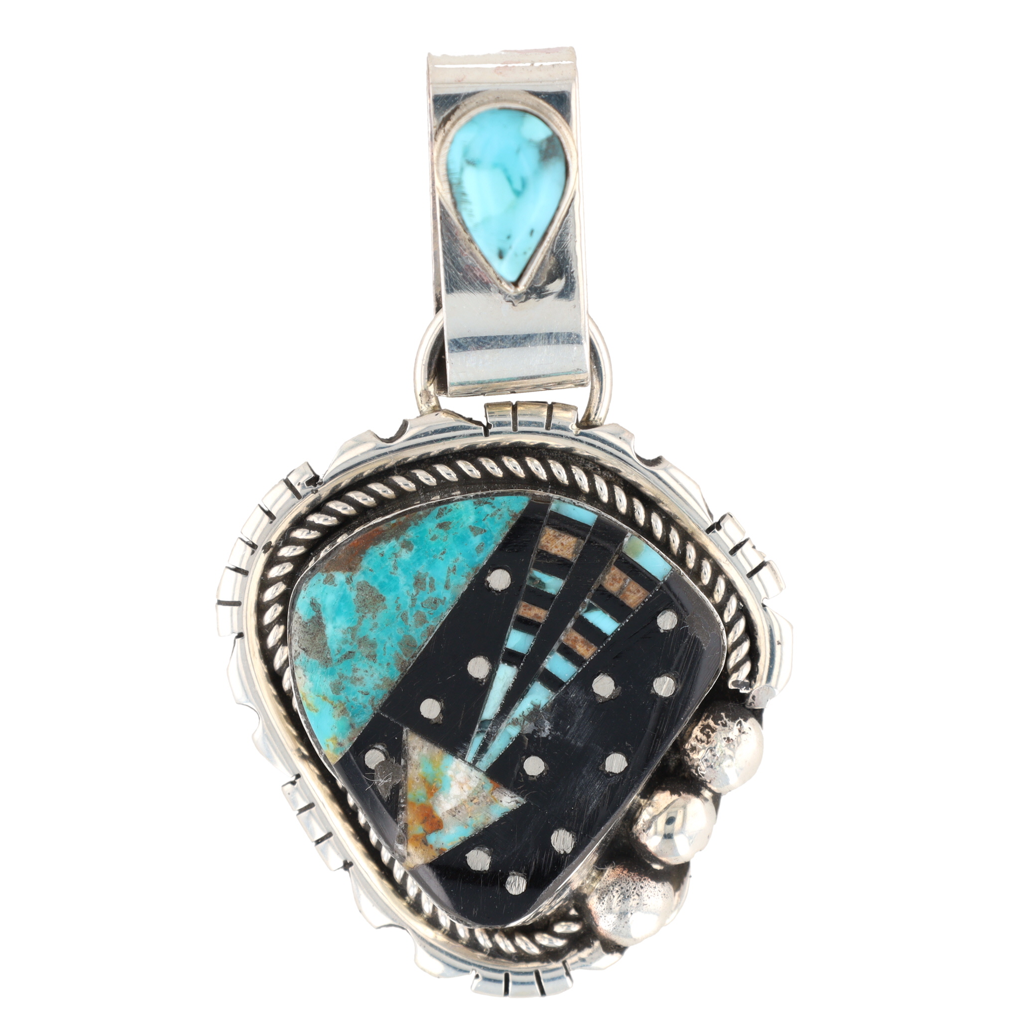 A Navajo sterling silver pendant by Ray Jack, featuring a multi-stone inlay design. The irregularly shaped primary body has a scalloped edge and is adorned with geometric patterns fashioned from various shades of turquoise, onyx, and picture jasper stone segments. The main body is framed by a twisted rope border and features three applied sterling silver spheres on one side. A fixed bail, embellished with a single teardrop-shaped turquoise cabochon, is attached to the top. The reverse of the pendant is visibly stamped "RAY JACK" and a second, less distinct mark, for sterling silver.