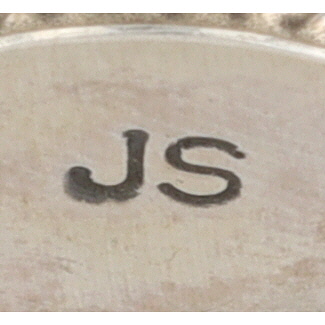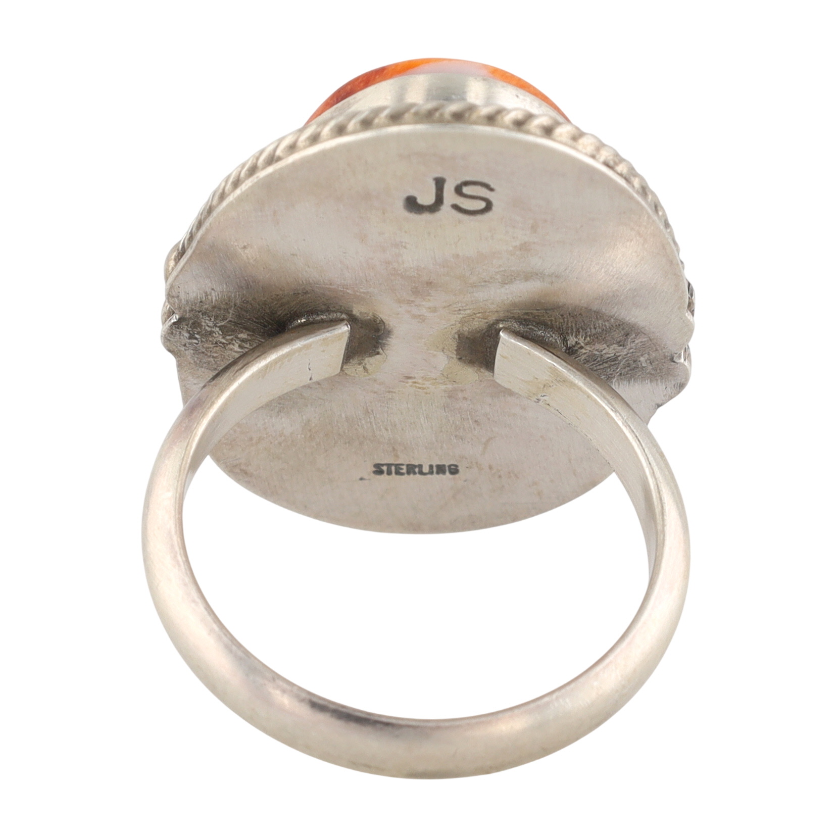 A Navajo sterling silver finger ring by John Skeets, featuring a prominent oval, bezel-set cabochon stone of reddish-orange with white and cream variegations, visually consistent with spiny oyster. The stone is framed by a twisted wire border and accented with four small silver domes or beads, indicative of Navajo artisan jewelry style. The reverse of the ring’s head is stamped with the initials "JS" and the word "STERLING."