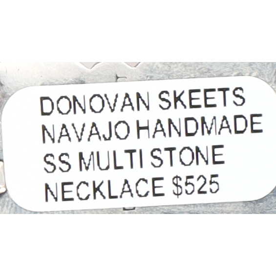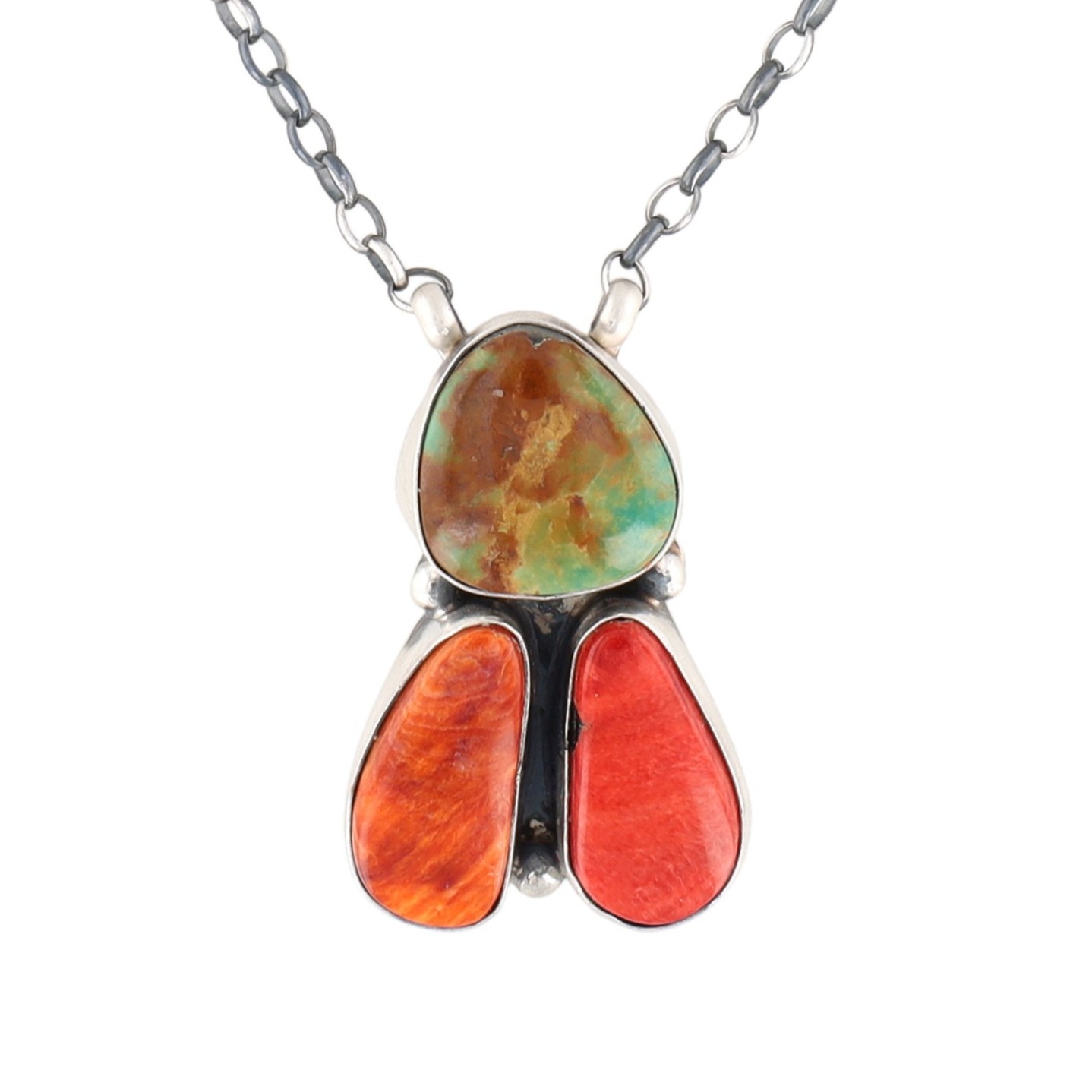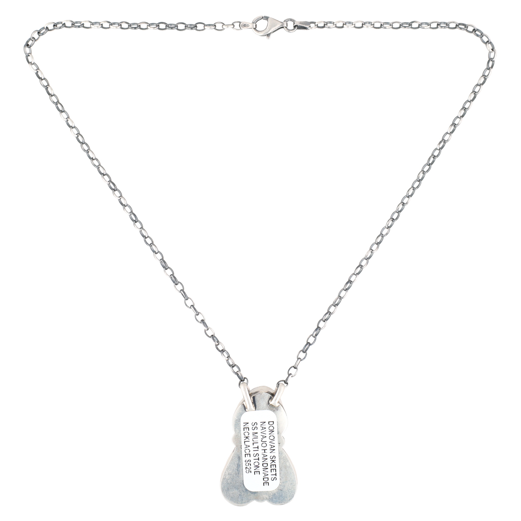 This Navajo sterling silver necklace features a multi-stone pendant by Donovan Skeets, is composed of three bezel-set cabochon stones: one larger, variegated turquoise and spiny oyster. The rolo chain includes a lobster clasp marked "925" on the connecting rings. The reverse of the pendant is stamped "STERLING" and "DONOVAN SKEET". An accompanying retail tag further details it as a "DONOVAN SKEETS NAVAJO HANDMADE SS MULTI STONE NECKLACE".