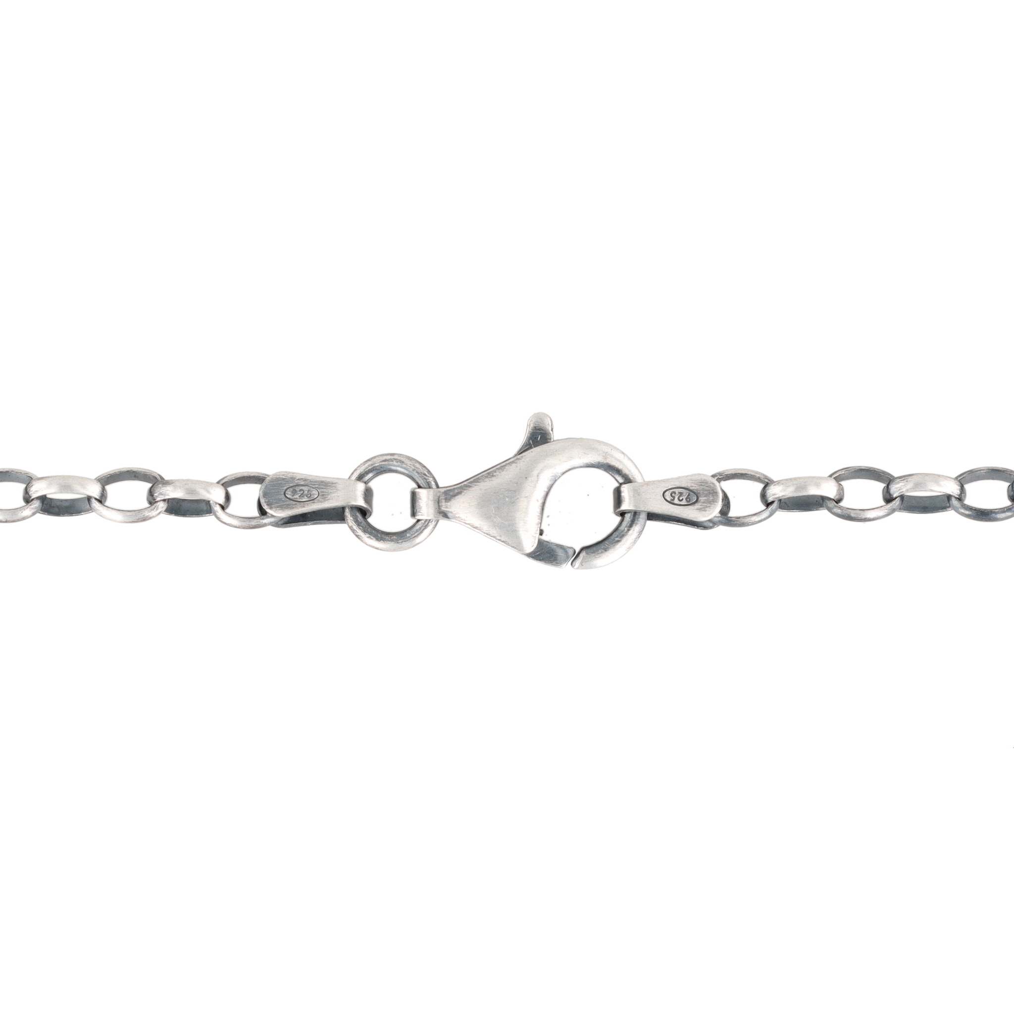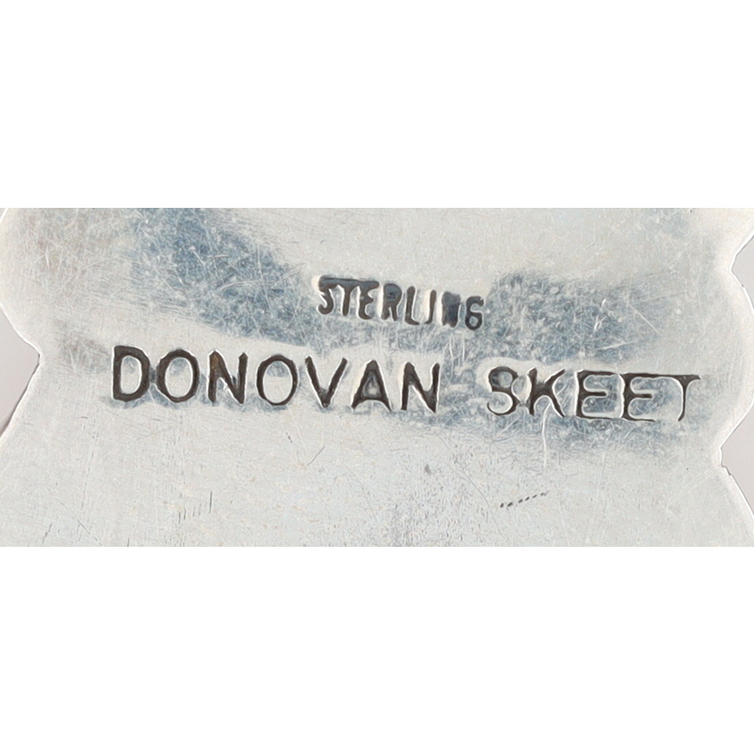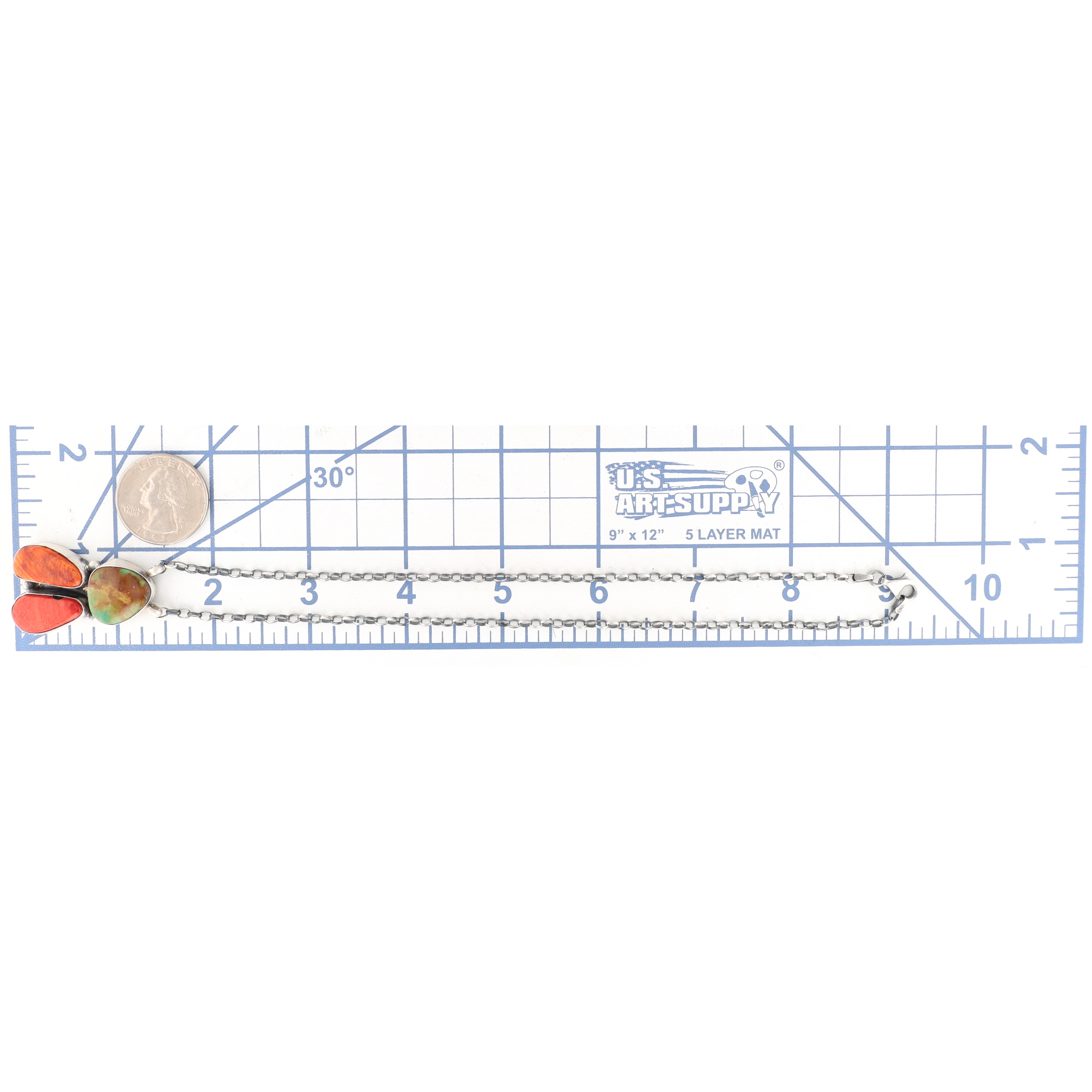 This Navajo sterling silver necklace features a multi-stone pendant by Donovan Skeets, is composed of three bezel-set cabochon stones: one larger, variegated turquoise and spiny oyster. The rolo chain includes a lobster clasp marked "925" on the connecting rings. The reverse of the pendant is stamped "STERLING" and "DONOVAN SKEET". An accompanying retail tag further details it as a "DONOVAN SKEETS NAVAJO HANDMADE SS MULTI STONE NECKLACE".