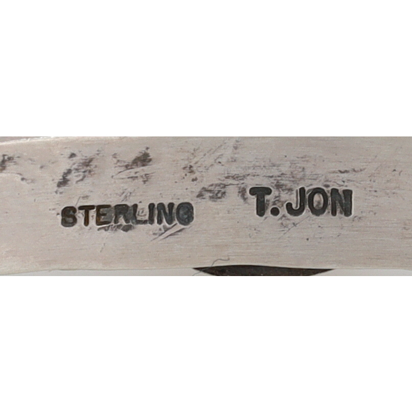 A Navajo sterling silver cuff bracelet by Tillie Jon, featuring a central oval cabochon Sonoran Gold turquoise stone. The stone exhibits a mottled blue-green hue with visible brown matrix, set in a plain bezel. The bracelet band is embellished with linear and radial stamped motifs, enhanced by darkened oxidation. The interior of the cuff is stamped "STERLING" and "T. JON." An attached tag identifies the piece as "TILLIE JON NAVAJO HANDMADE SS SONORAN GOLD BRACELET."