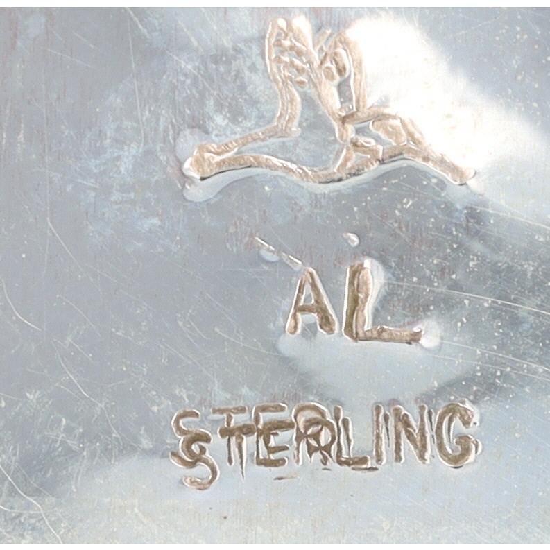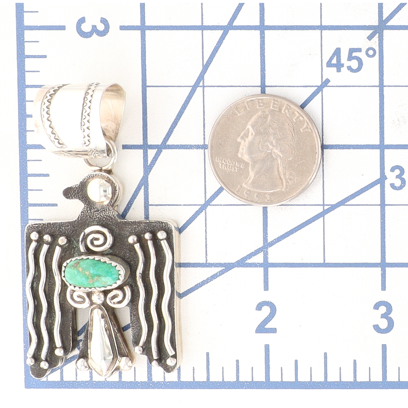 A sterling silver pendant crafted in the form of a stylized thunderbird, featuring an oval turquoise cabochon centrally set within the chest area. The silver exhibits an oxidized finish with stamped and applied decorative elements, including scrolls, lines, and small beads. The pendant is suspended from a decorated bail. Visible markings on the reverse include "STERLING, " the artist’s initials "AL, " and a pictorial mark resembling a stylized bighorn sheep. A white label affixed to the back identifies the piece as "NAVAJO HANDMADE" by "ALLEN LEE" and specifies "SS KINGMAN TURQ."