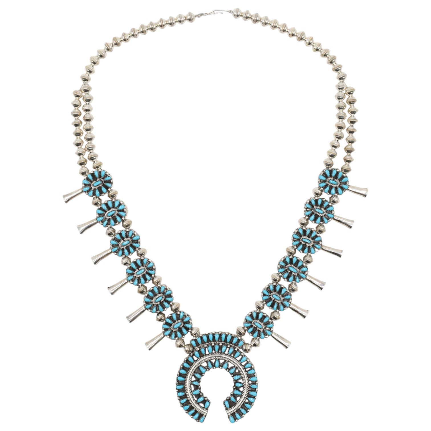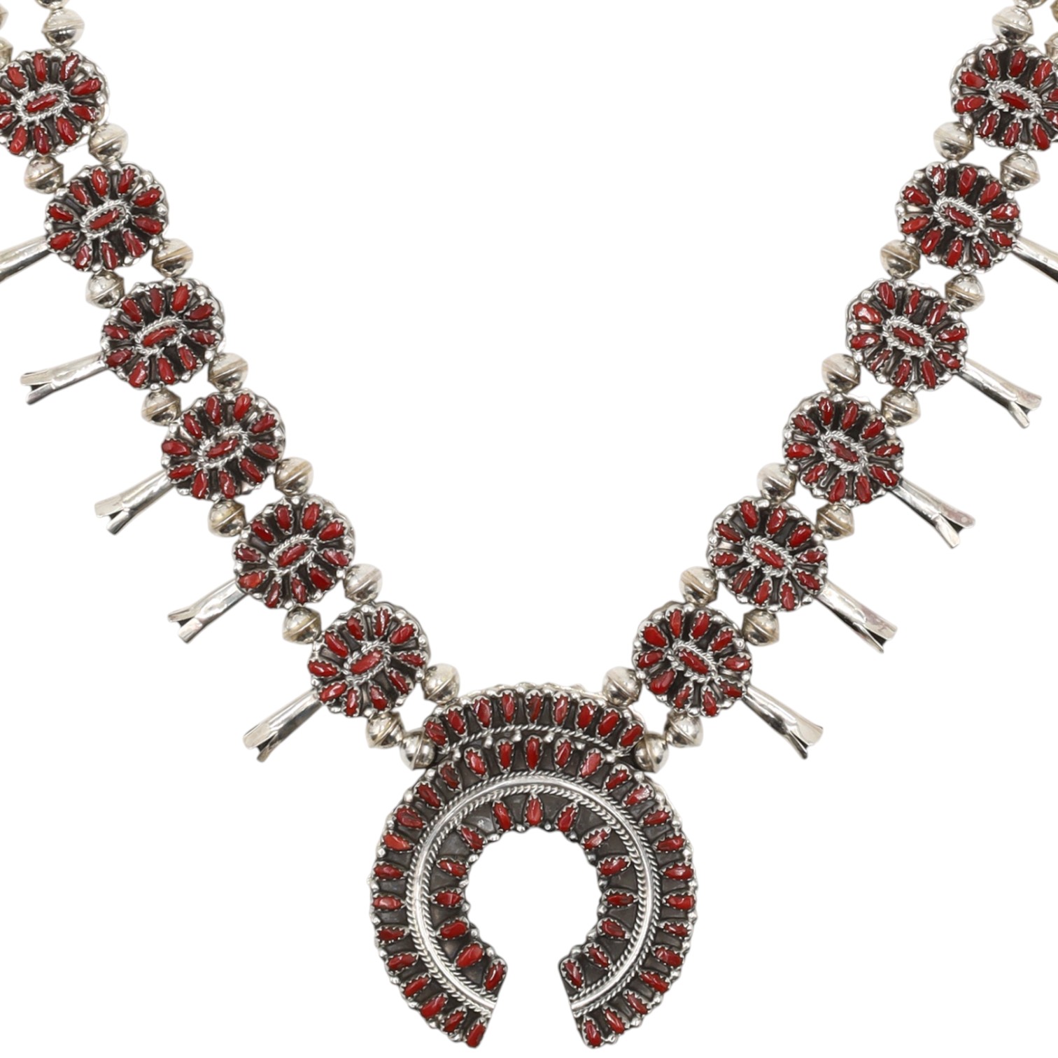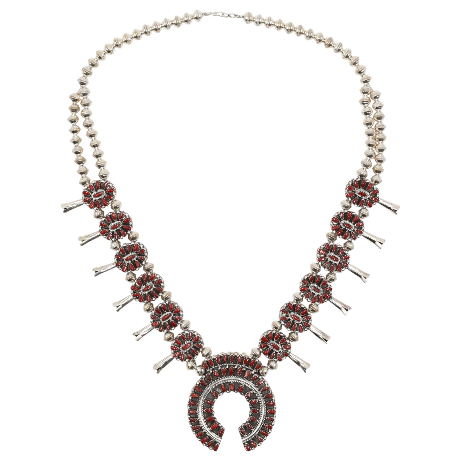 A Navajo sterling silver dual-sided squash blossom necklace by Milton James, featuring both turquoise and coral cabochons. The necklace comprises a string of graduated, fluted silver beads, leading to twelve ‘squash blossom’ stations. Each station is set with multiple small cabochon stones around a central silver bead and terminates in a flaring silver element. A large crescent-shaped ‘Naja’ pendant forms the centerpiece, similarly adorned with multiple rows of small cabochon stones. The necklace is designed to display either coral or turquoise cabochons, as depicted in the provided images. It is marked "Sterling" and bears the artisan’s mark "MJ" on the reverse of the Naja. The necklace fastens with a hook-and-eye clasp.