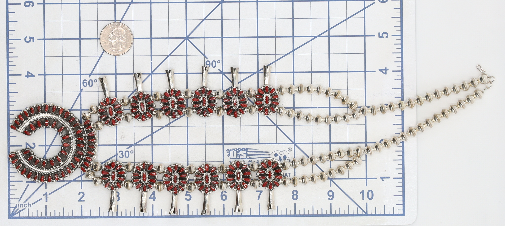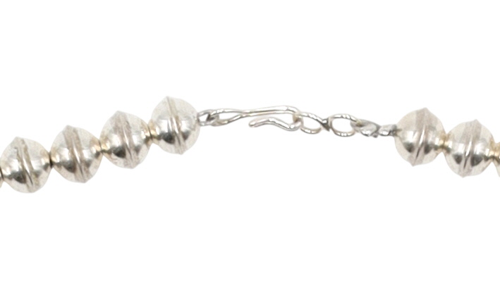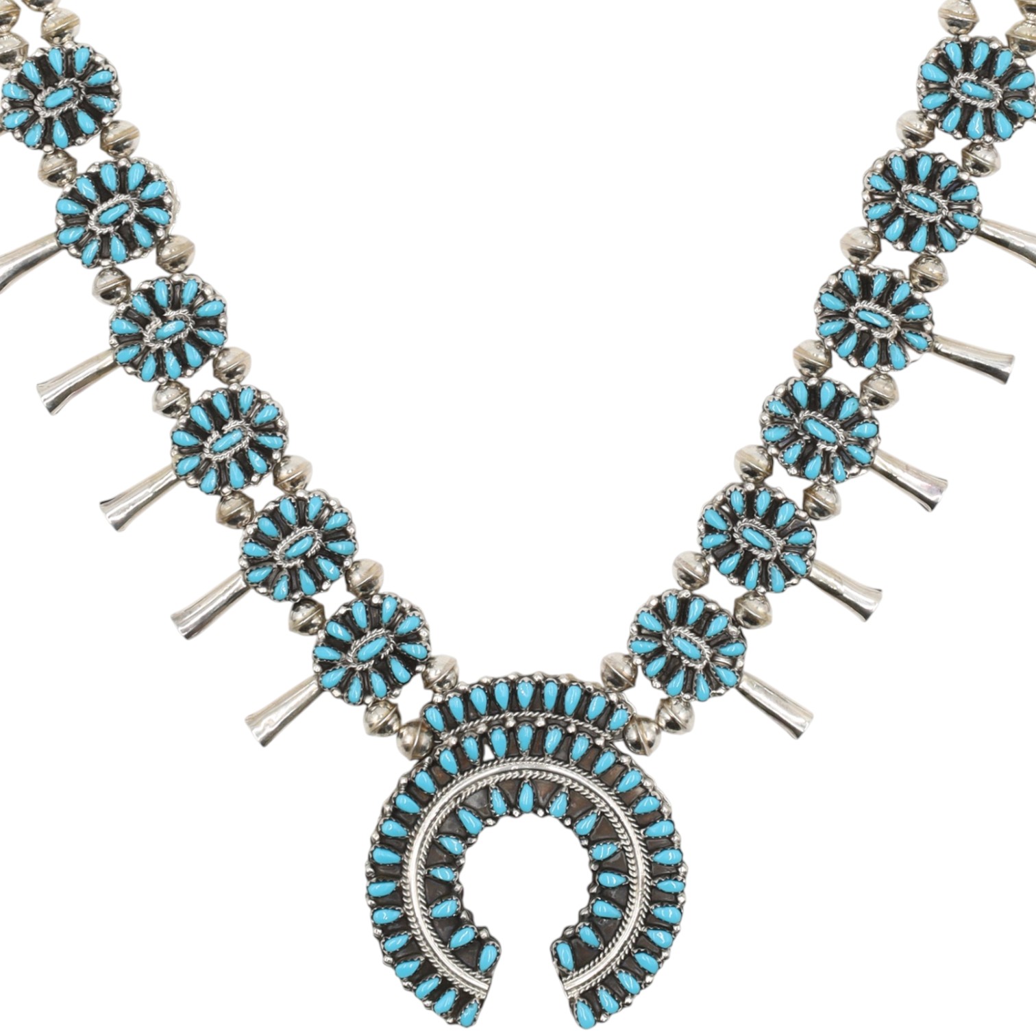 A Navajo sterling silver dual-sided squash blossom necklace by Milton James, featuring both turquoise and coral cabochons. The necklace comprises a string of graduated, fluted silver beads, leading to twelve ‘squash blossom’ stations. Each station is set with multiple small cabochon stones around a central silver bead and terminates in a flaring silver element. A large crescent-shaped ‘Naja’ pendant forms the centerpiece, similarly adorned with multiple rows of small cabochon stones. The necklace is designed to display either coral or turquoise cabochons, as depicted in the provided images. It is marked "Sterling" and bears the artisan’s mark "MJ" on the reverse of the Naja. The necklace fastens with a hook-and-eye clasp.