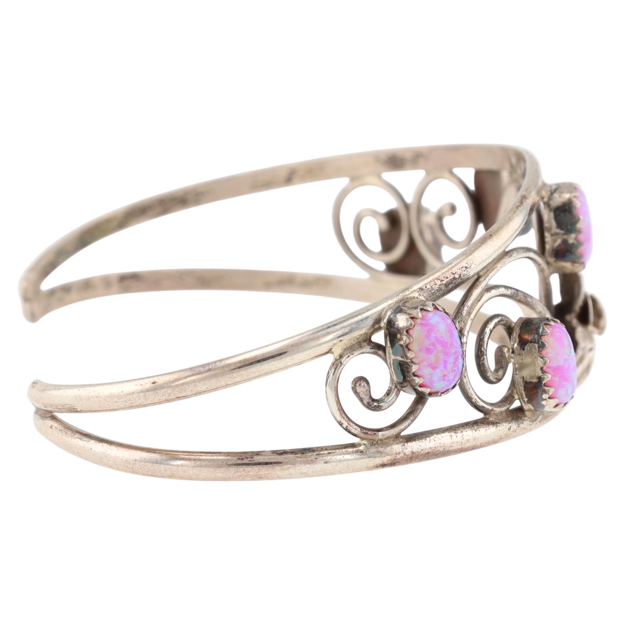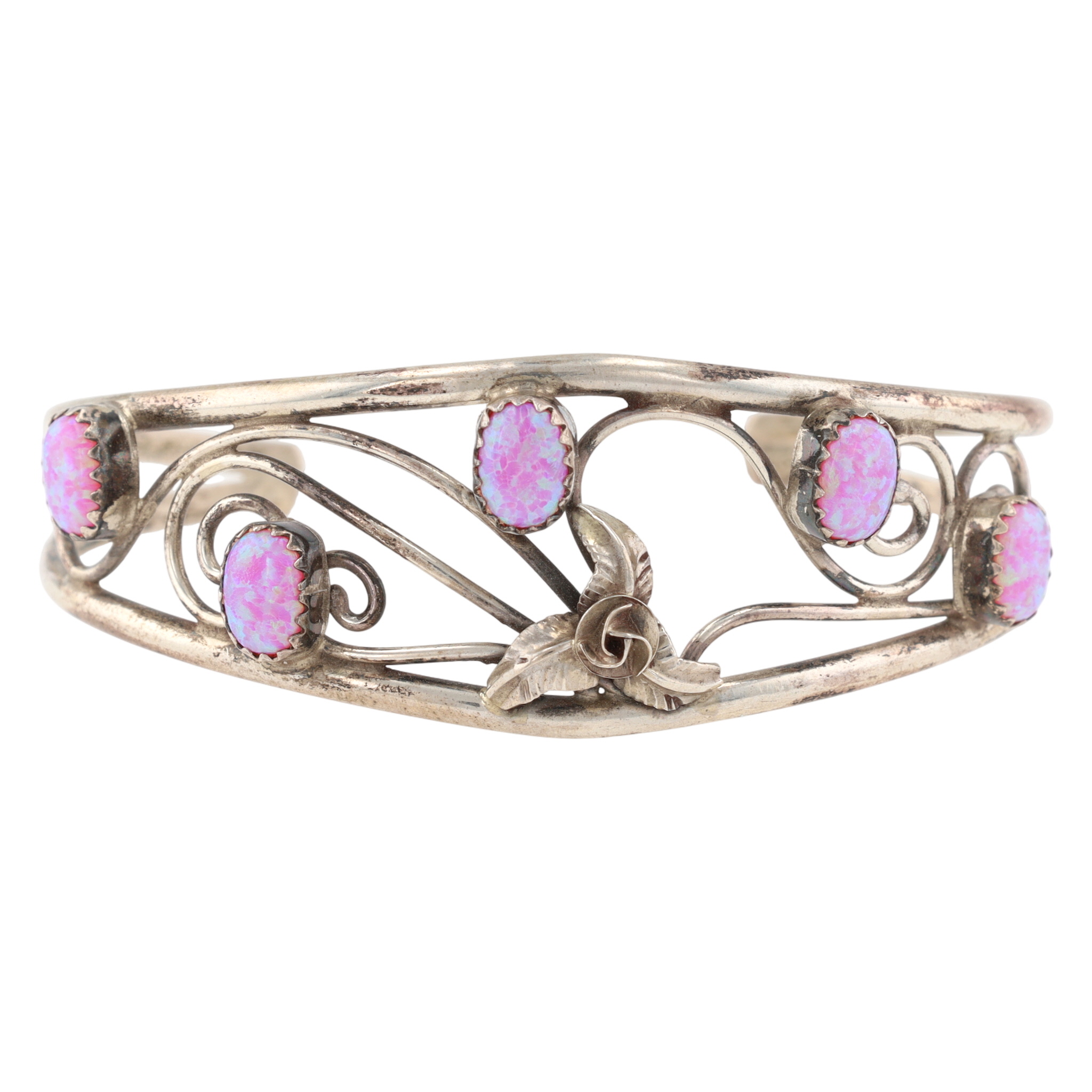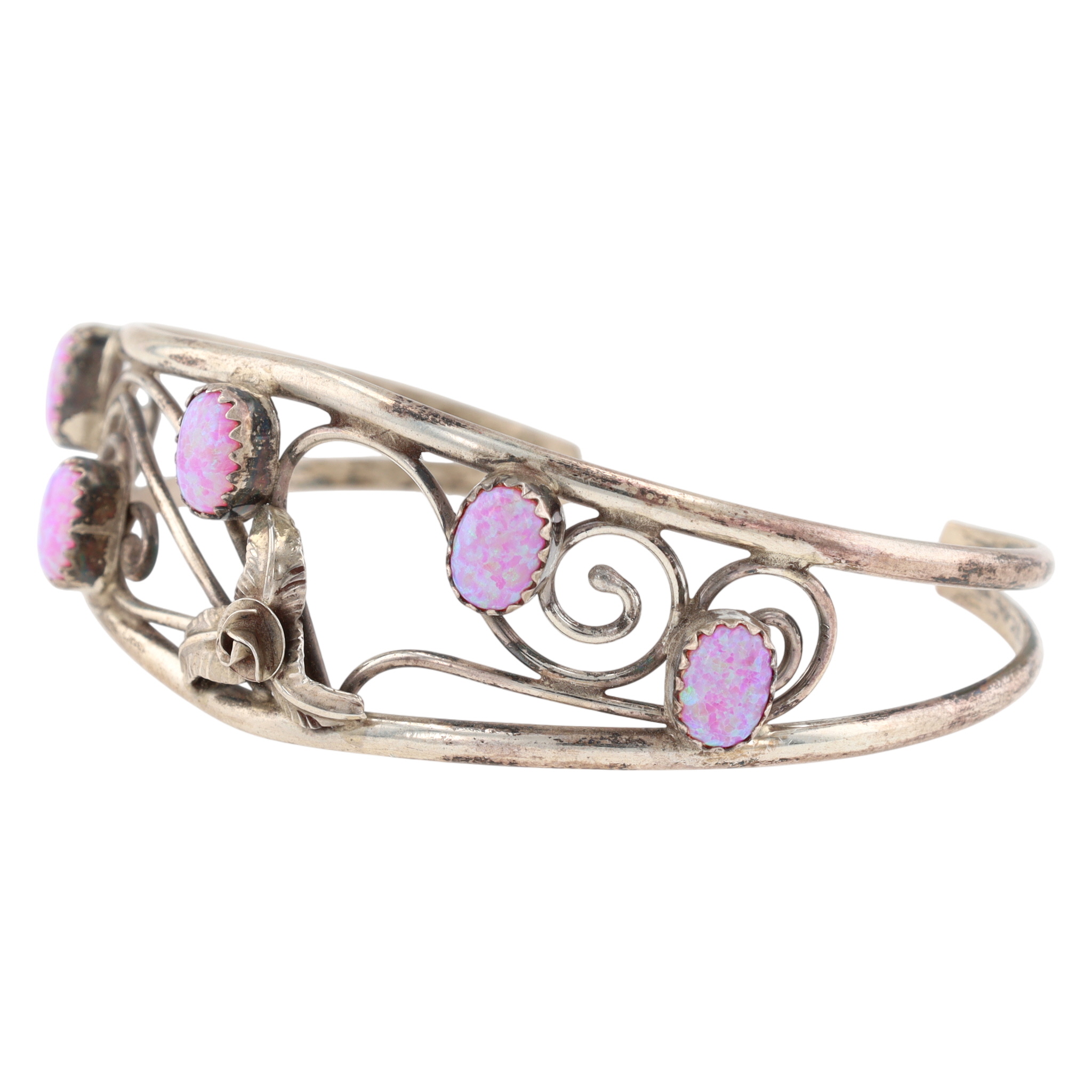 A Navajo Sterling Silver Pink Opal Flower Cuff Bracelet by Caroline Nez. Crafted from sterling silver, this open cuff bracelet features an intricate openwork design incorporating scrolling elements and a central floral motif with leaves. It is adorned with five oval cabochon stones exhibiting a vibrant pink hue and iridescence, consistent with synthetic or natural opal. The interior of the band is visibly stamped with the letter "C" and the word "STERLING".