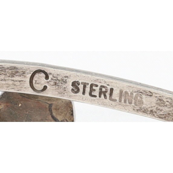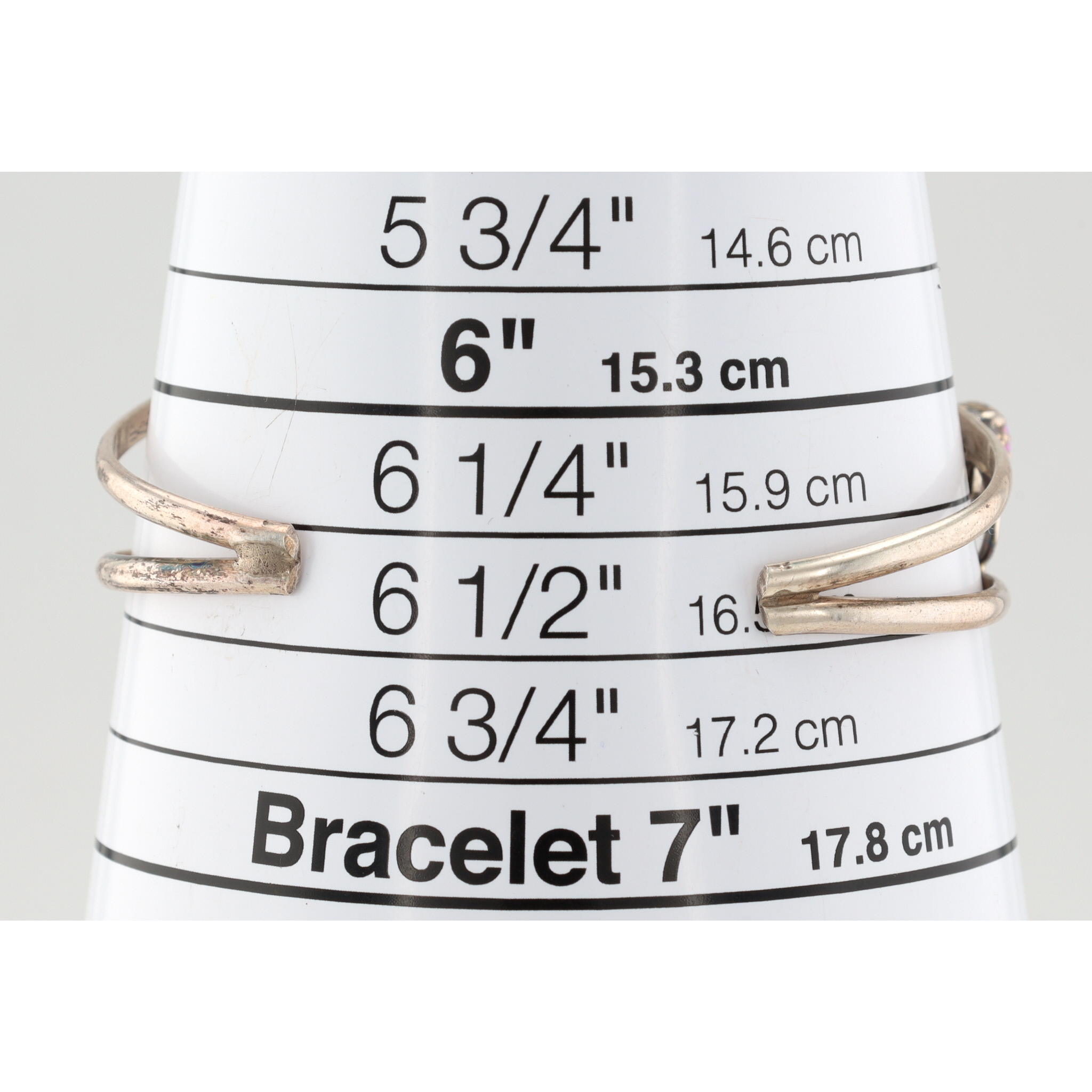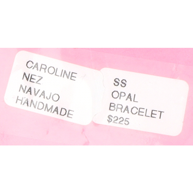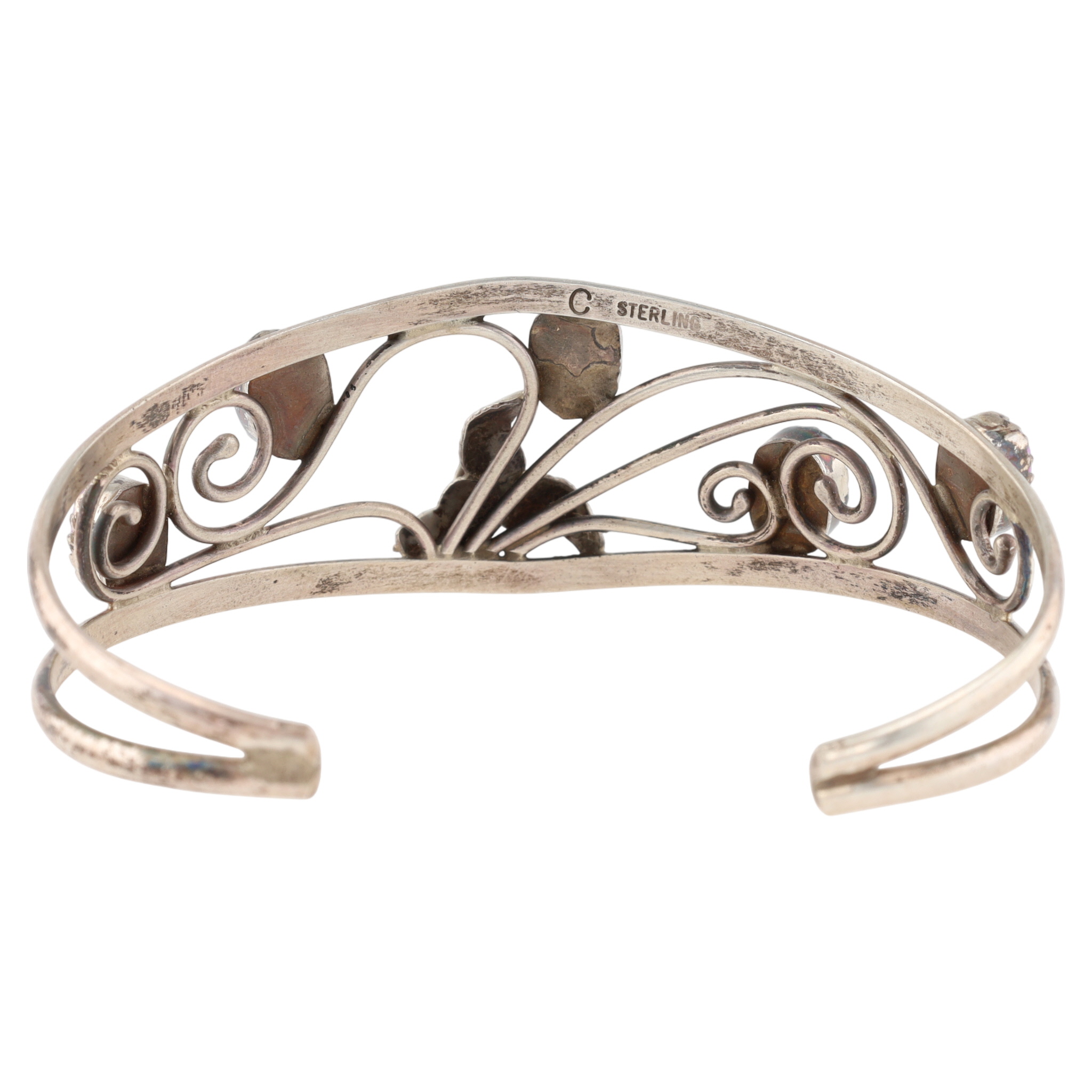 A Navajo Sterling Silver Pink Opal Flower Cuff Bracelet by Caroline Nez. Crafted from sterling silver, this open cuff bracelet features an intricate openwork design incorporating scrolling elements and a central floral motif with leaves. It is adorned with five oval cabochon stones exhibiting a vibrant pink hue and iridescence, consistent with synthetic or natural opal. The interior of the band is visibly stamped with the letter "C" and the word "STERLING".