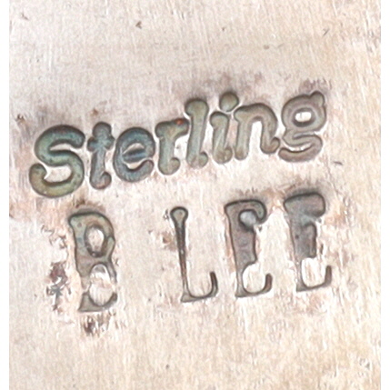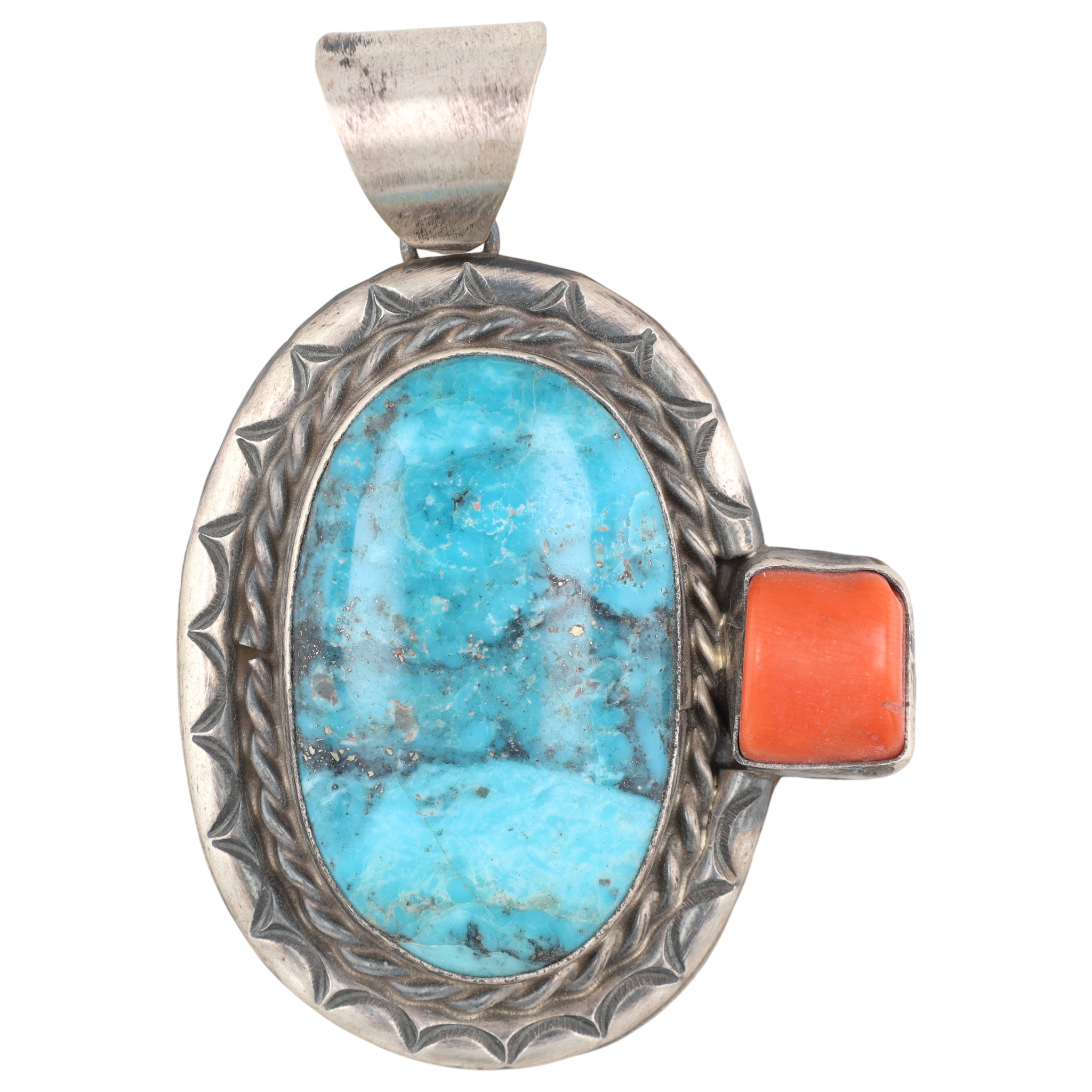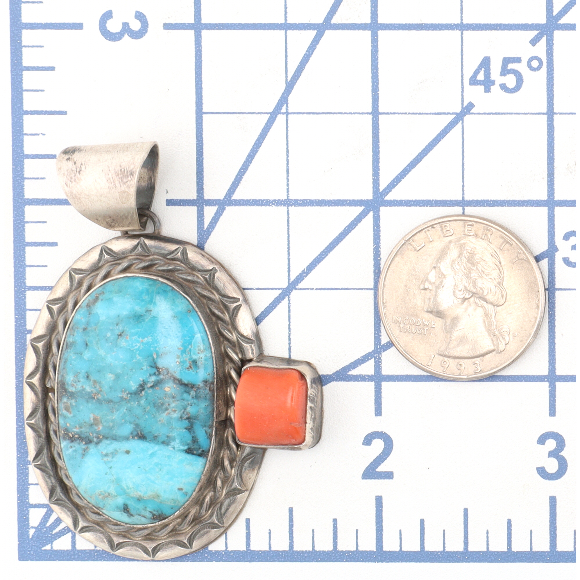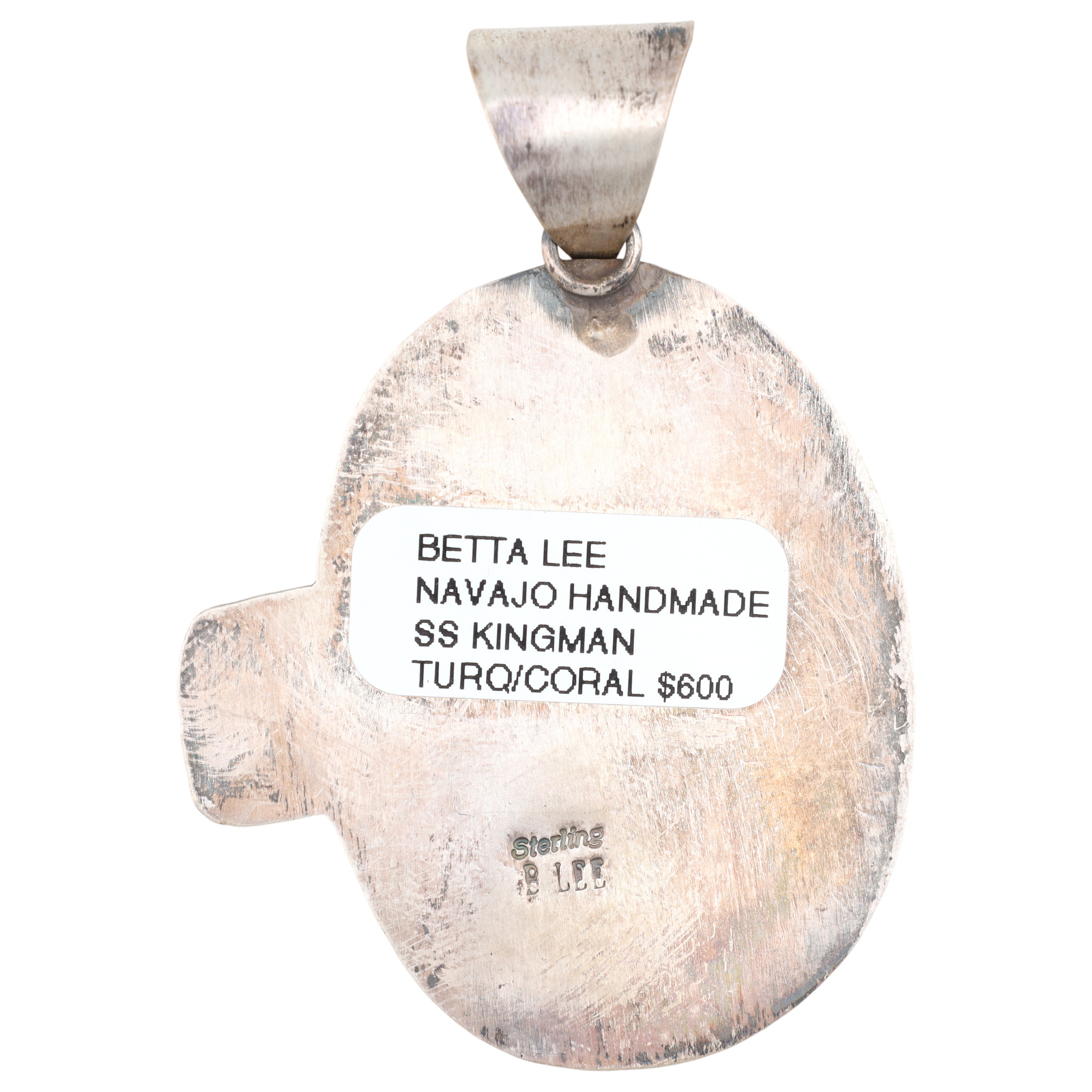 A Navajo sterling silver pendant by Betta Lee, featuring Kingman turquoise and red coral. This oval pendant is crafted from sterling silver, stamped "Sterling" and "B LEE" on the reverse. It showcases a large, oval Kingman turquoise cabochon with visible matrix, set within a twisted wire and stamped border. A smaller, rectangular red coral cabochon is set to the right side of the main stone. A white sticker on the reverse further identifies the piece as "BETTA LEE NAVAJO HANDMADE SS KINGMAN TURQ/CORAL".