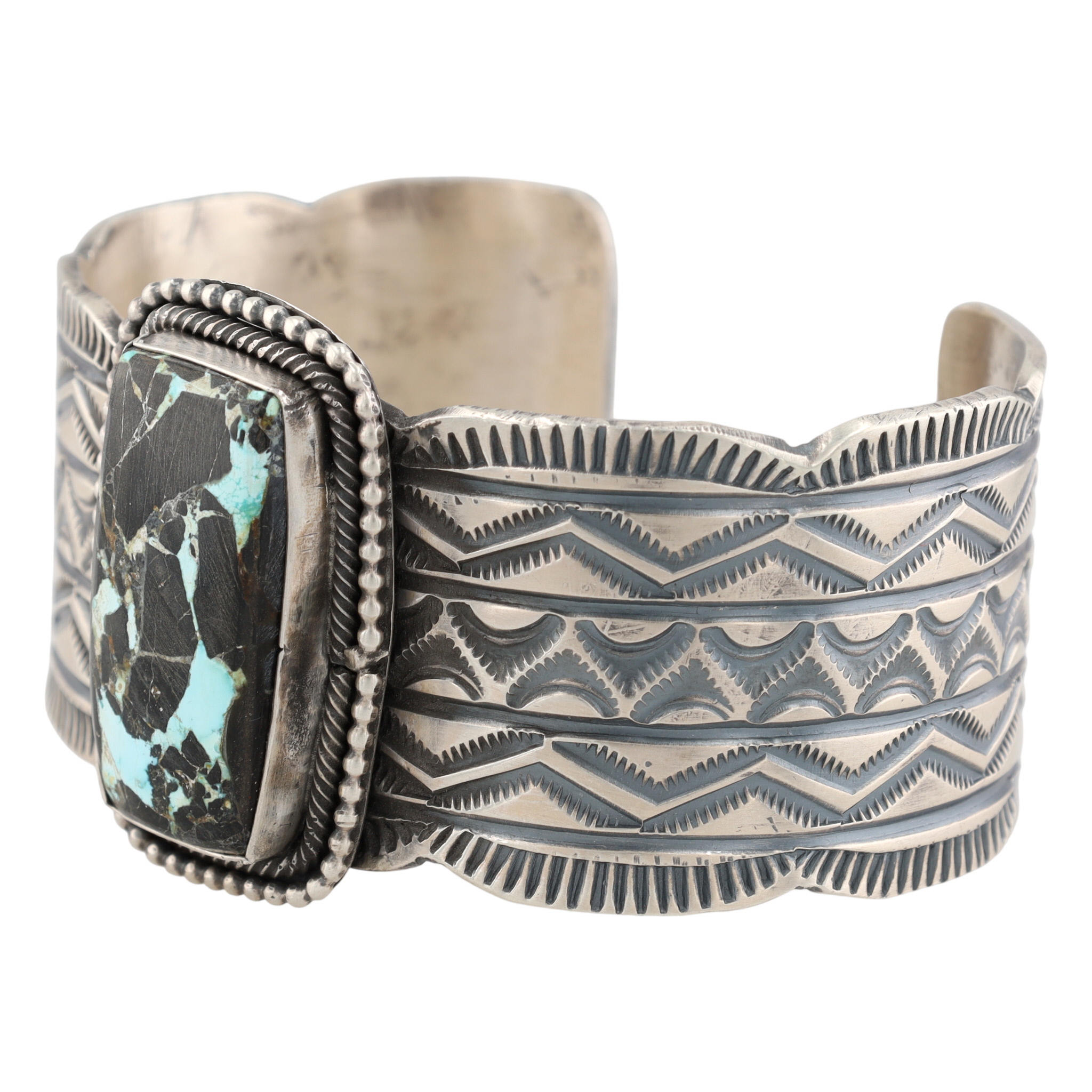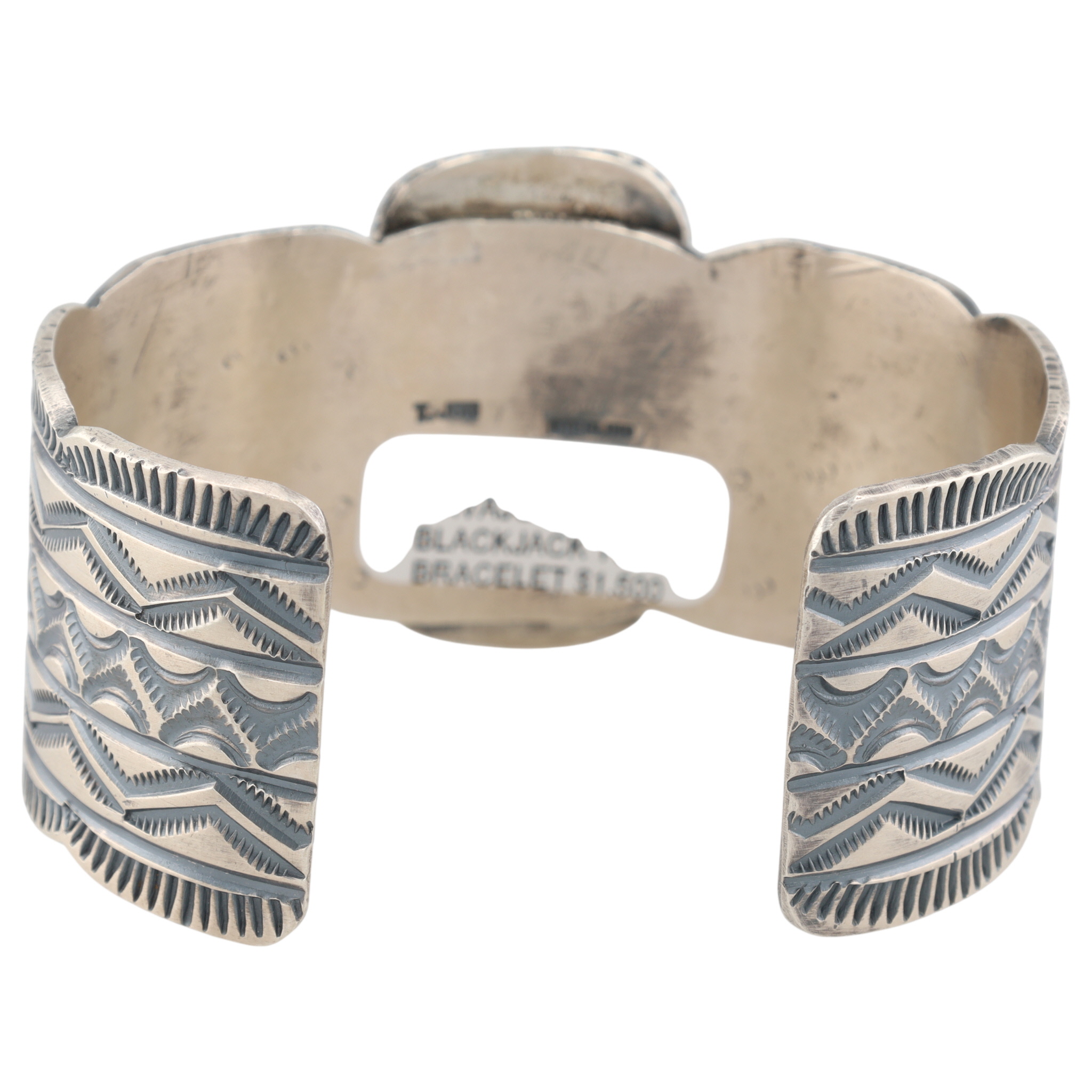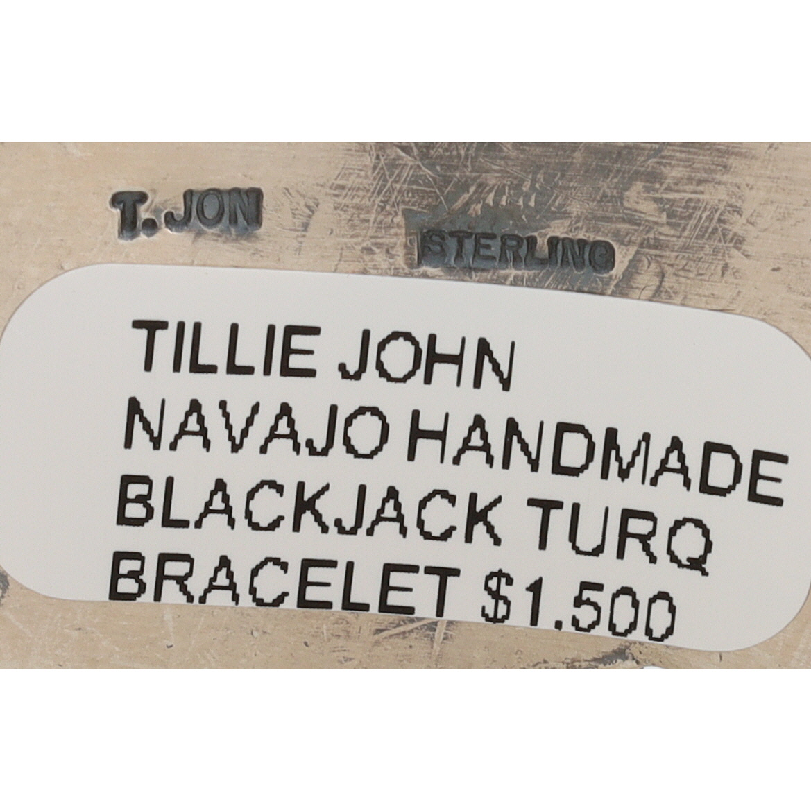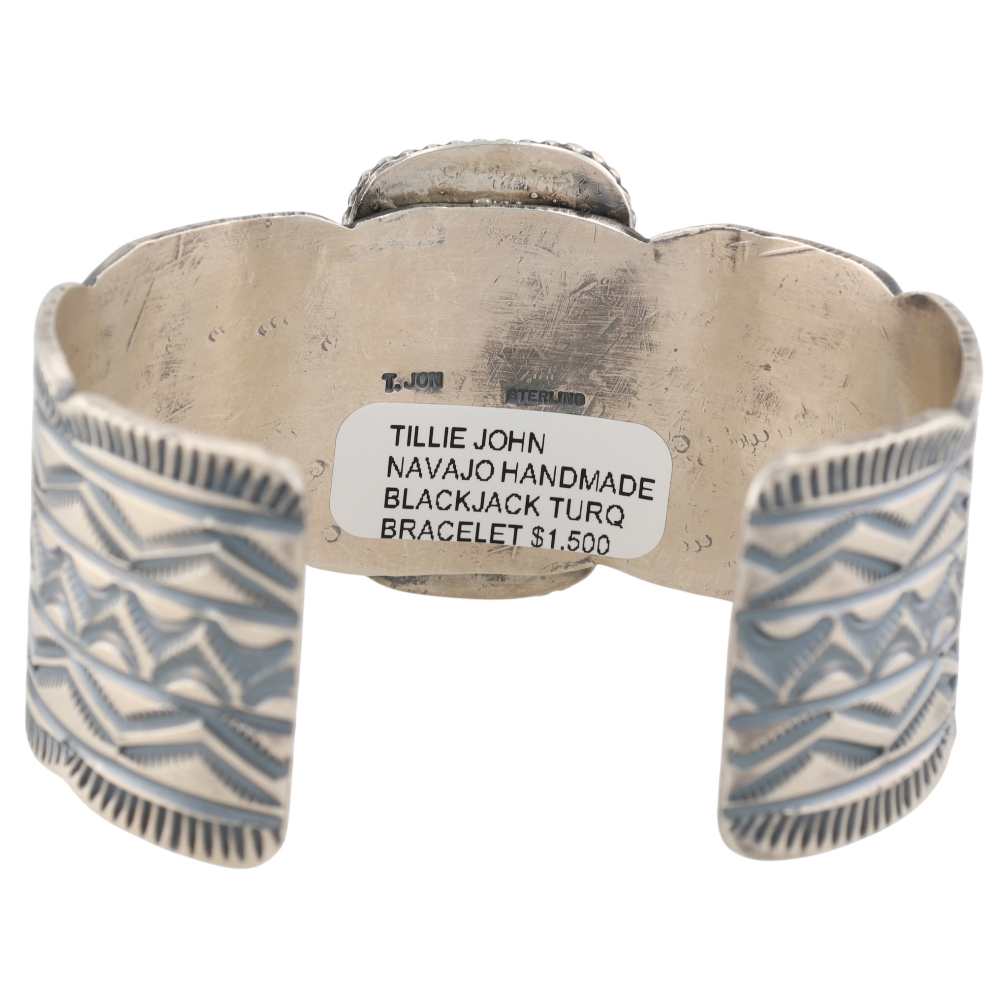 A Navajo heavy gauge sterling silver cuff bracelet by Tillie Jon, centrally set with a large, rectangular cabochon stone displaying a dark matrix with vibrant blue-green veins, consistent with Blackjack turquoise. The stone is secured by a twisted wire and rope-edge bezel. The wide cuff band is extensively adorned with deeply stamped geometric patterns, including zigzags, chevrons, and serrated lines, and features a scalloped upper and lower edge. The interior is visibly stamped "T. JON" and "STERLING", and bears an adhesive label reading "TILLIE JON NAVAJO HANDMADE BLACKJACK TURQ BRACELET $1.500".