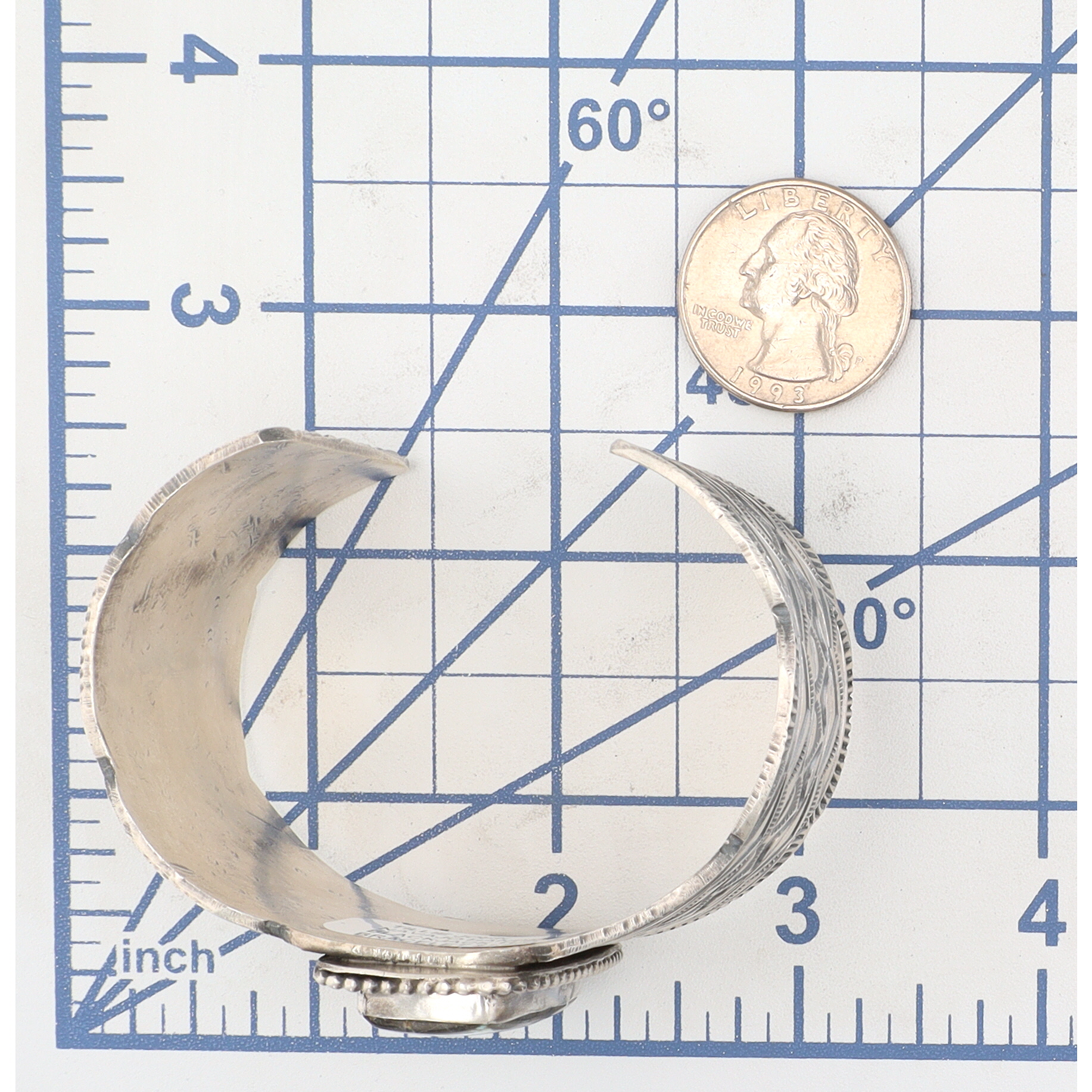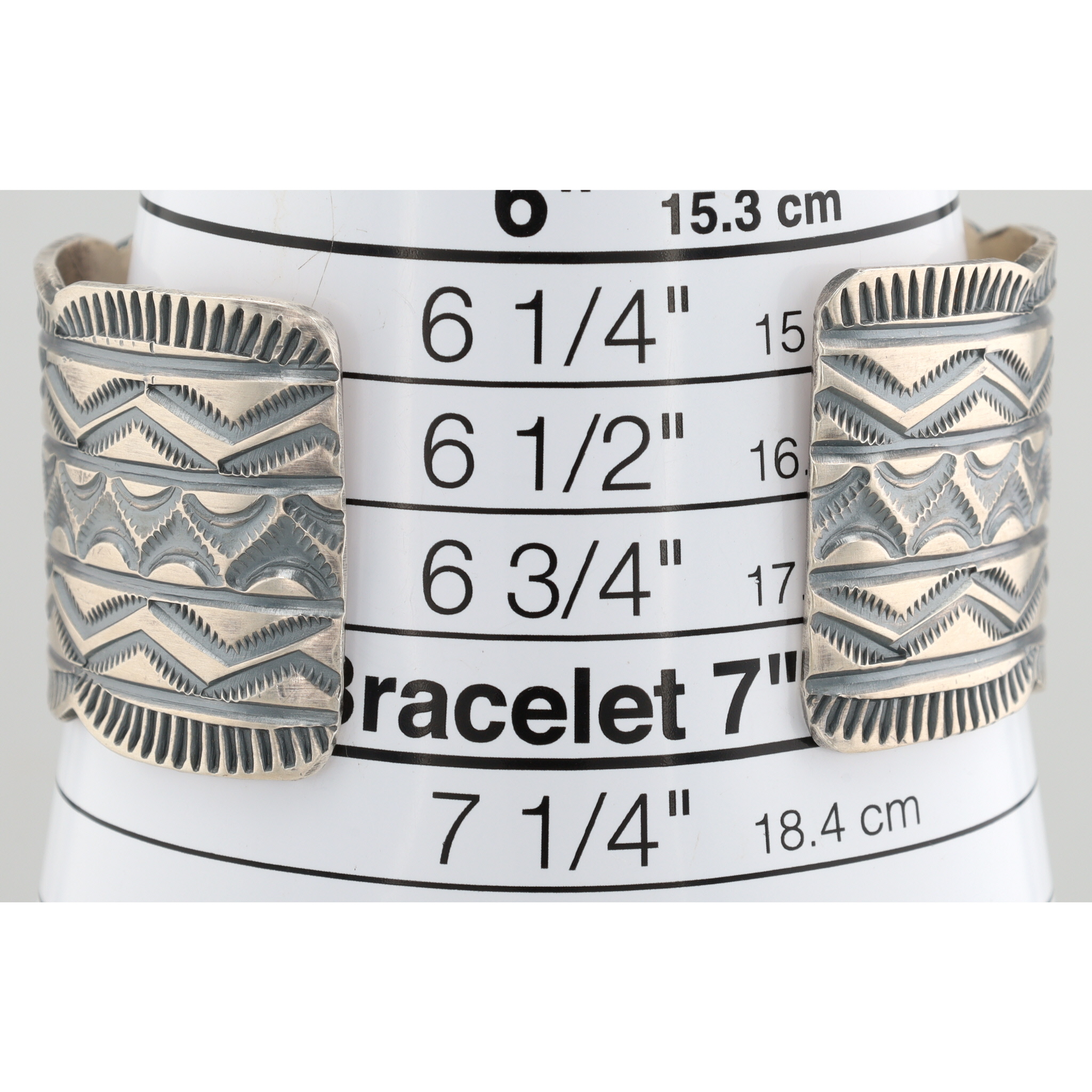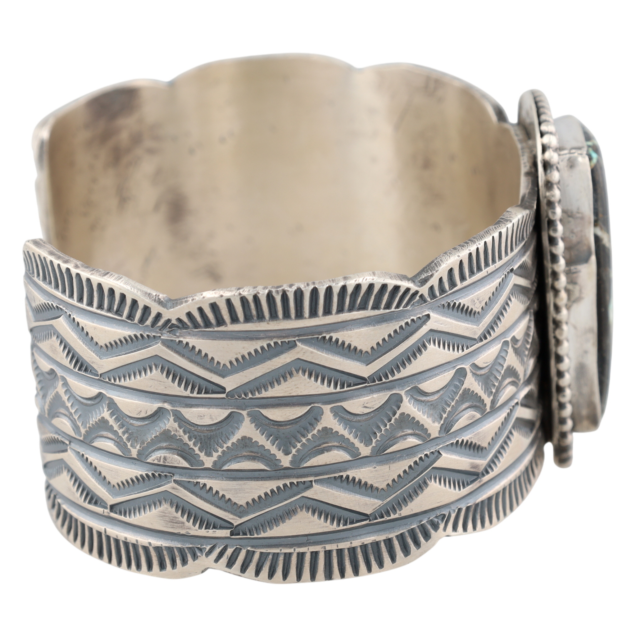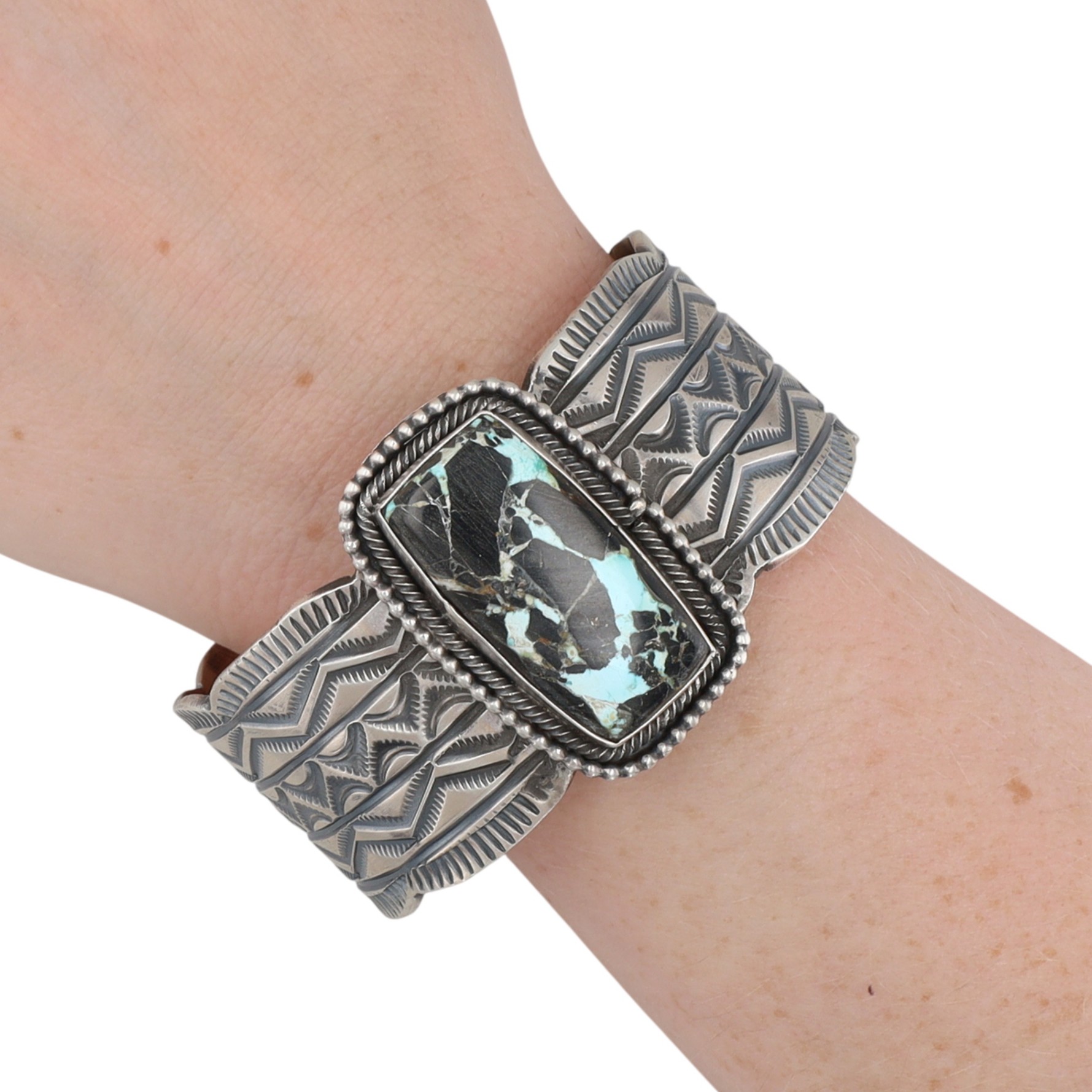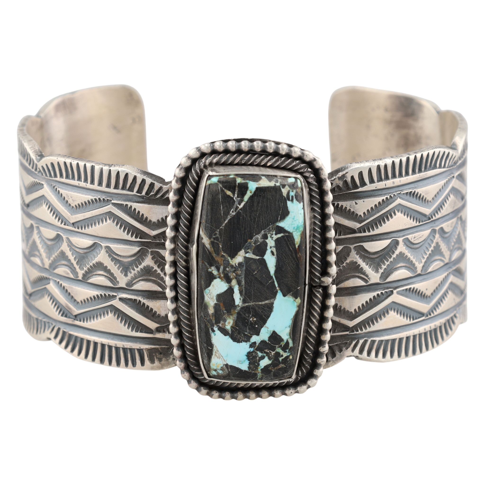 A Navajo heavy gauge sterling silver cuff bracelet by Tillie Jon, centrally set with a large, rectangular cabochon stone displaying a dark matrix with vibrant blue-green veins, consistent with Blackjack turquoise. The stone is secured by a twisted wire and rope-edge bezel. The wide cuff band is extensively adorned with deeply stamped geometric patterns, including zigzags, chevrons, and serrated lines, and features a scalloped upper and lower edge. The interior is visibly stamped "T. JON" and "STERLING", and bears an adhesive label reading "TILLIE JON NAVAJO HANDMADE BLACKJACK TURQ BRACELET $1.500".