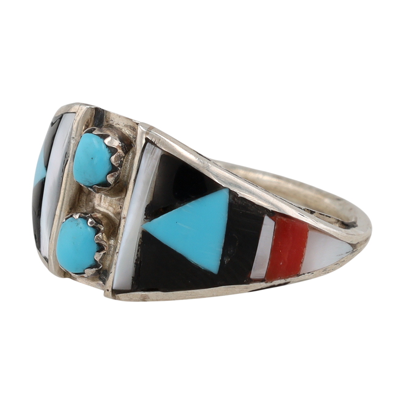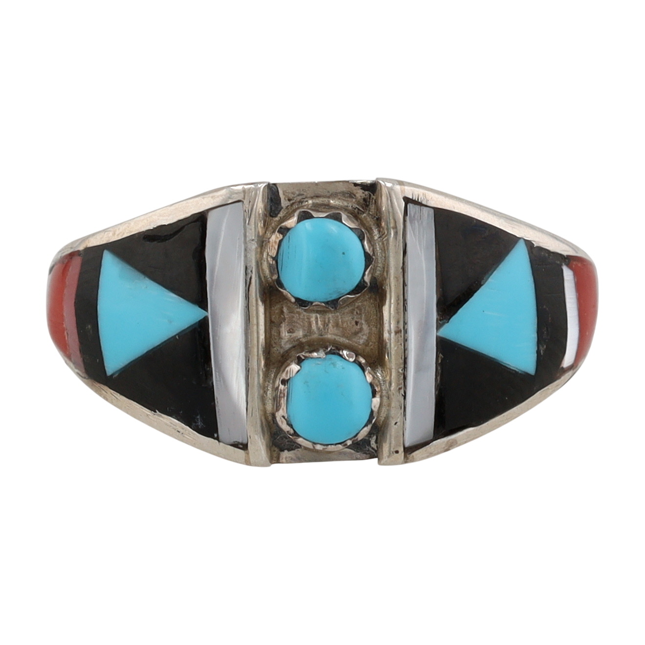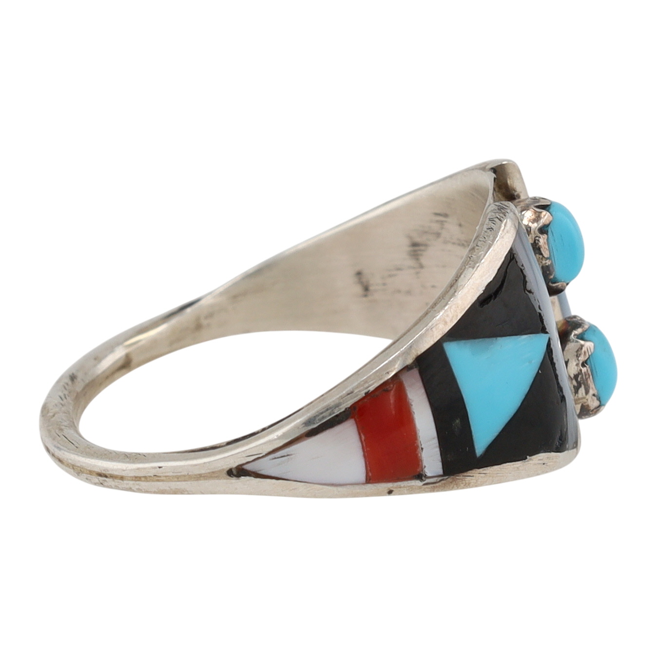 A vintage Zuni sterling silver multi-stone inlay ring by Delberta Boone, signed ‘Boone’. The ring features an elongated bezel with an elaborate inlay design incorporating geometric shapes, primarily triangles and bars, made onyx, turquoise, coral, and mother of pearl. These elements flank two centrally set, round turquoise stones, each held in a serrated bezel setting. The interior of the band is stamped ‘BOONE’.