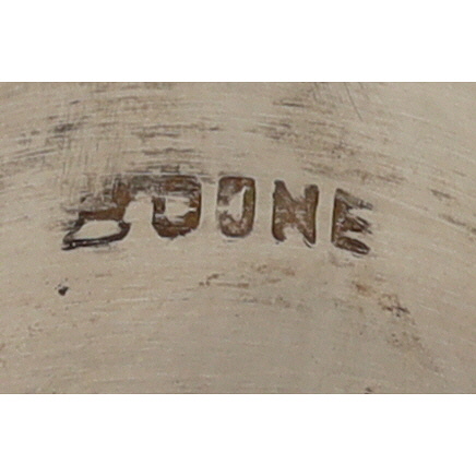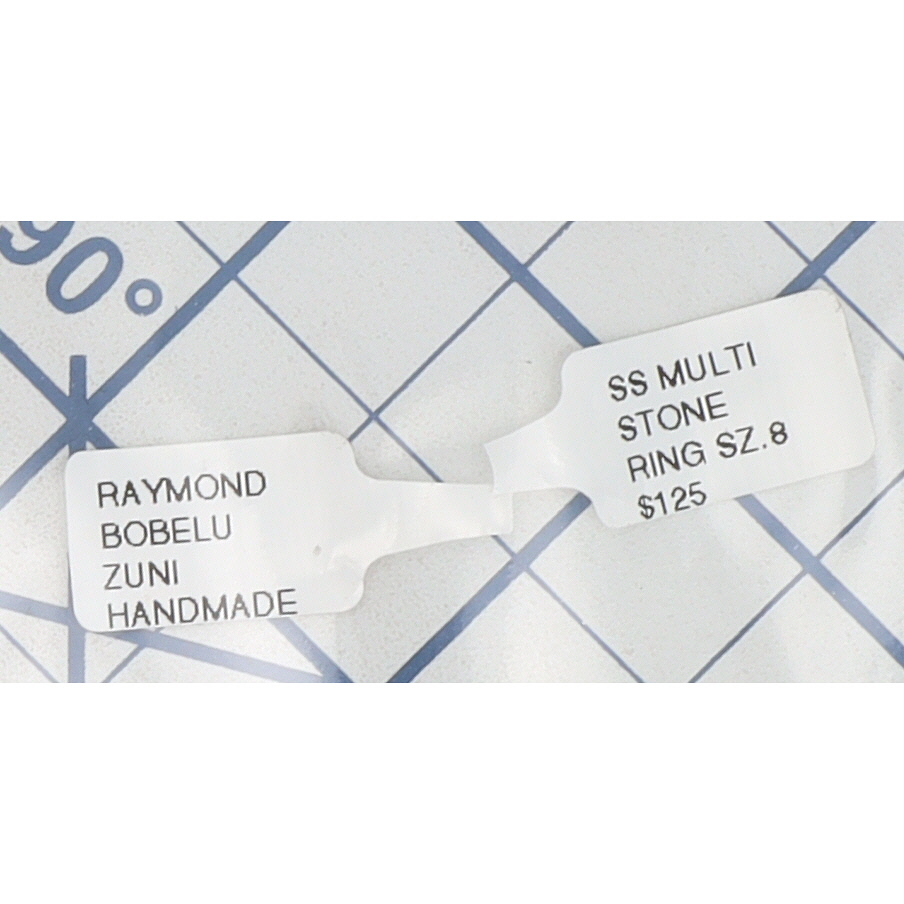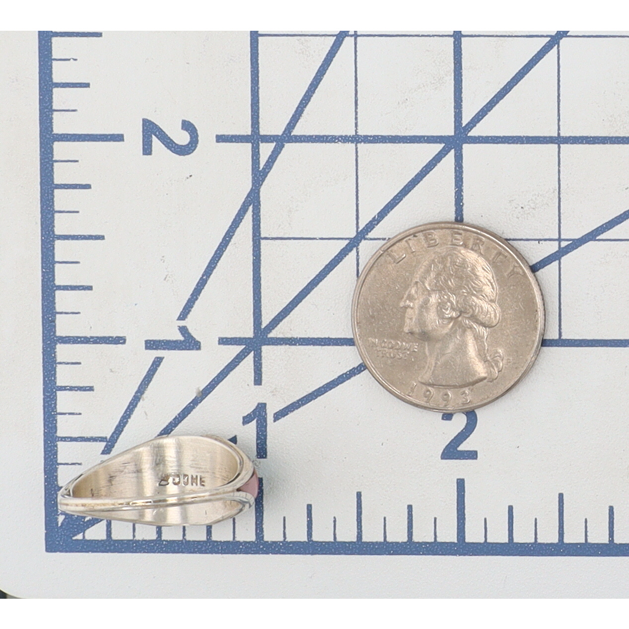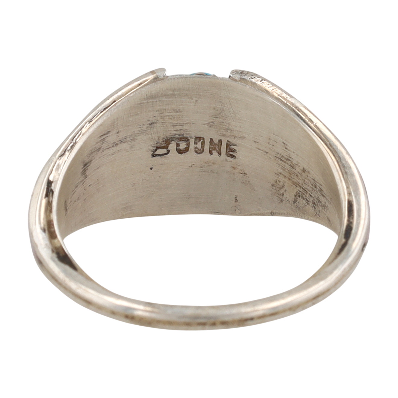 A vintage Zuni sterling silver multi-stone inlay ring by Delberta Boone, signed ‘Boone’. The ring features an elongated bezel with an elaborate inlay design incorporating geometric shapes, primarily triangles and bars, made onyx, turquoise, coral, and mother of pearl. These elements flank two centrally set, round turquoise stones, each held in a serrated bezel setting. The interior of the band is stamped ‘BOONE’.