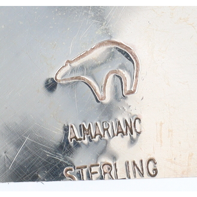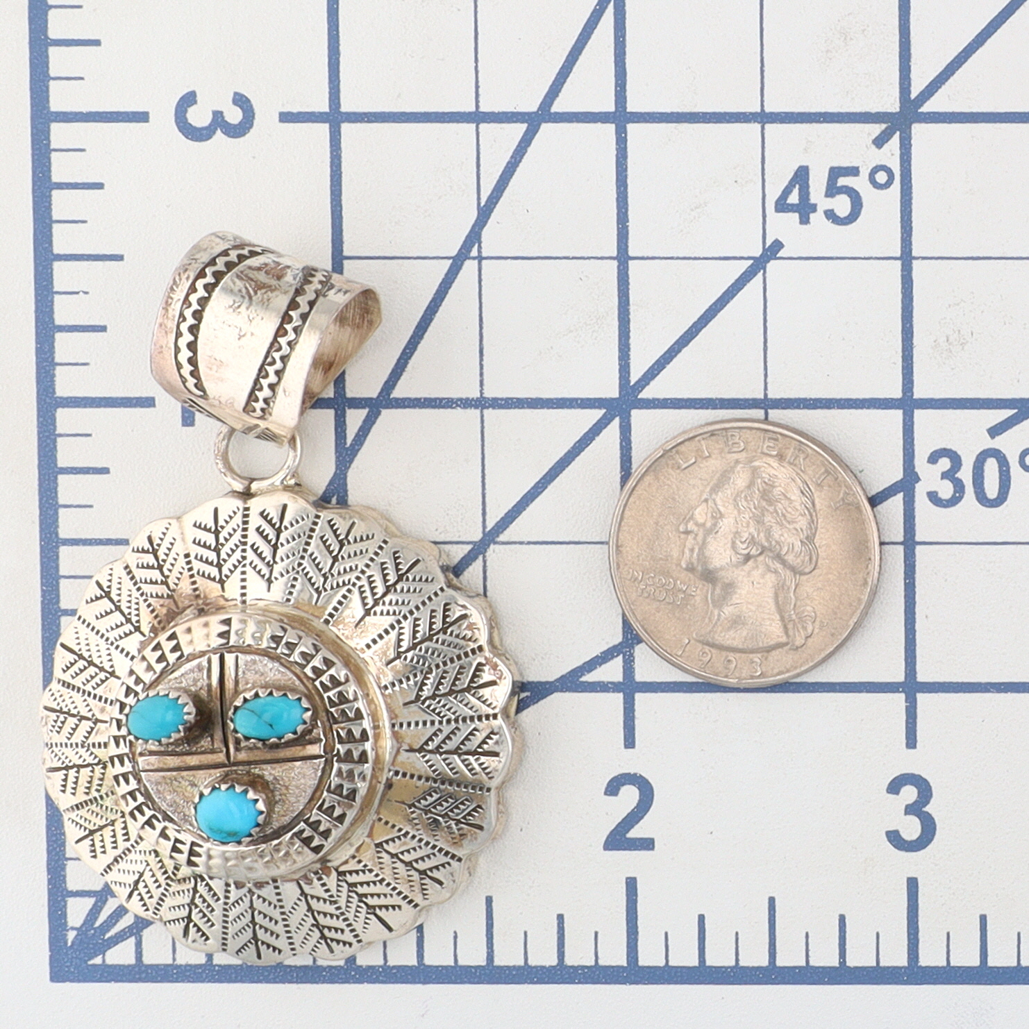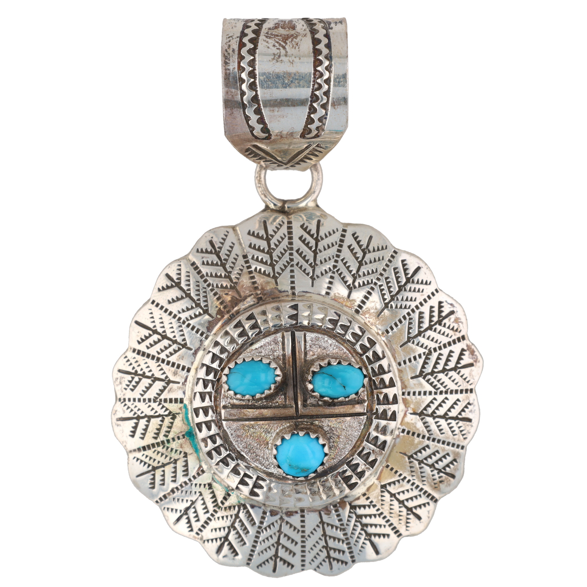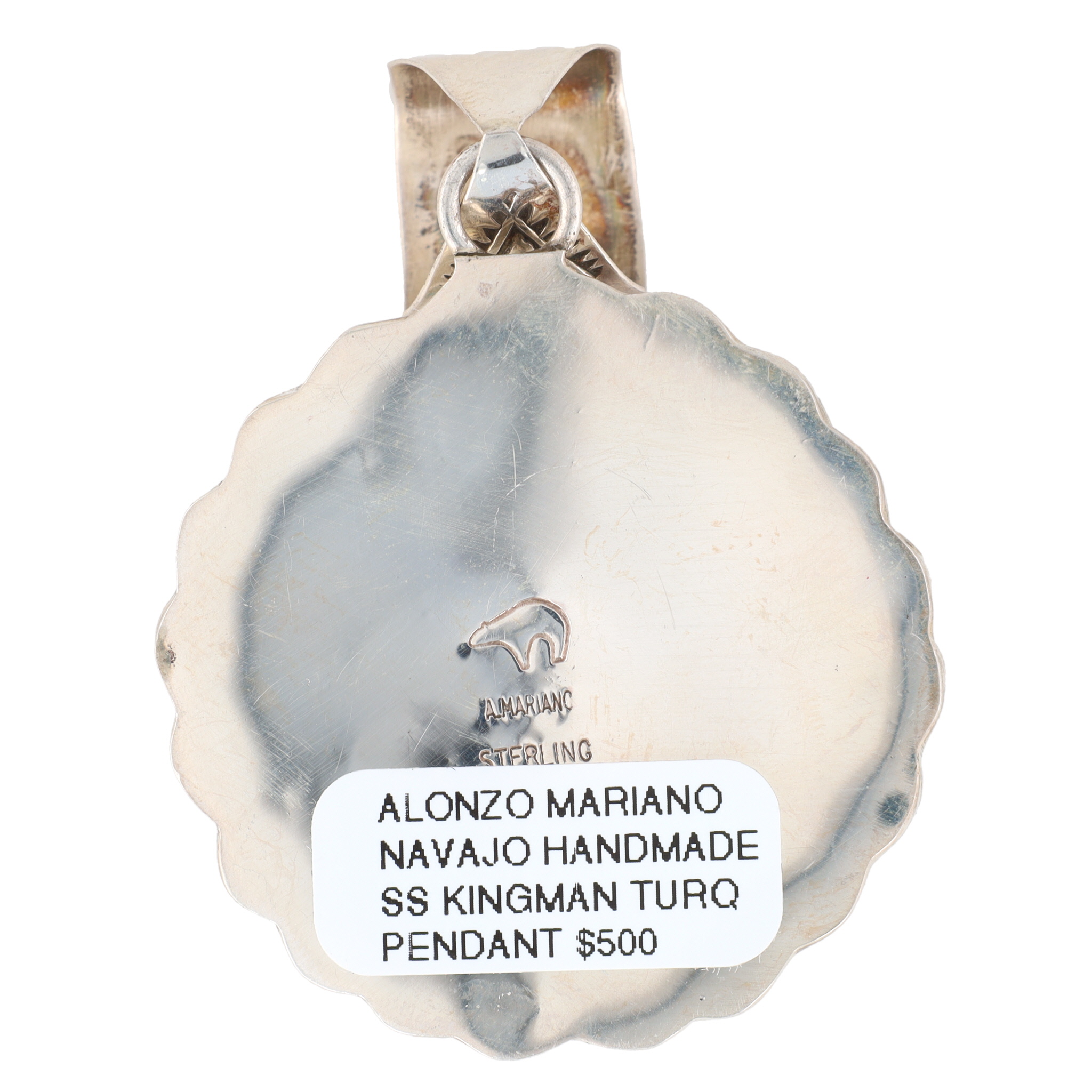 An Alonzo Mariano Navajo sterling silver turquoise pendant. Oval and scalloped in form, with an integrated decorative bail. The front features a central cruciform design adorned with three oval-cut turquoise cabochons, surrounded by radiating stamped patterns. The bail also exhibits stamped decoration. On the reverse, a stamped maker’s mark of a bear and the legend "A. MARIANO STERLING" are visible. A rectangular retail sticker is partially adhered to the reverse.