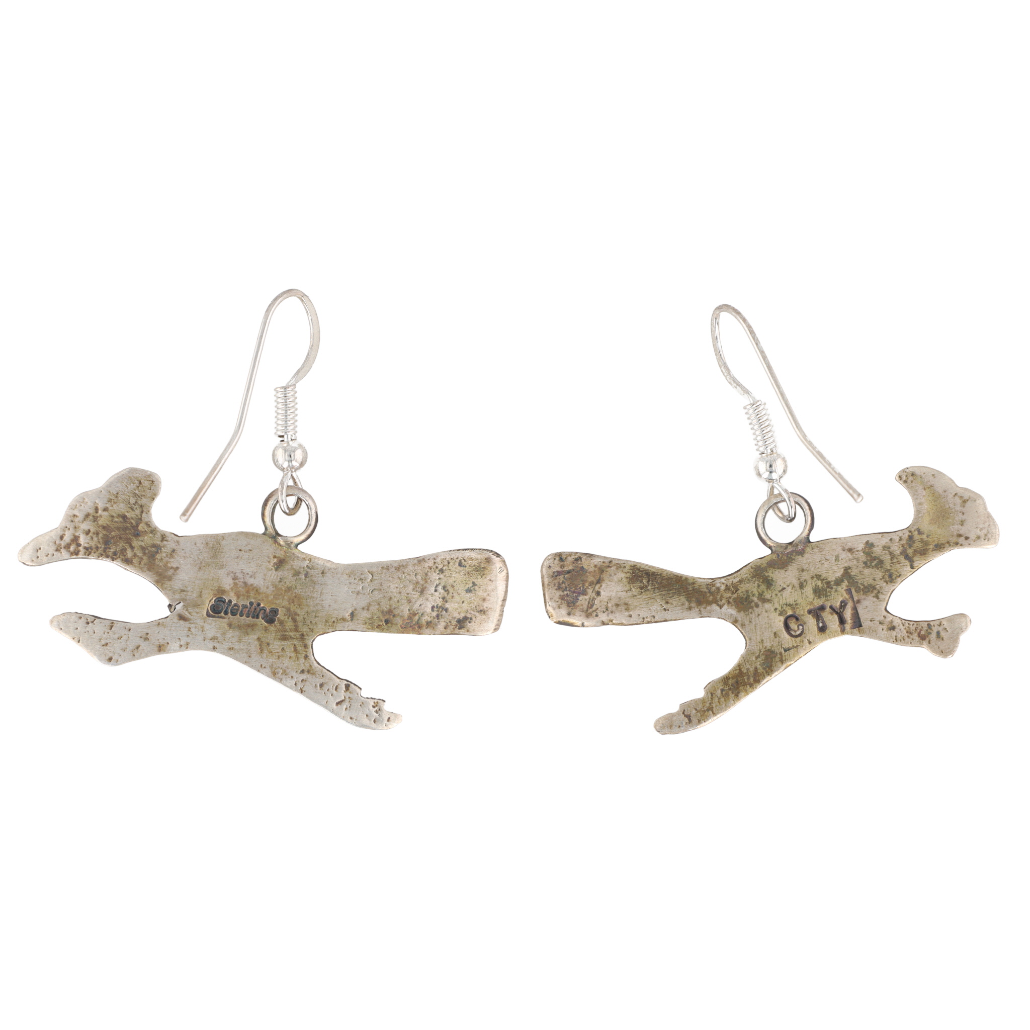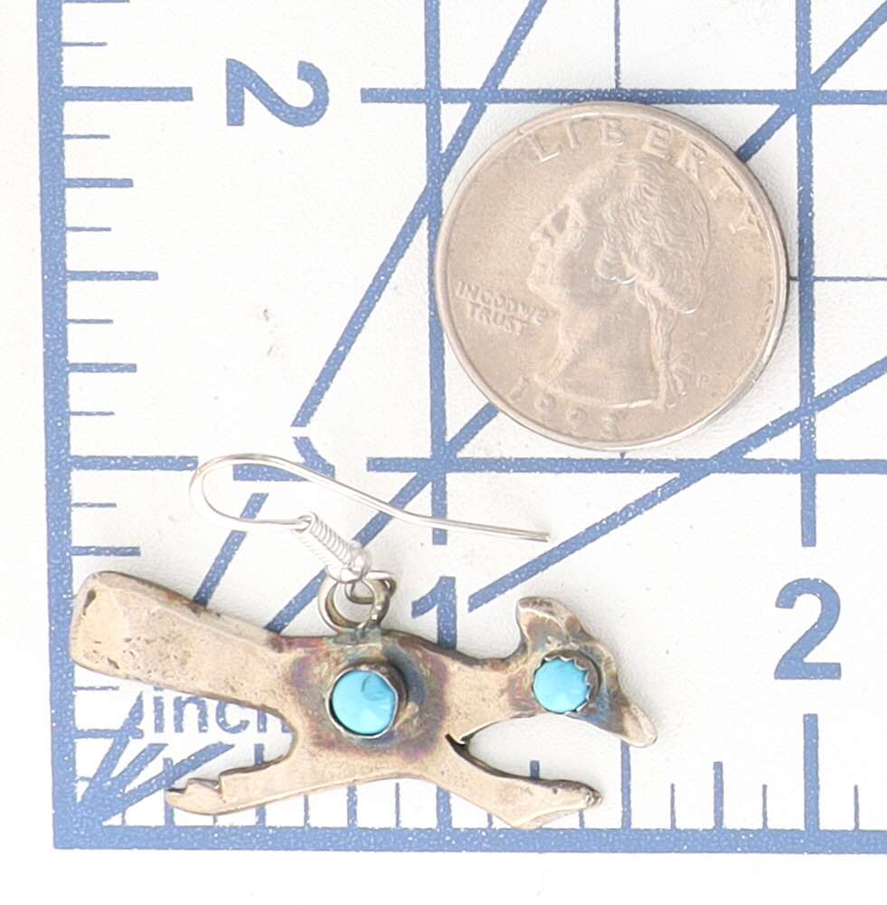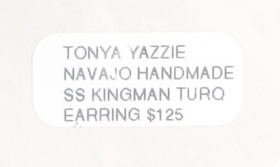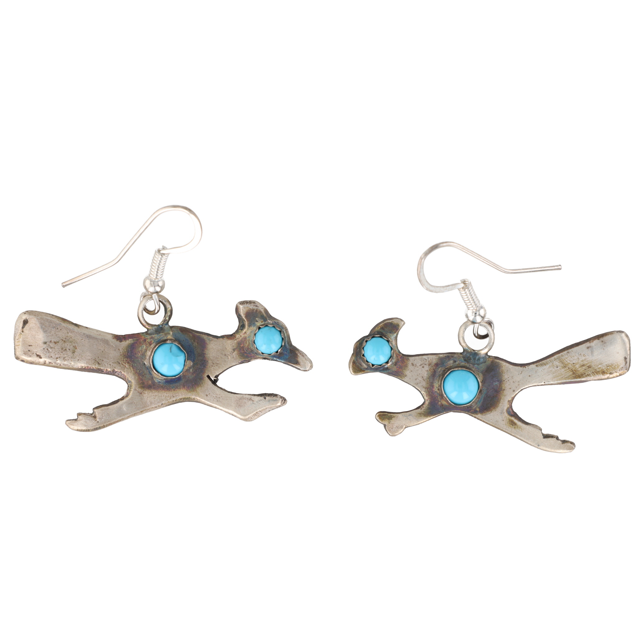 A pair of Navajo sterling silver dangle earrings, each depicting a stylized roadrunner figure. Crafted from sterling silver, with "Sterling" clearly stamped on the reverse of one earring, and "GTY" stamped on the reverse of the other. Each roadrunner is set with two round, bezel-set Kingman turquoise cabochon stones. An accompanying label identifies the item as "TONYA YAZZIE NAVAJO HANDMADE SS KINGMAN TURQ EARRING $125".
