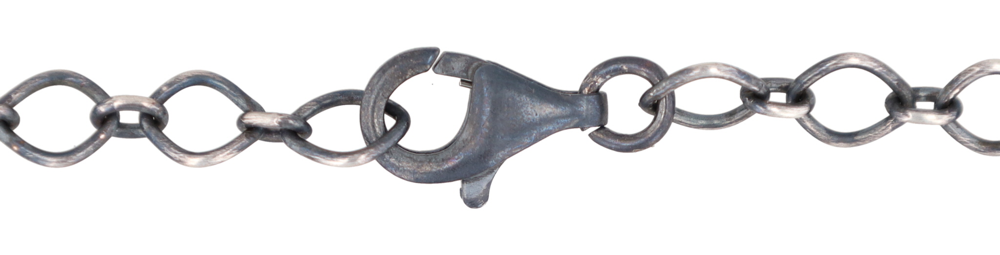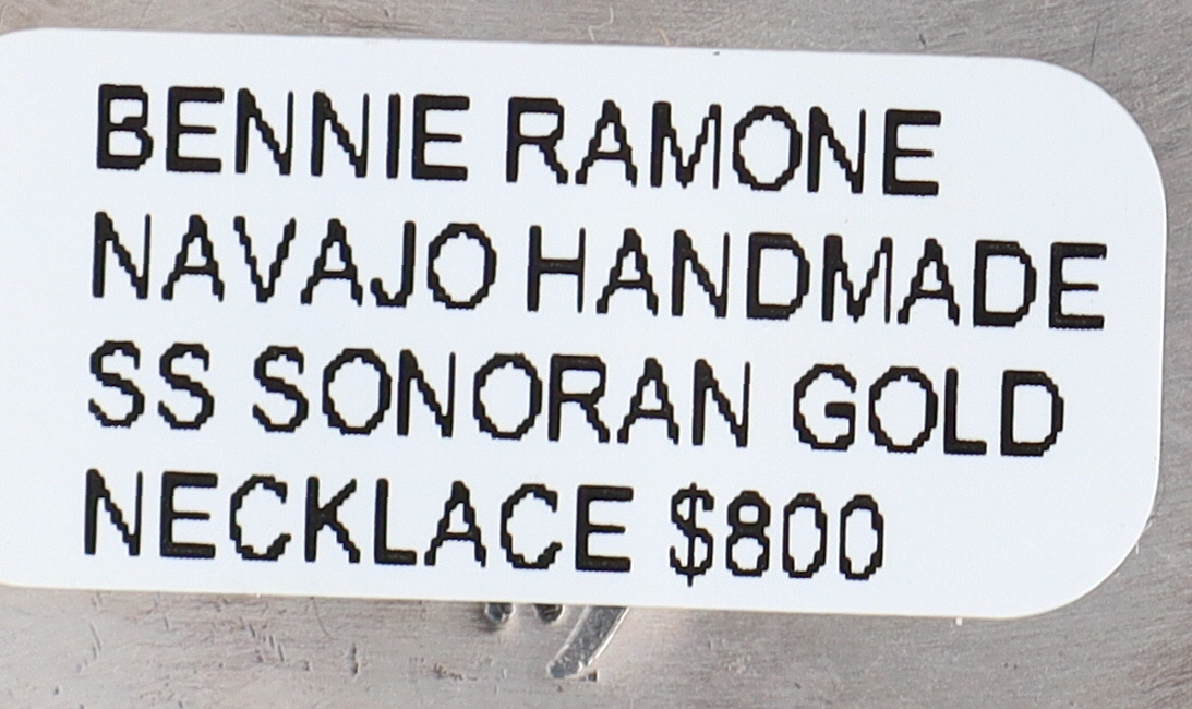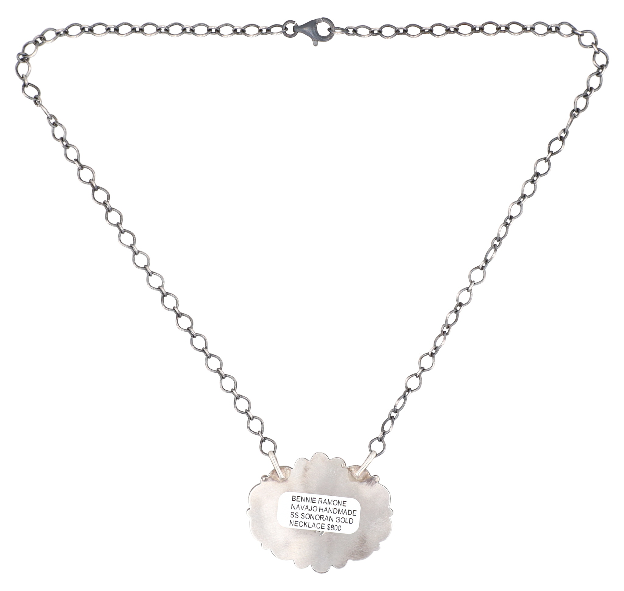 A Navajo sterling silver necklace by Bennie Ramone, featuring an oval pendant set with a single large cabochon Sonoran Gold turquoise stone. The pendant exhibits a Southwestern-style design with a scalloped border, stamped decorative elements, and a bezel-set central stone displaying a mottled matrix of cream, brown, and turquoise blue hues. The necklace chain is comprised of interlocking oval links with an oxidized finish, securing with a lobster clasp. The reverse of the pendant is stamped "STERLING" and bears a stylized maker’s mark of an "R" inside a bearpaw. A white adhesive label affixed to the back provides additional text: "BENNIE RAMONE", "NAVAJO HANDMADE", "SS SONORAN GOLD", and "NECKLACE $800".