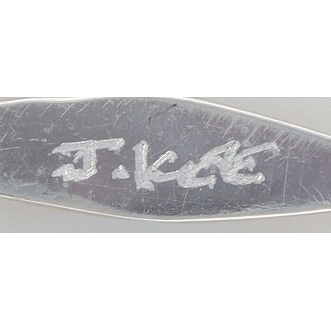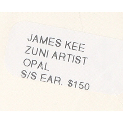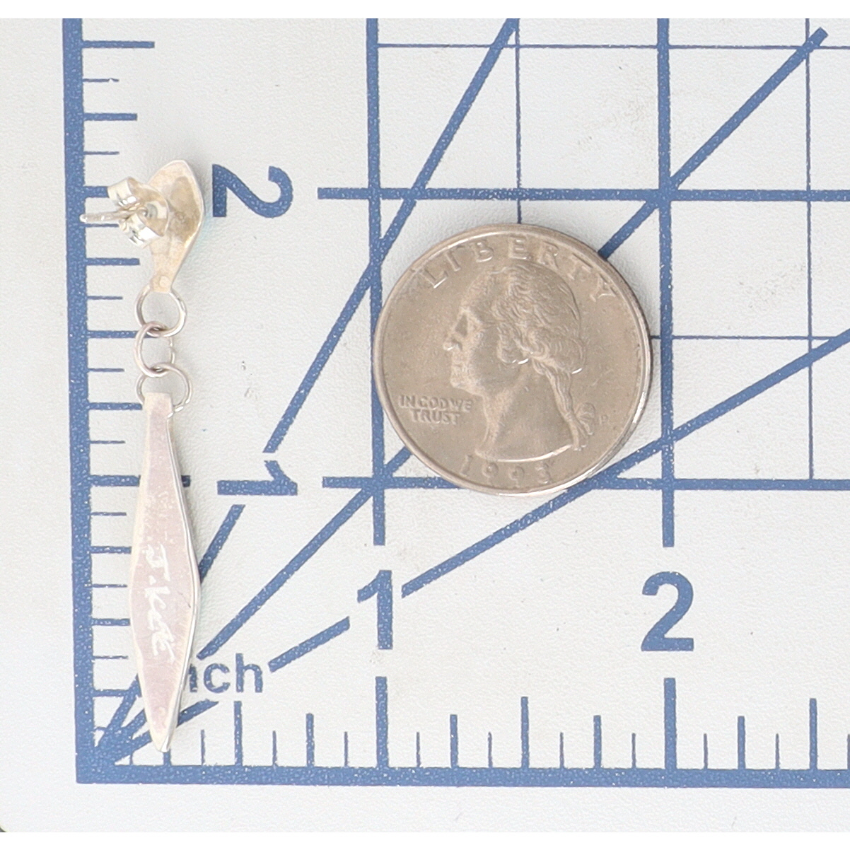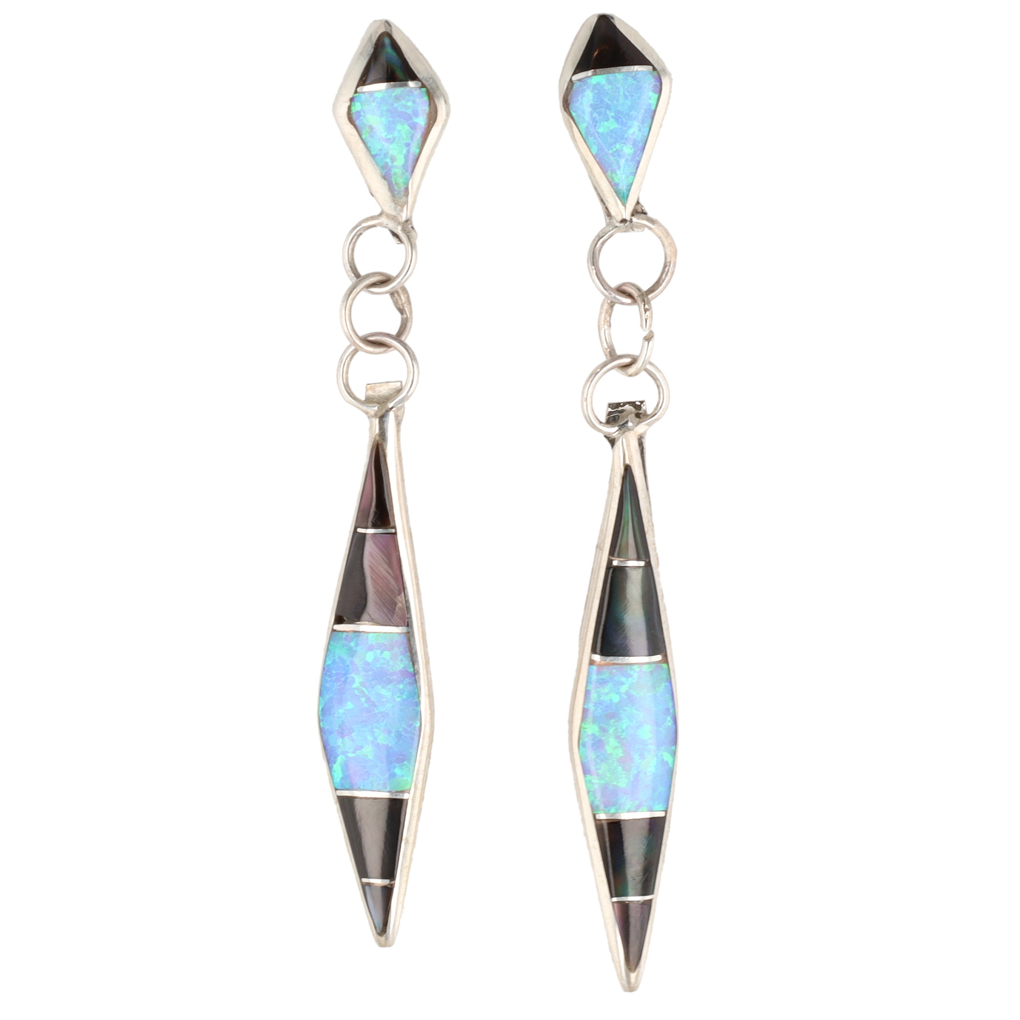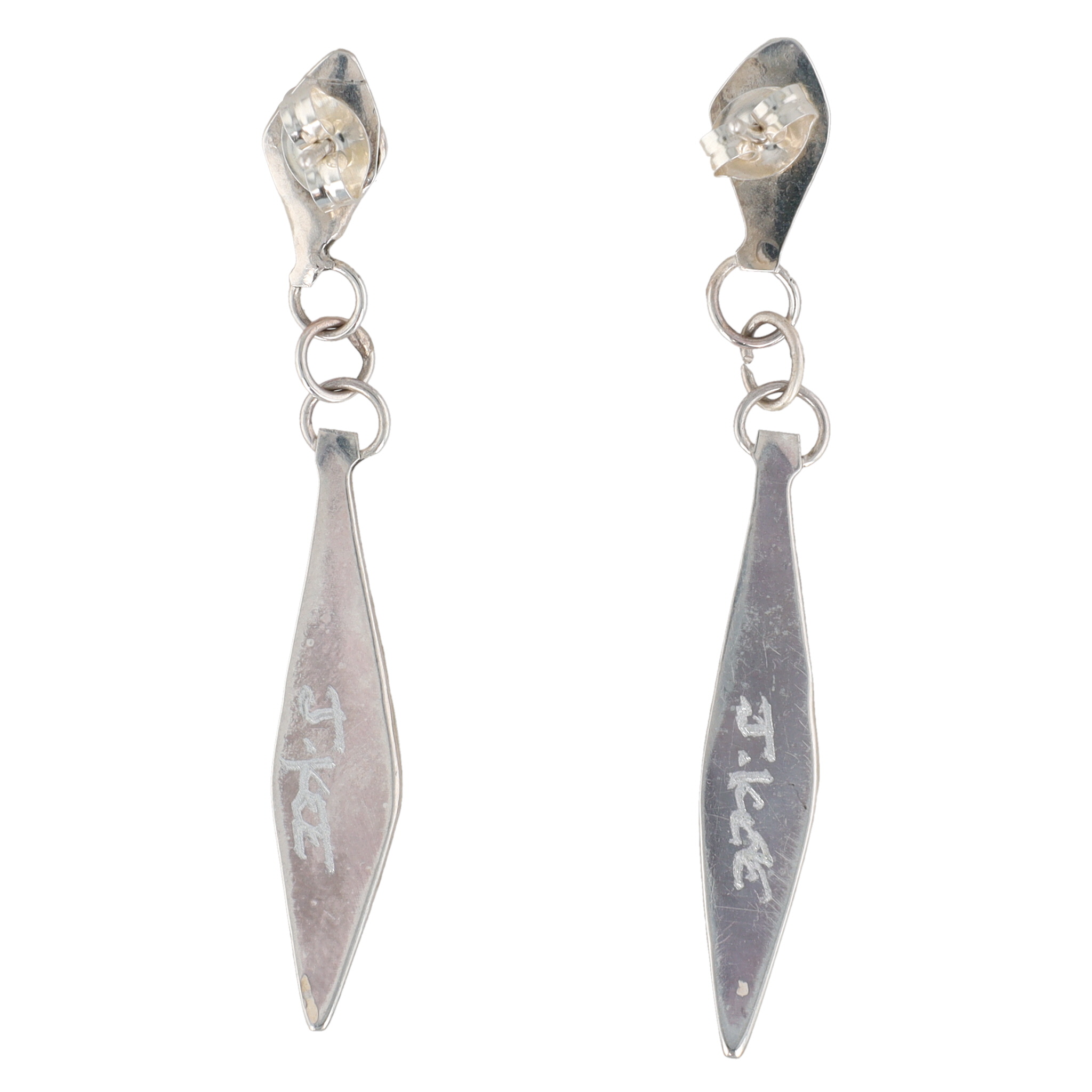 A pair of James Kee Zuni sterling silver and opal inlay drop earrings. Each earring features a modern geometric, inlaid design, crafted from sterling silver. They comprise a diamond-shaped upper section and an elongated, tapering lower section, connected by two rings. Both sections incorporate contrasting inlay of vibrant blue iridescent opal and solid onyx. The reverse of each earring is visibly marked "J. Kee" in etched script.