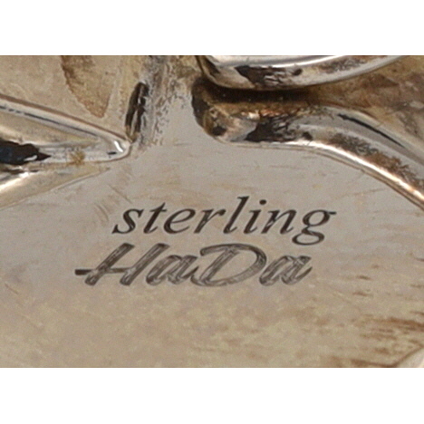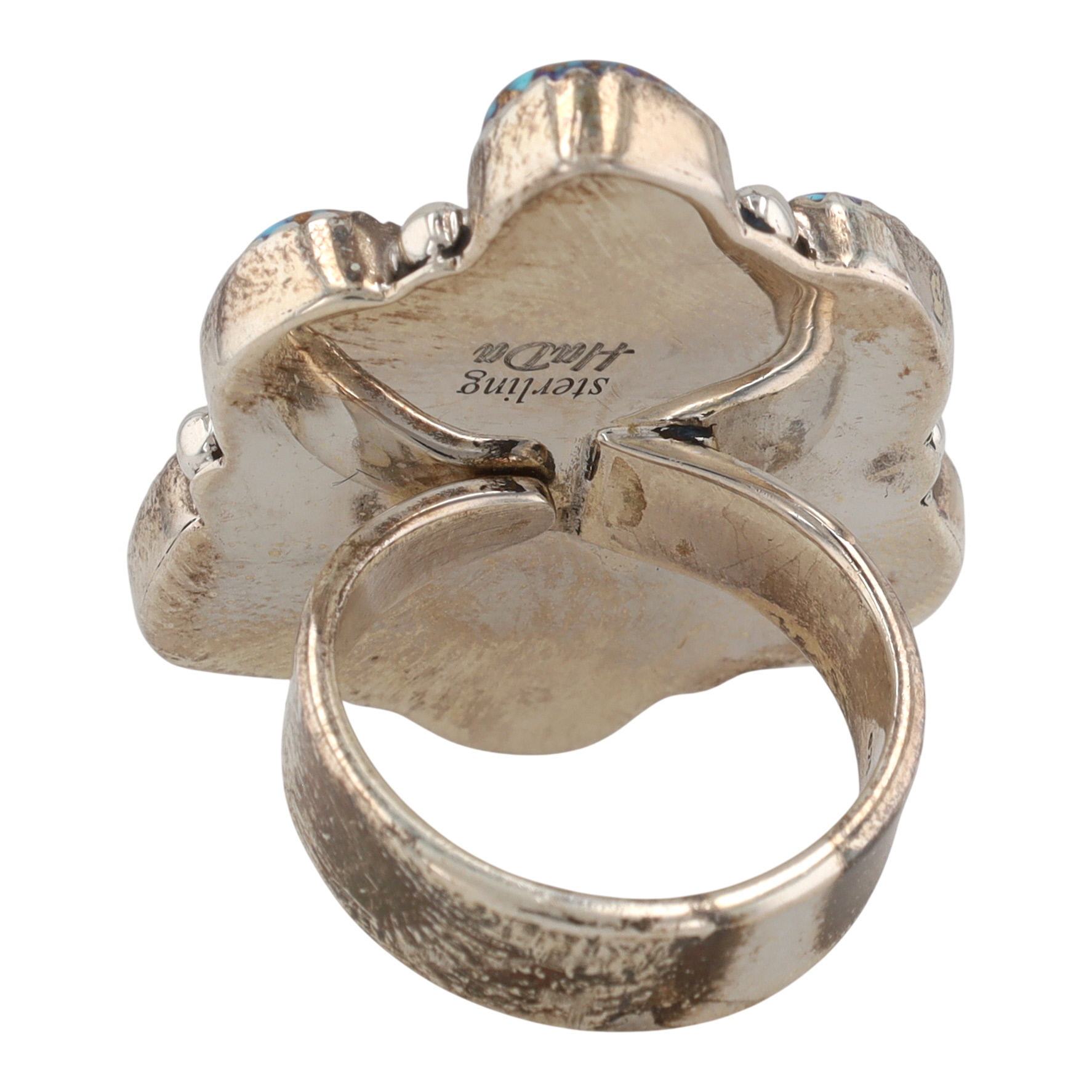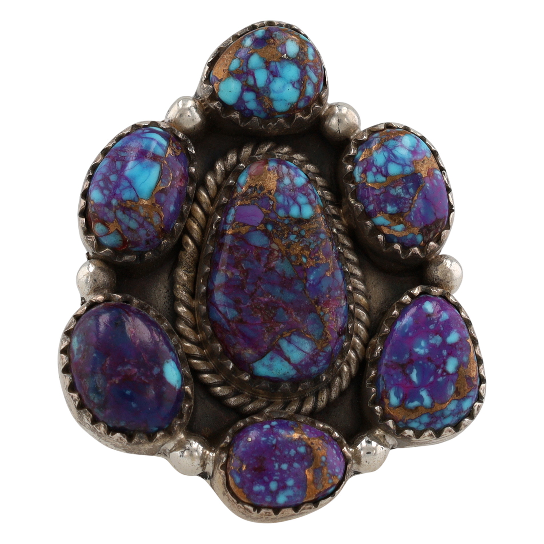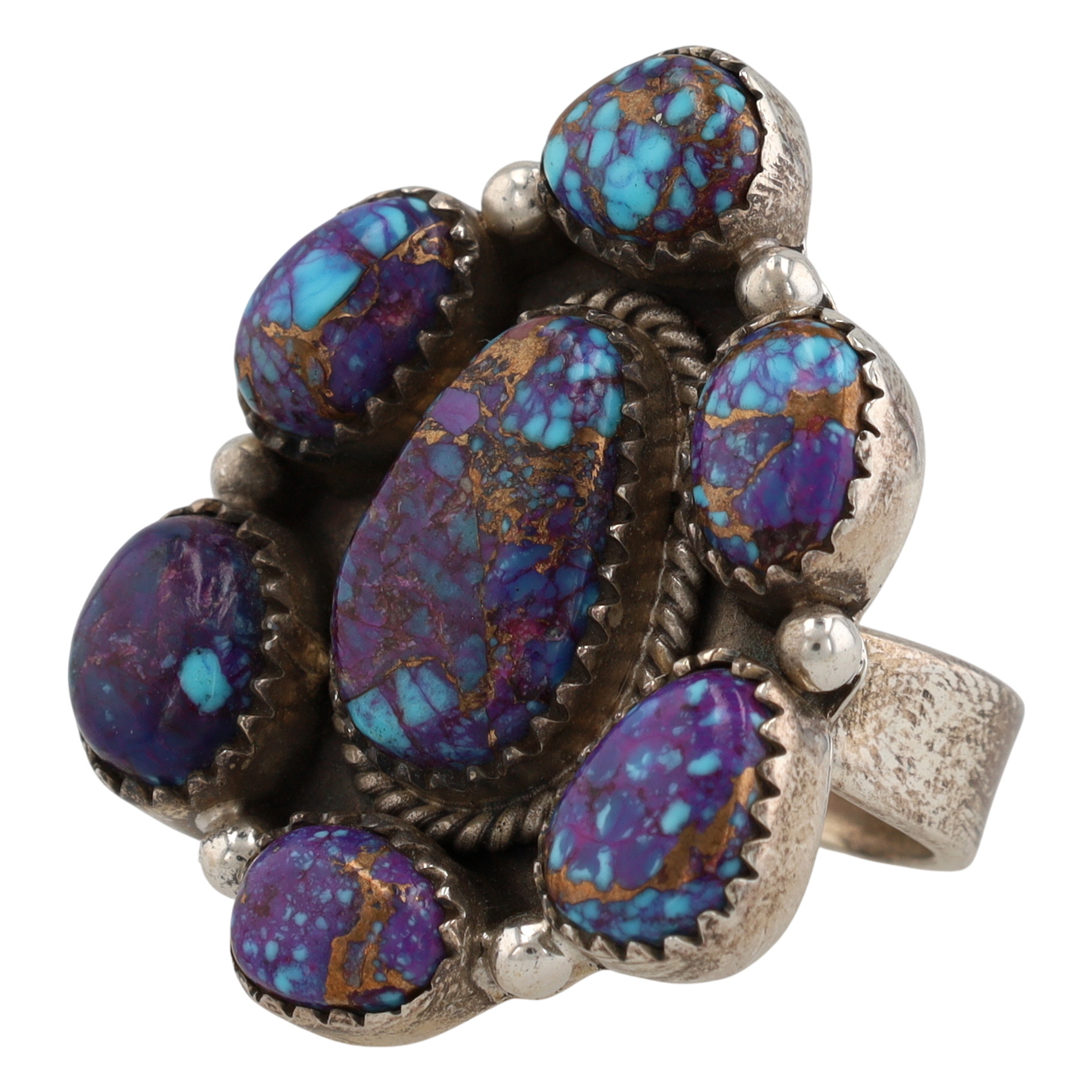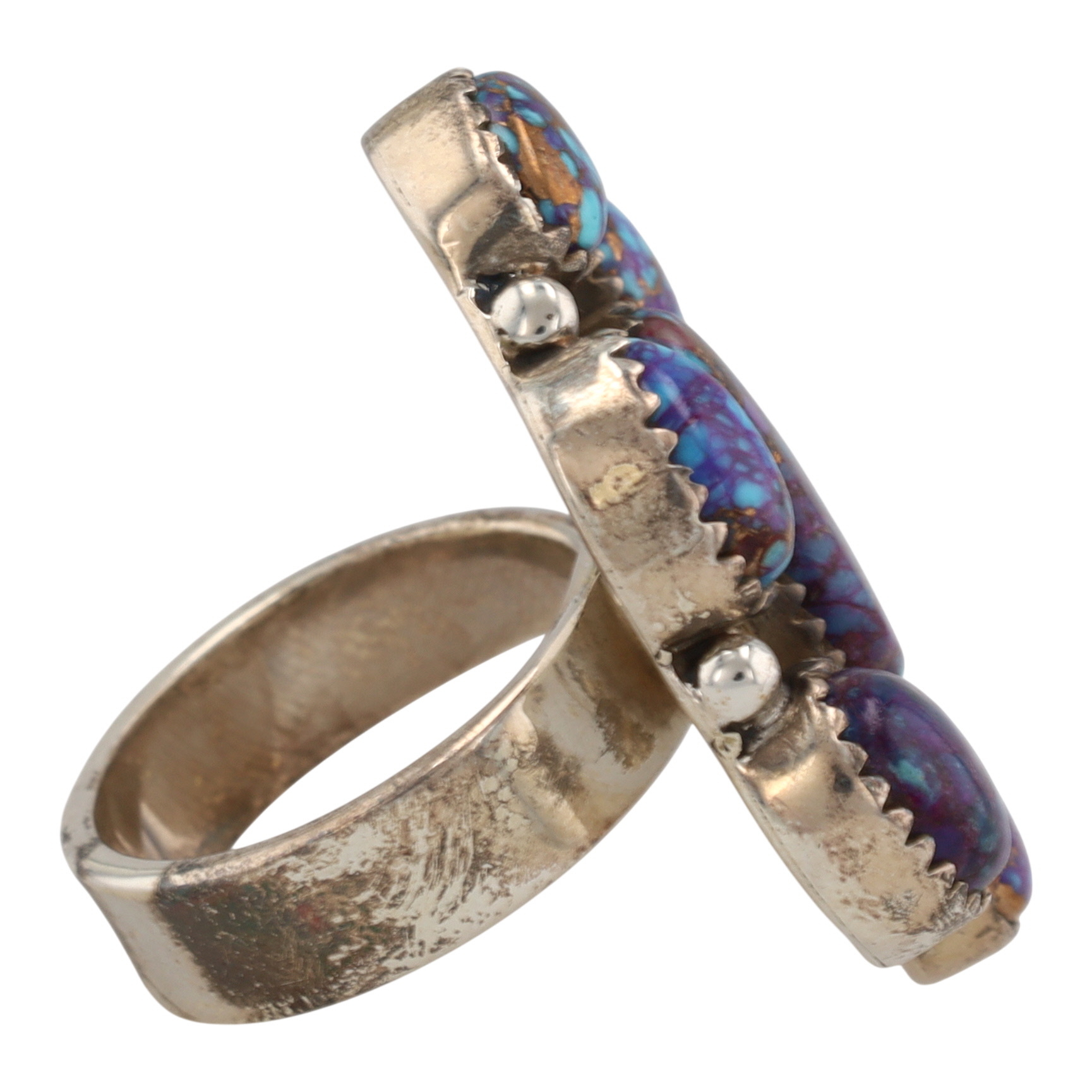 A HaDa Sterling Silver Purple Mojave Turquoise Cluster Ring. This cluster-style finger ring features a central elongated cabochon stone surrounded by six smaller, similarly shaped stones. The stones display a distinctive mottled pattern of predominantly purple and blue hues with significant golden-brown matrix, identified as Purple Mojave, a composite with turquoise. Each stone is set in a scalloped bezel, and the central stone is further accented by rope-twist detailing. The interior of the band is marked ‘sterling’ and ‘HaDa’.