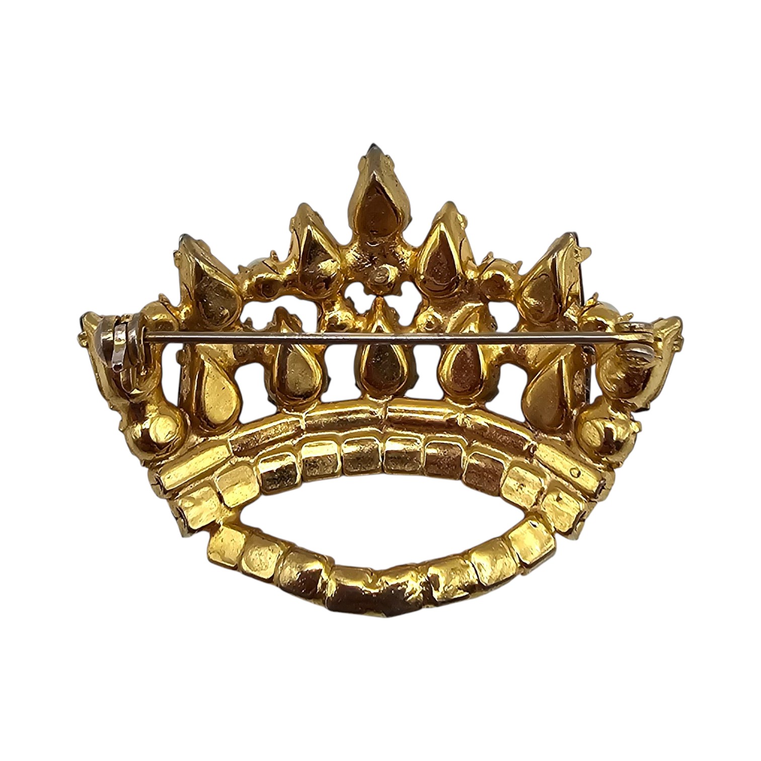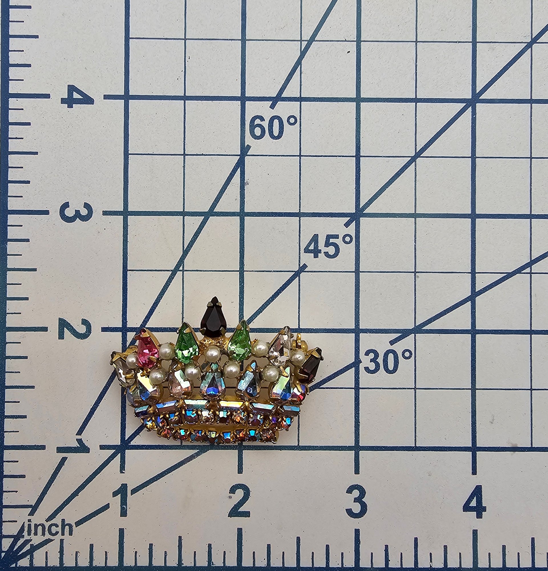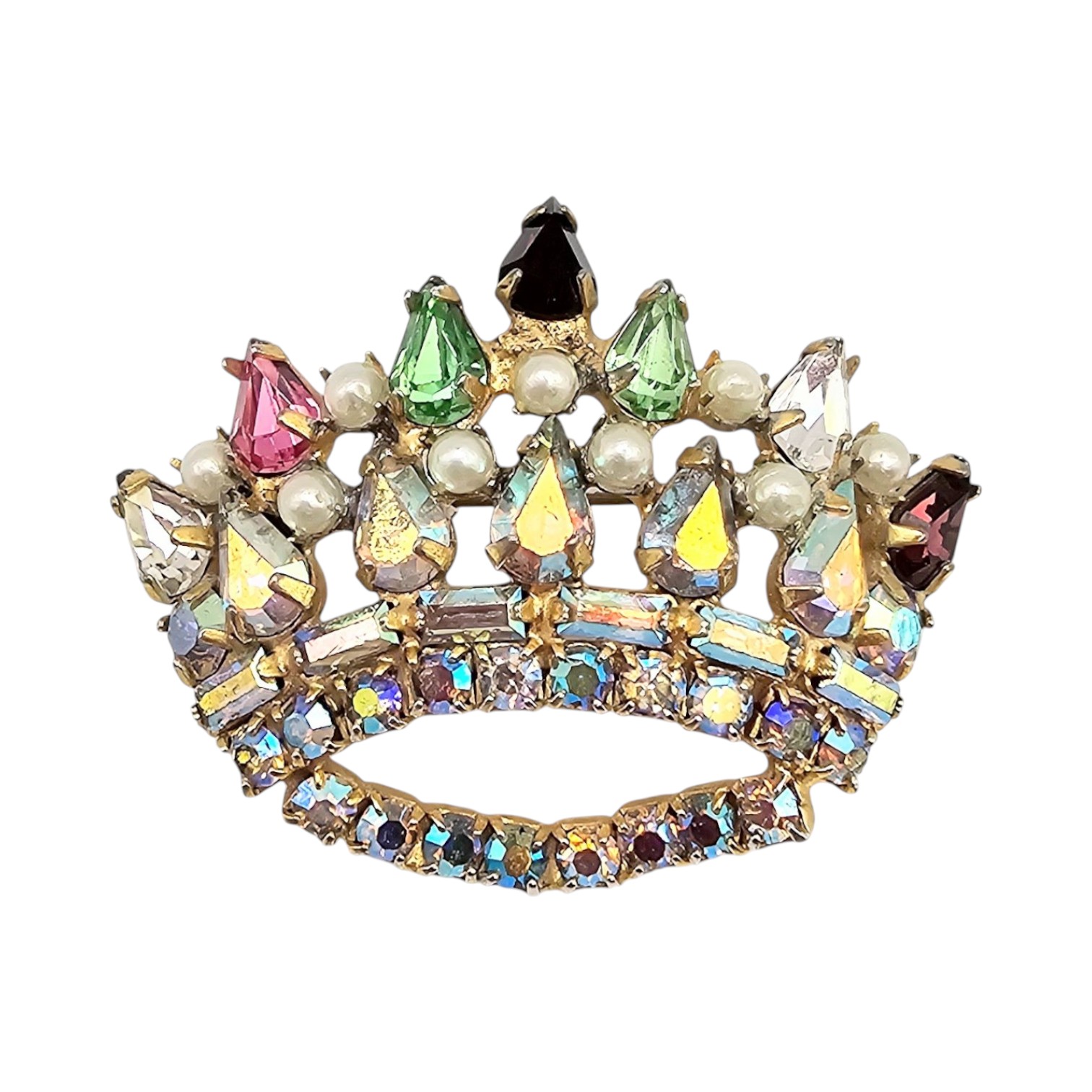 Vintage Iridescent Rhinestone Faux Pearl Silver Tone Crown Brooch