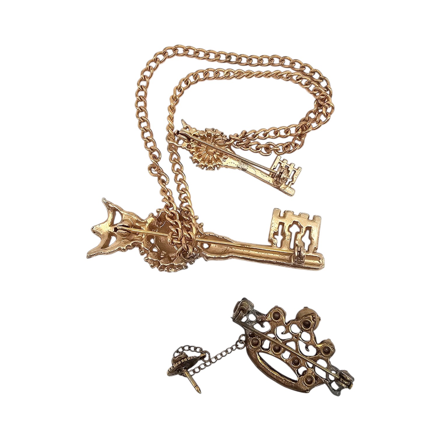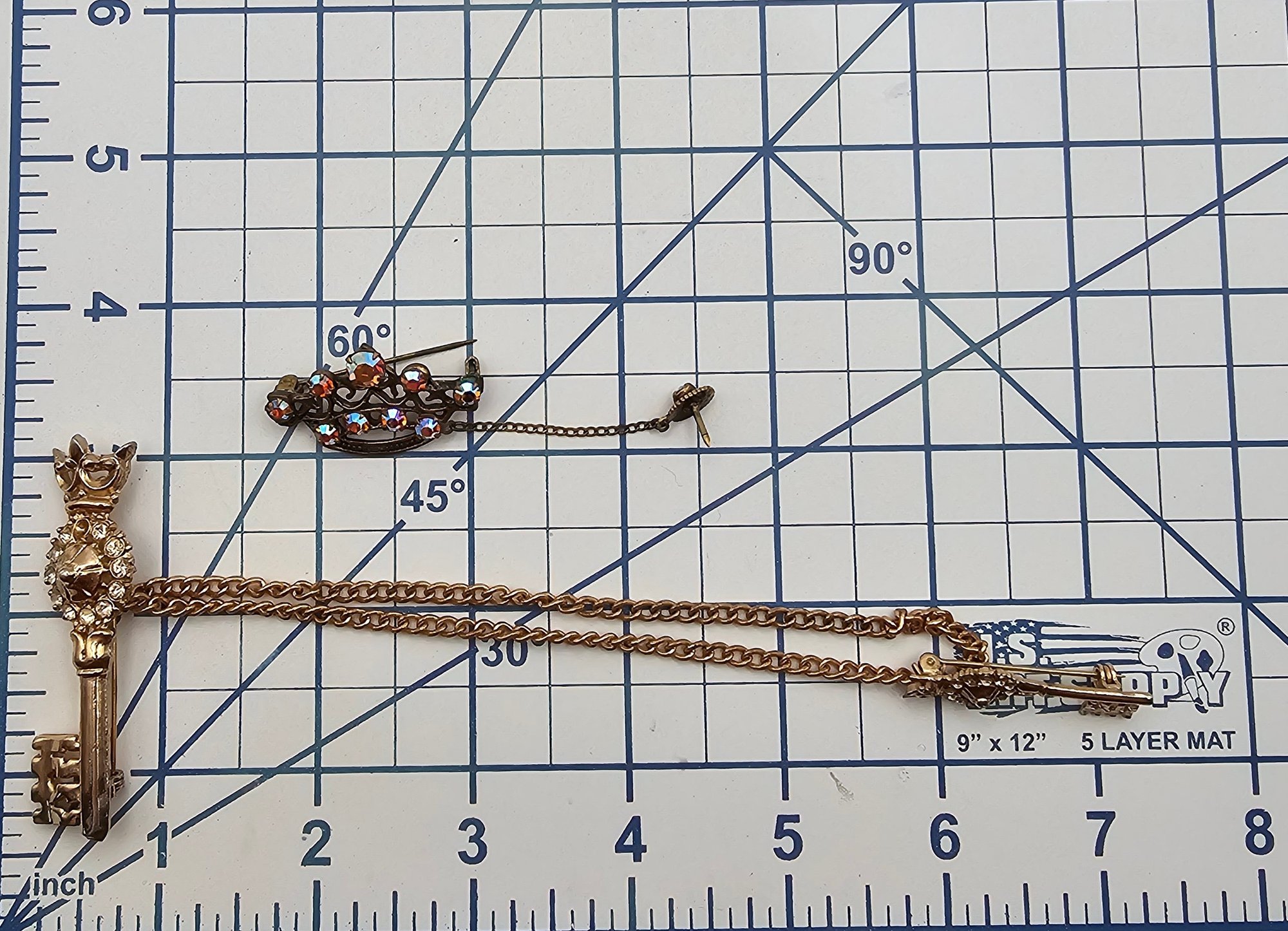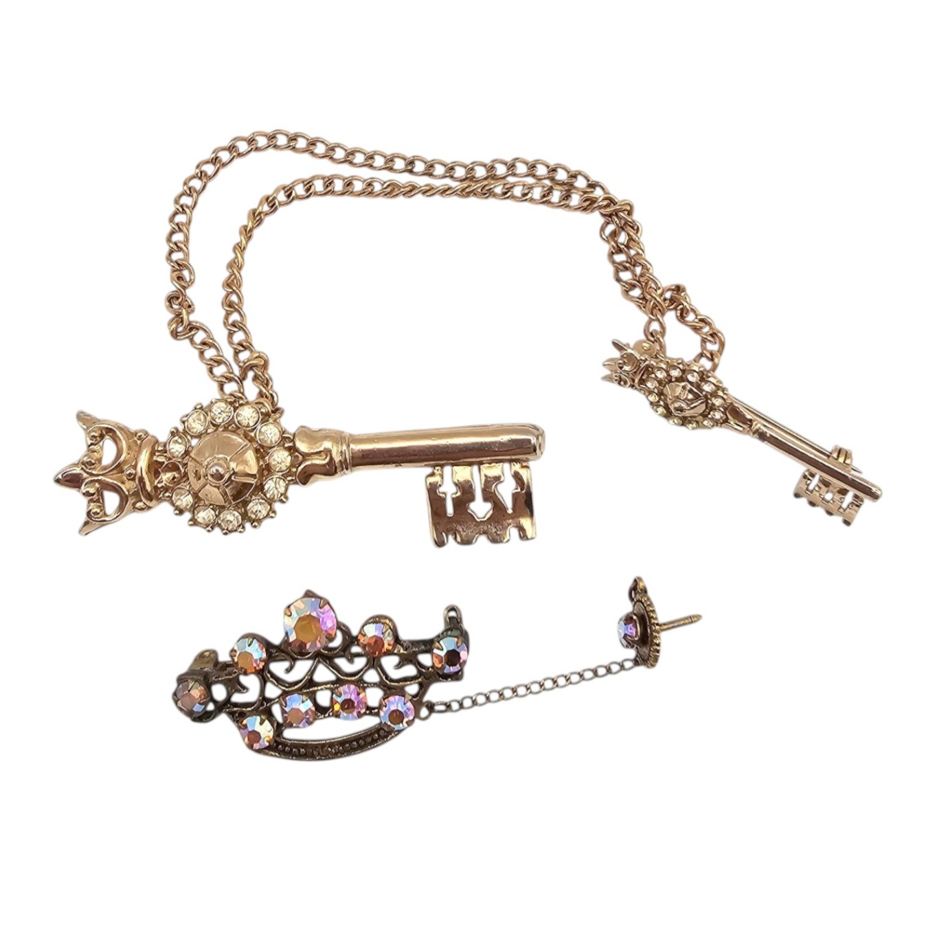 Vintage Iridescent Rhinestone Gold Tone Key Crown Crown Brooches