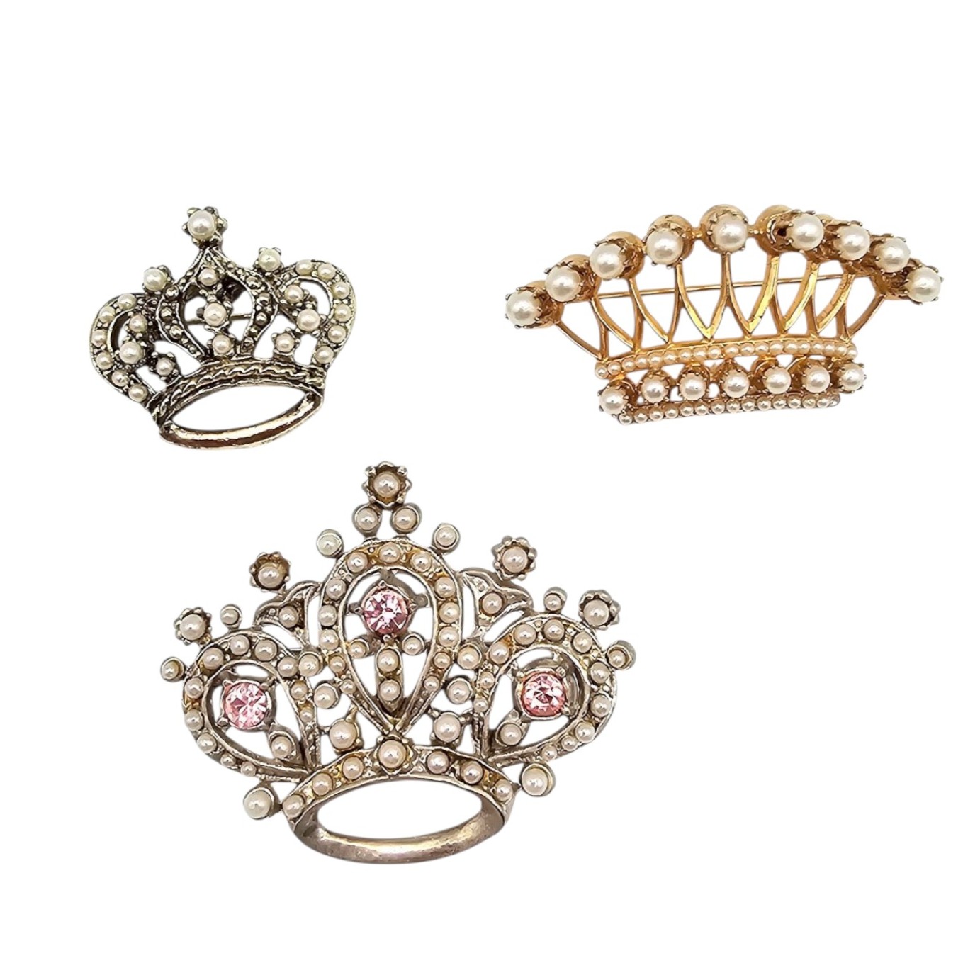 Vintage Lot 3 Faux Pearl Rhinestone Crown Brooches