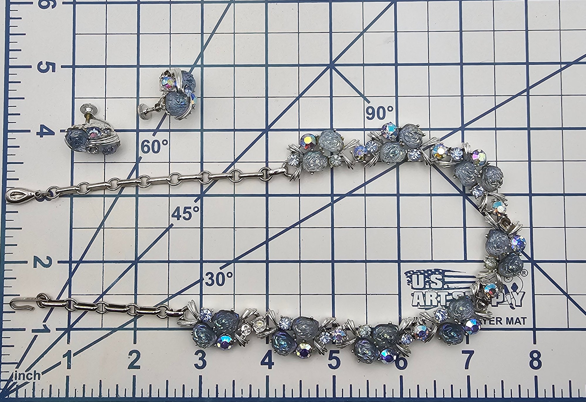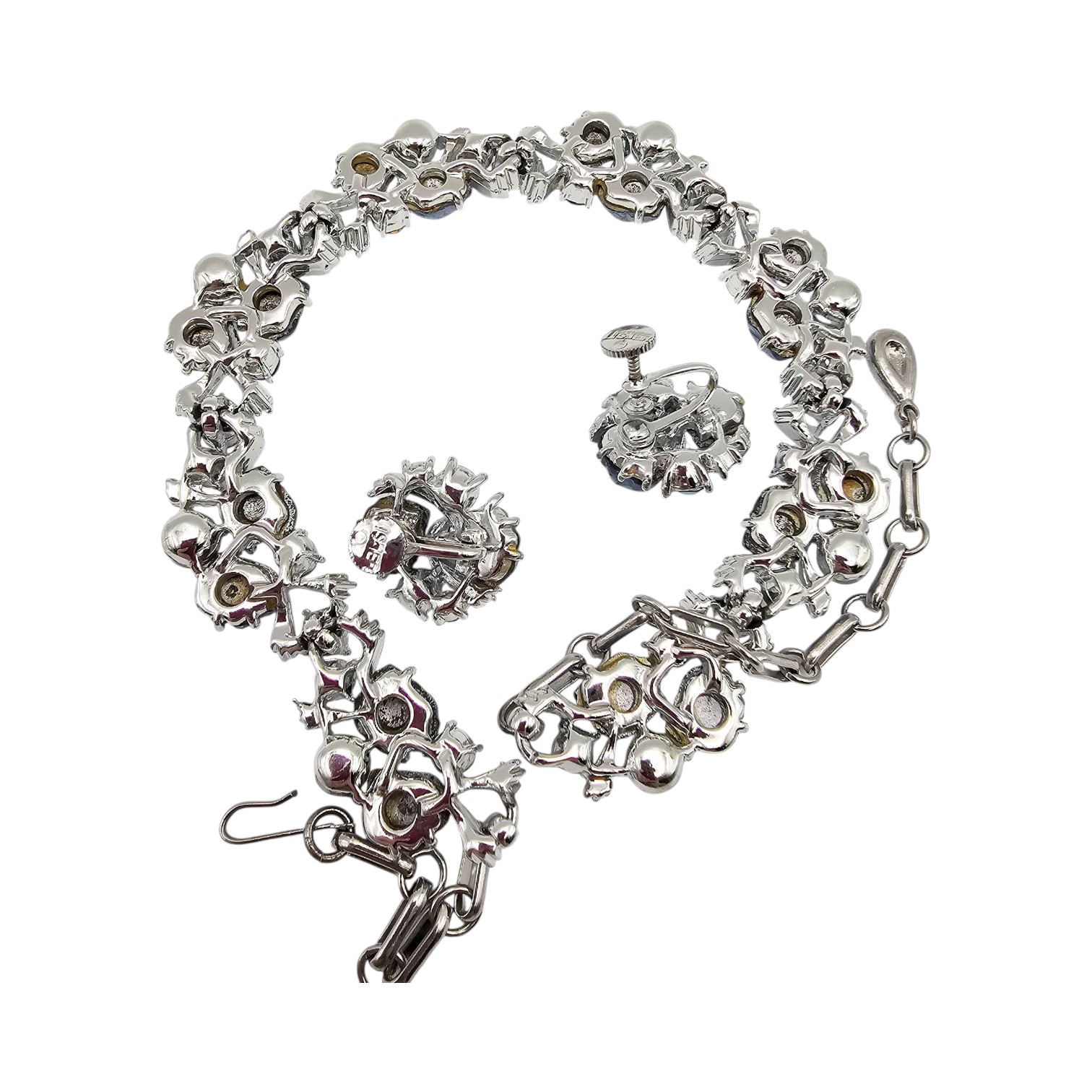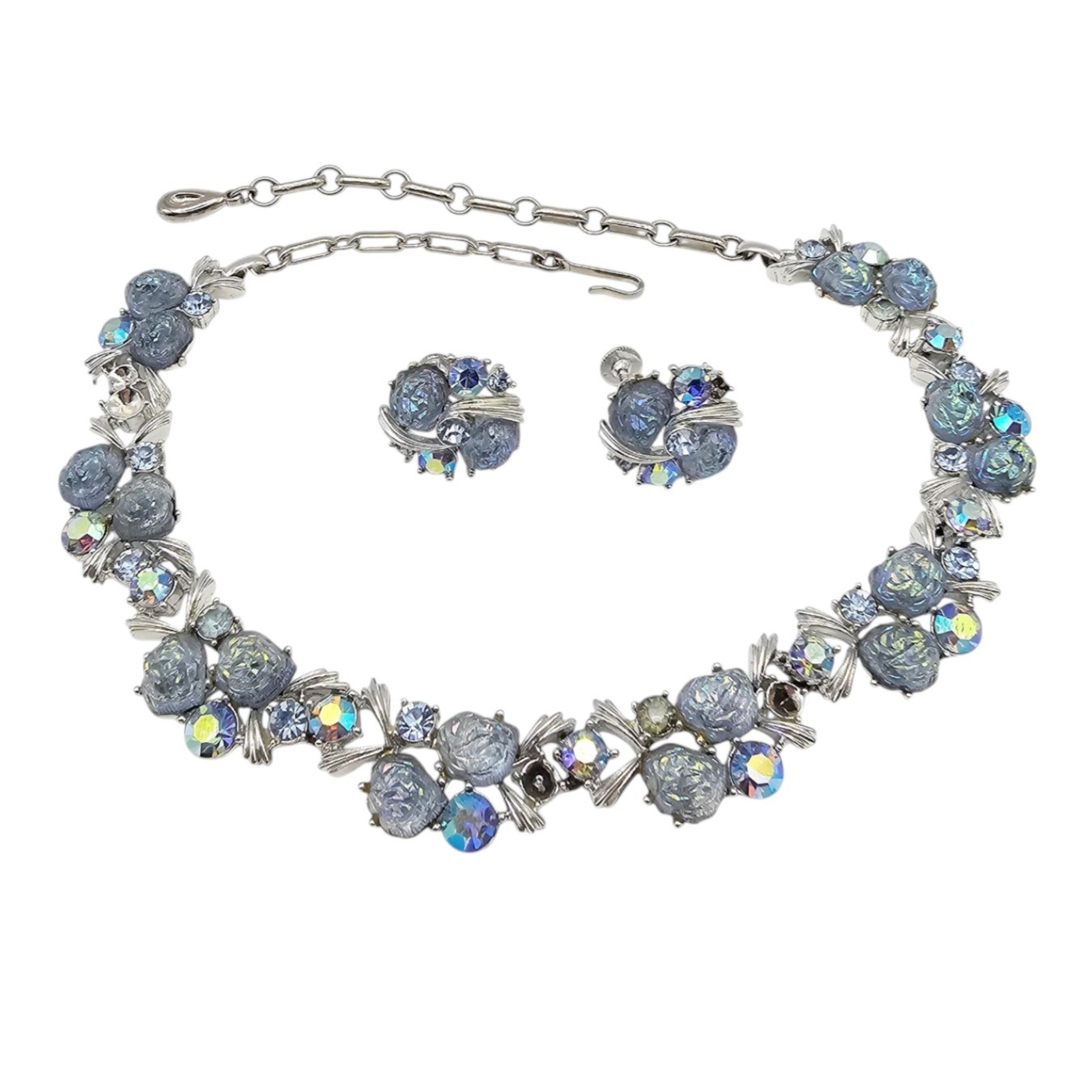 Lisner Vintage Blue Poured glass Silver Tone Rhinestone Necklace Earrings Set