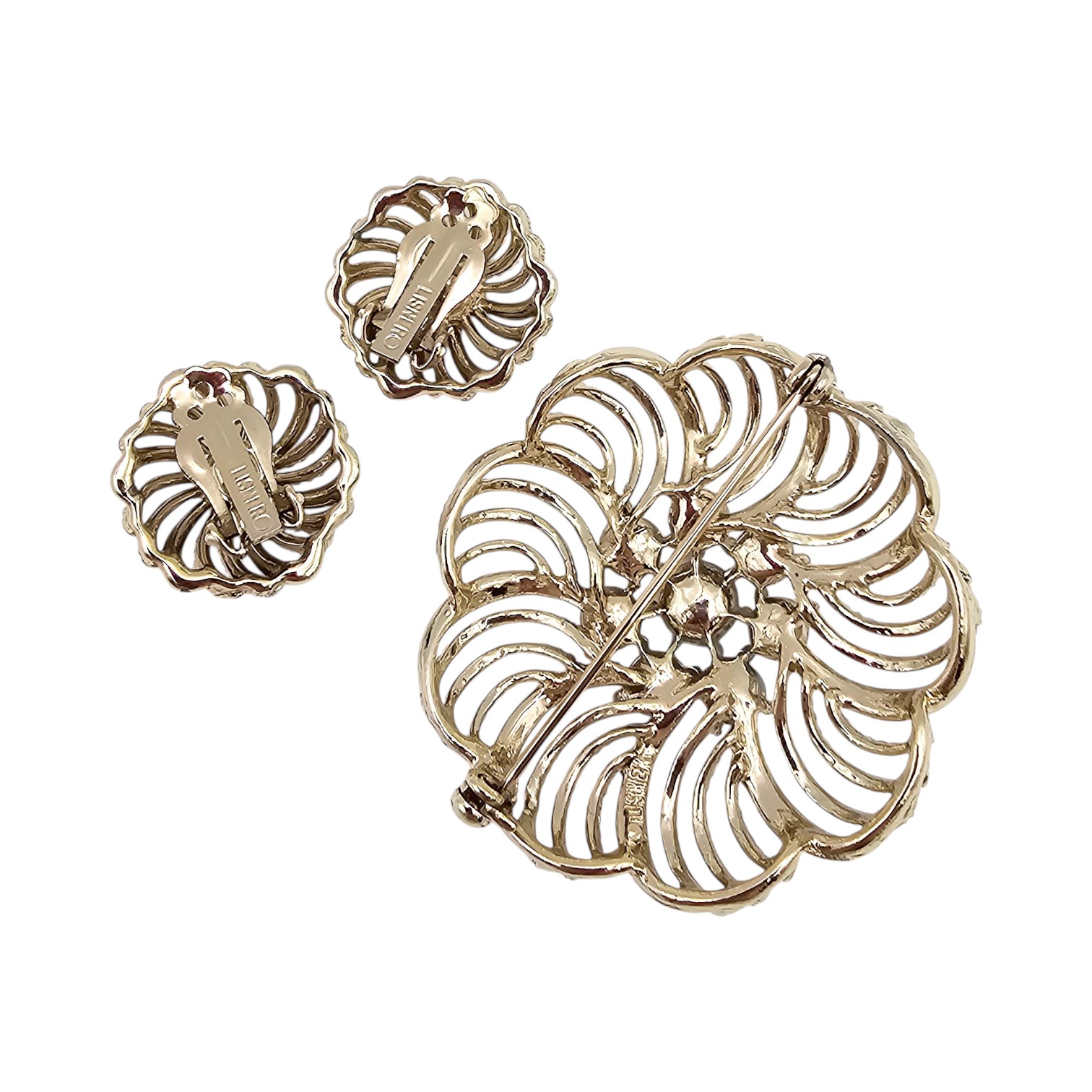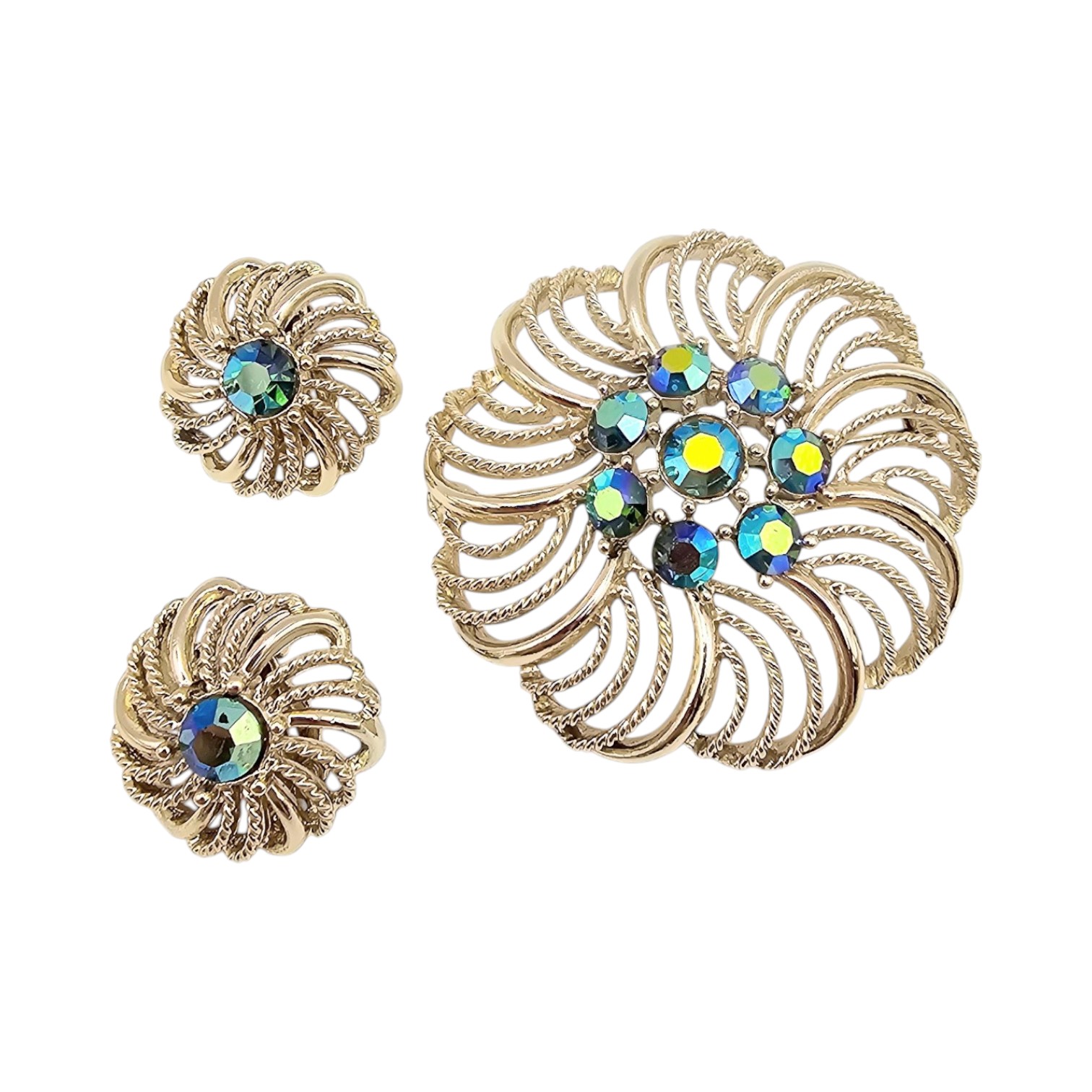 Lisner Vintage Green Aurora Borealis Gold Tone Flower Brooch Earrings Set