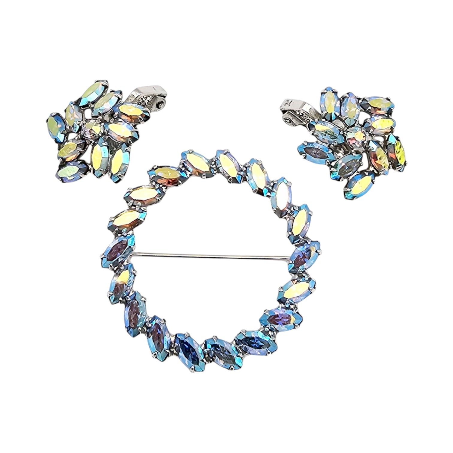 B David Iridescent Rhinestone Wreath Brooch Earrings Set