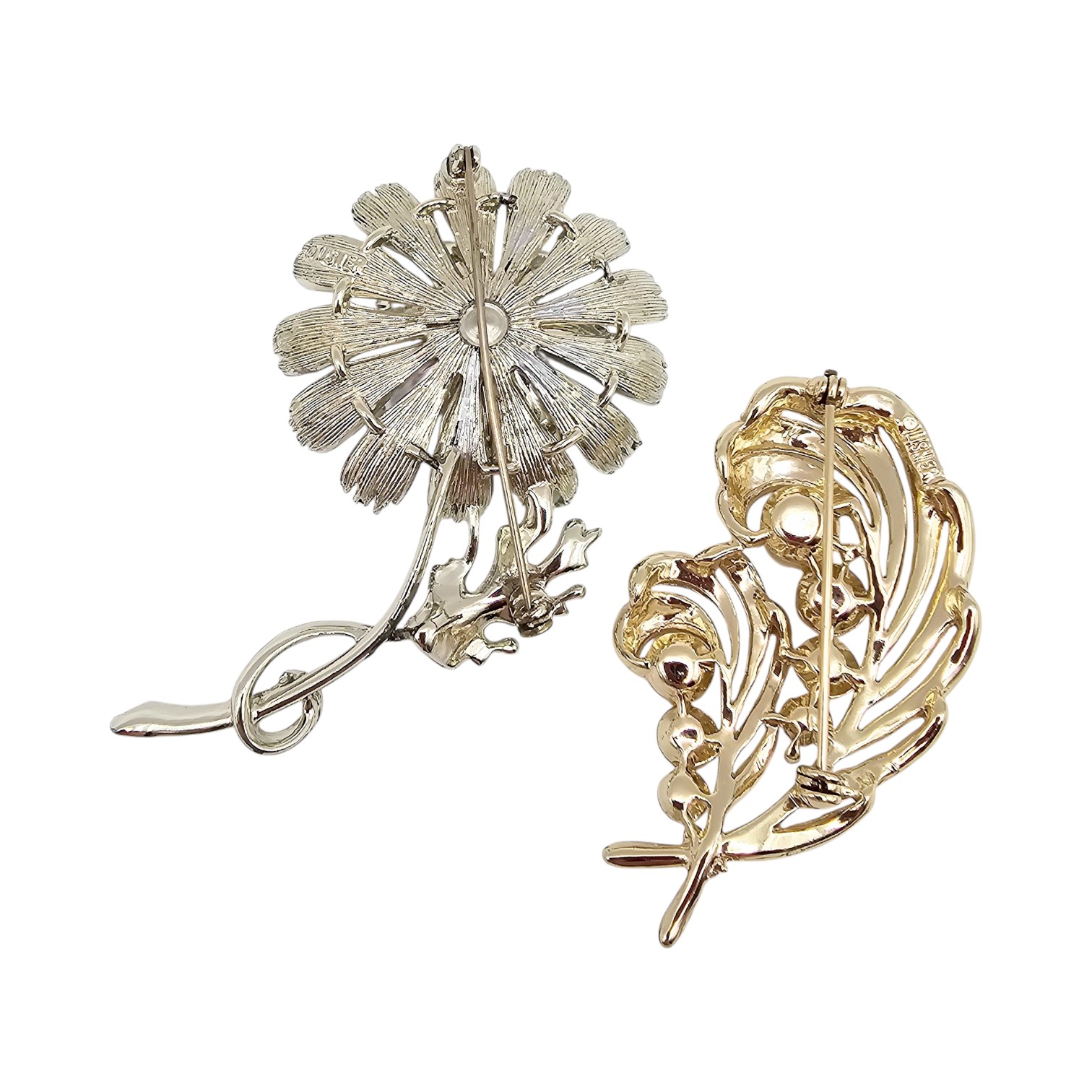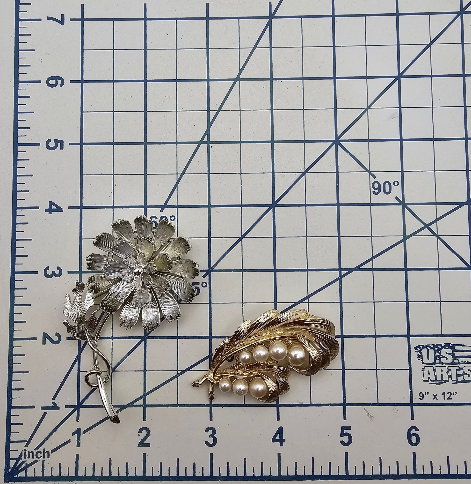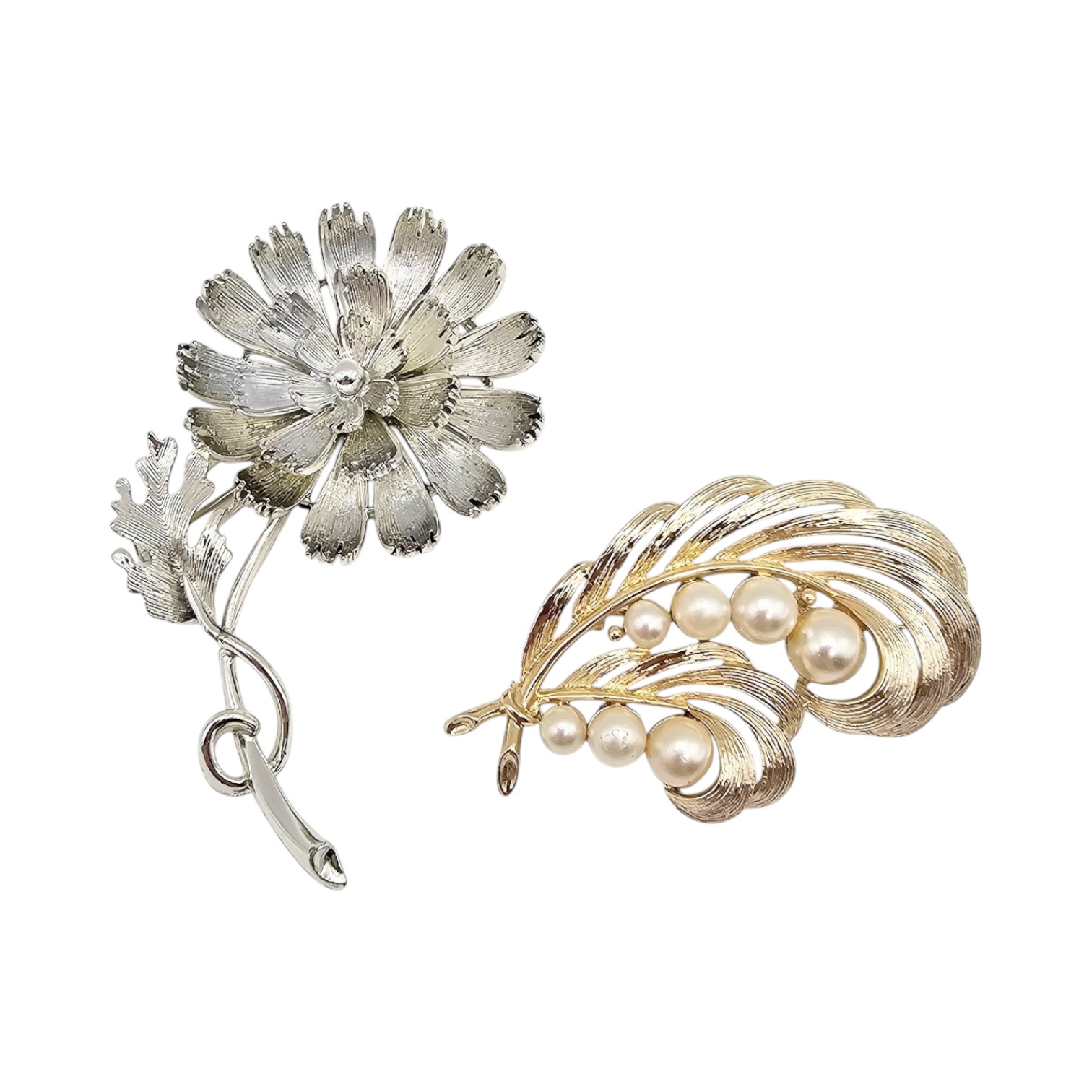 Lisner Vintage Lot 2 Faux Pearl Gold Tone Silver Tone Leaf Brooches