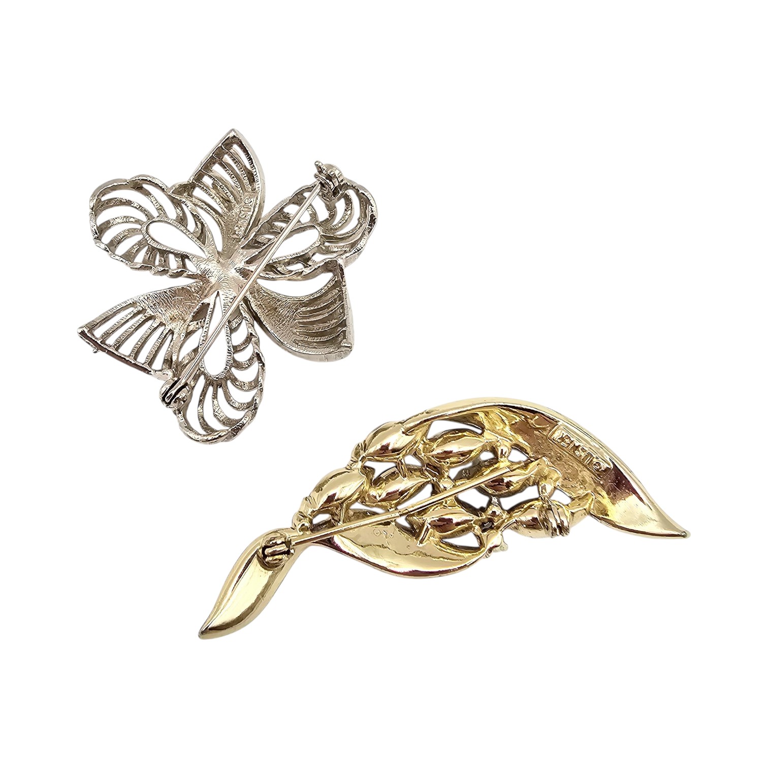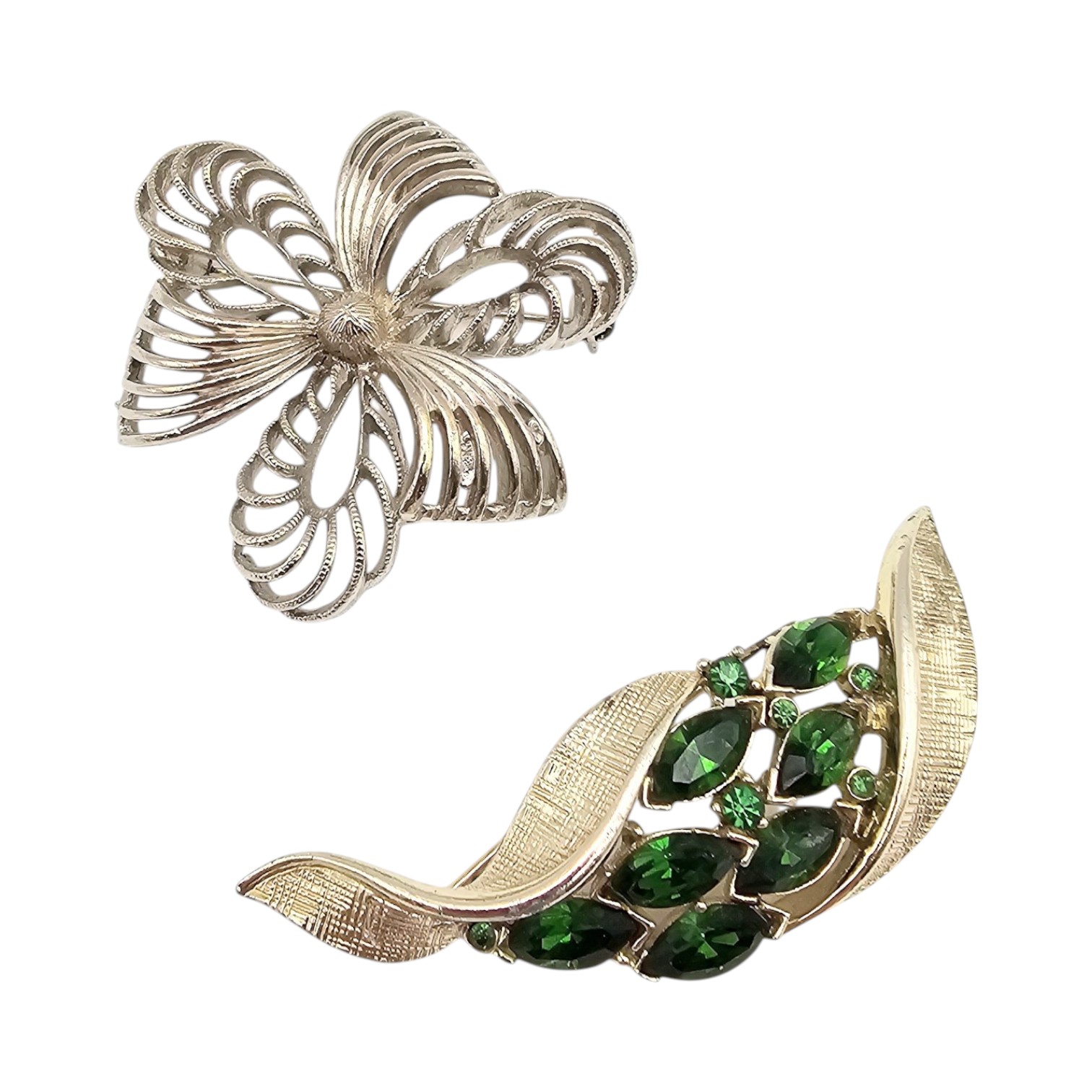 Lisner Vintage Lot 2 Green Rhinestone Silver Tone Gold Tone Brooches