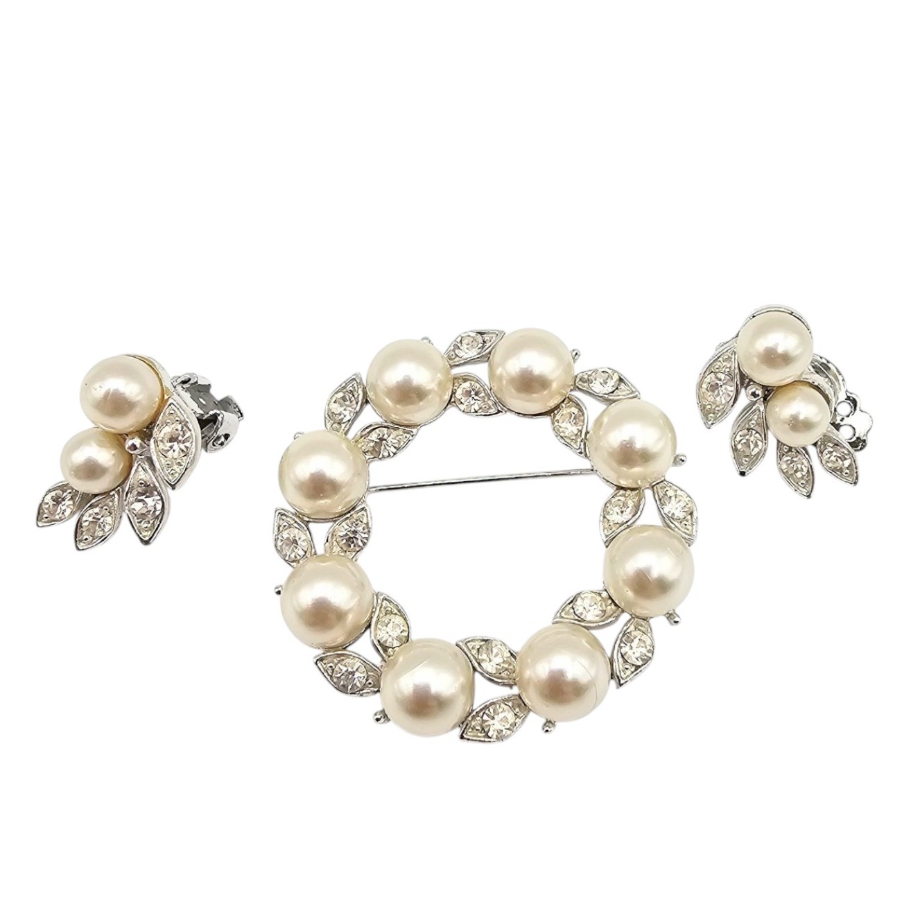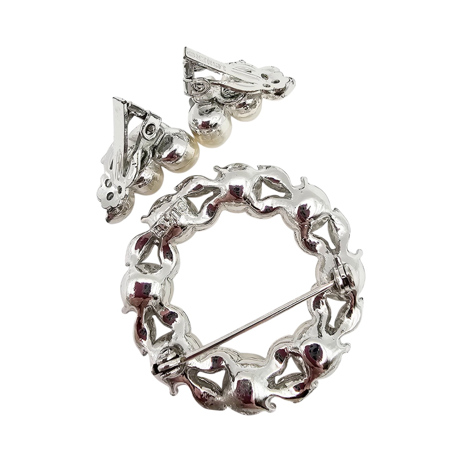Lisner Vintage Faux Pearl Rhinestone Silver Tone Wreath Brooch Earrings Set