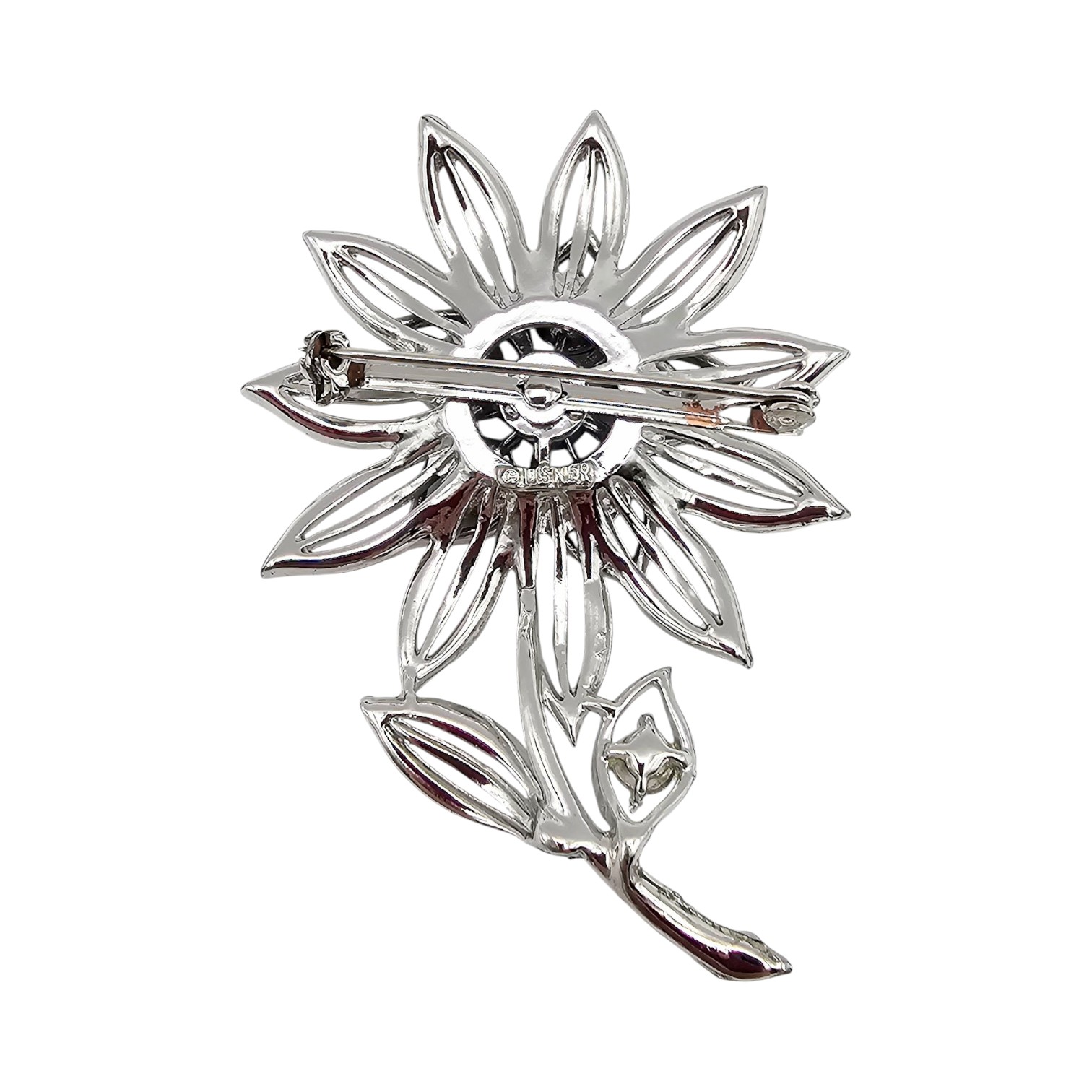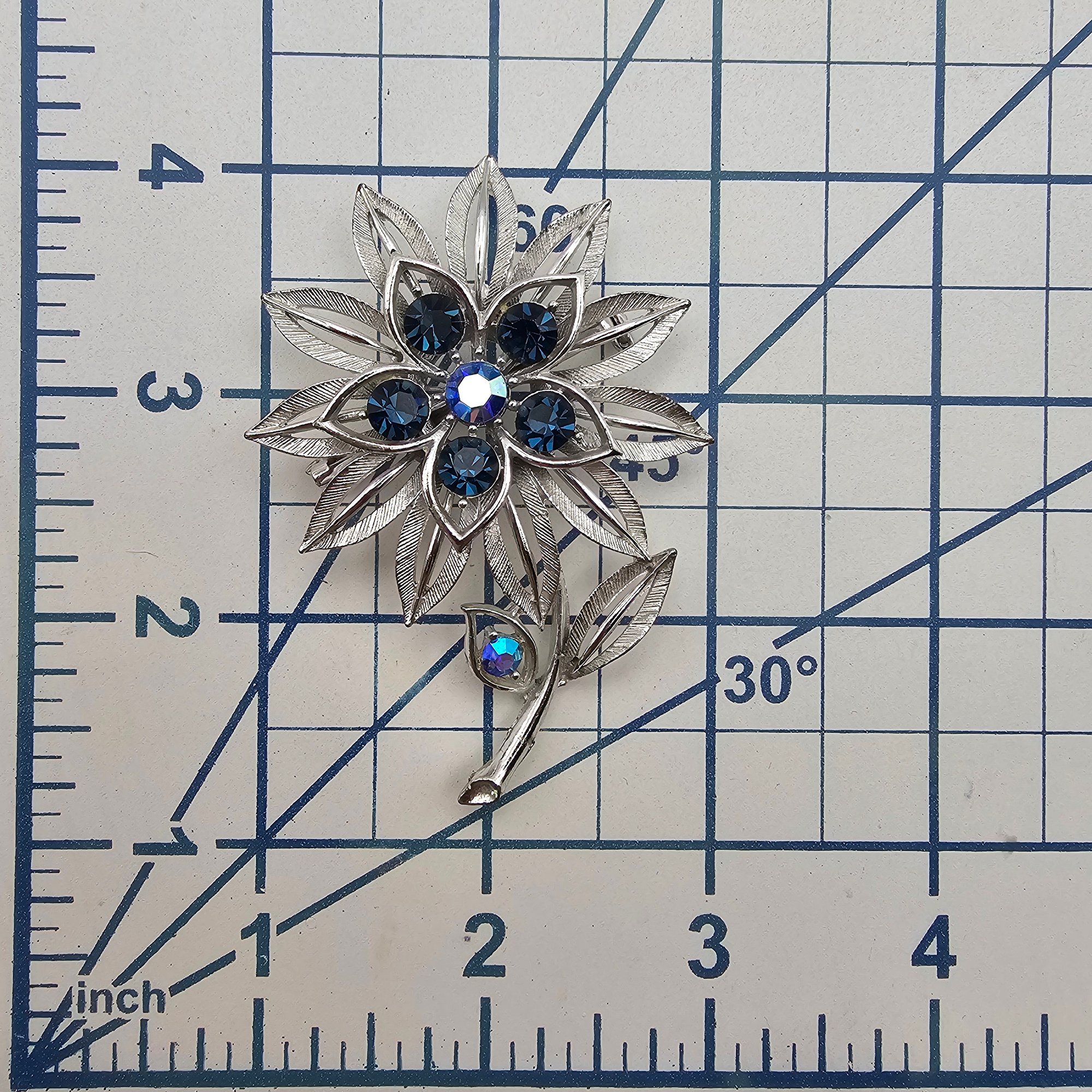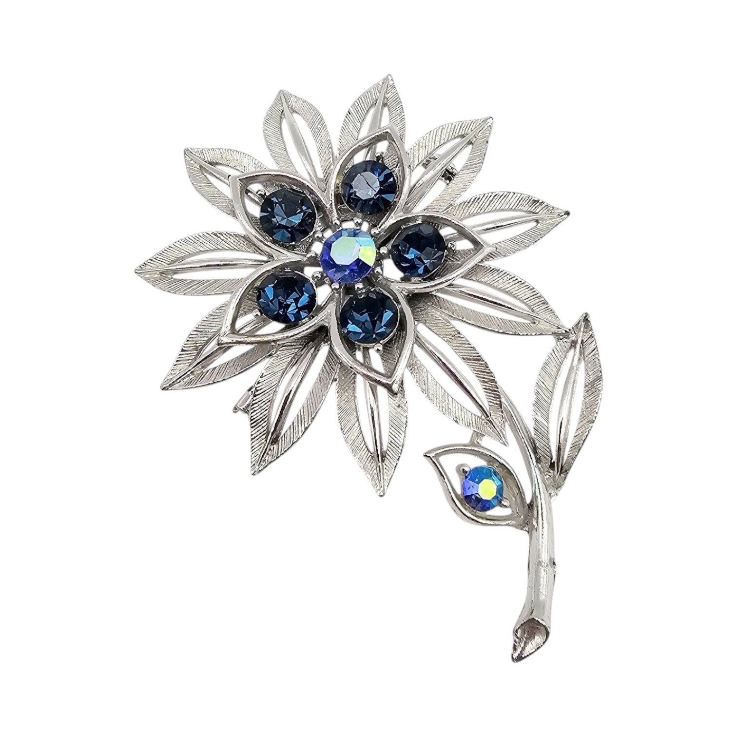 Lisner Blue Rhinestone Silver Tone Flower Brooch