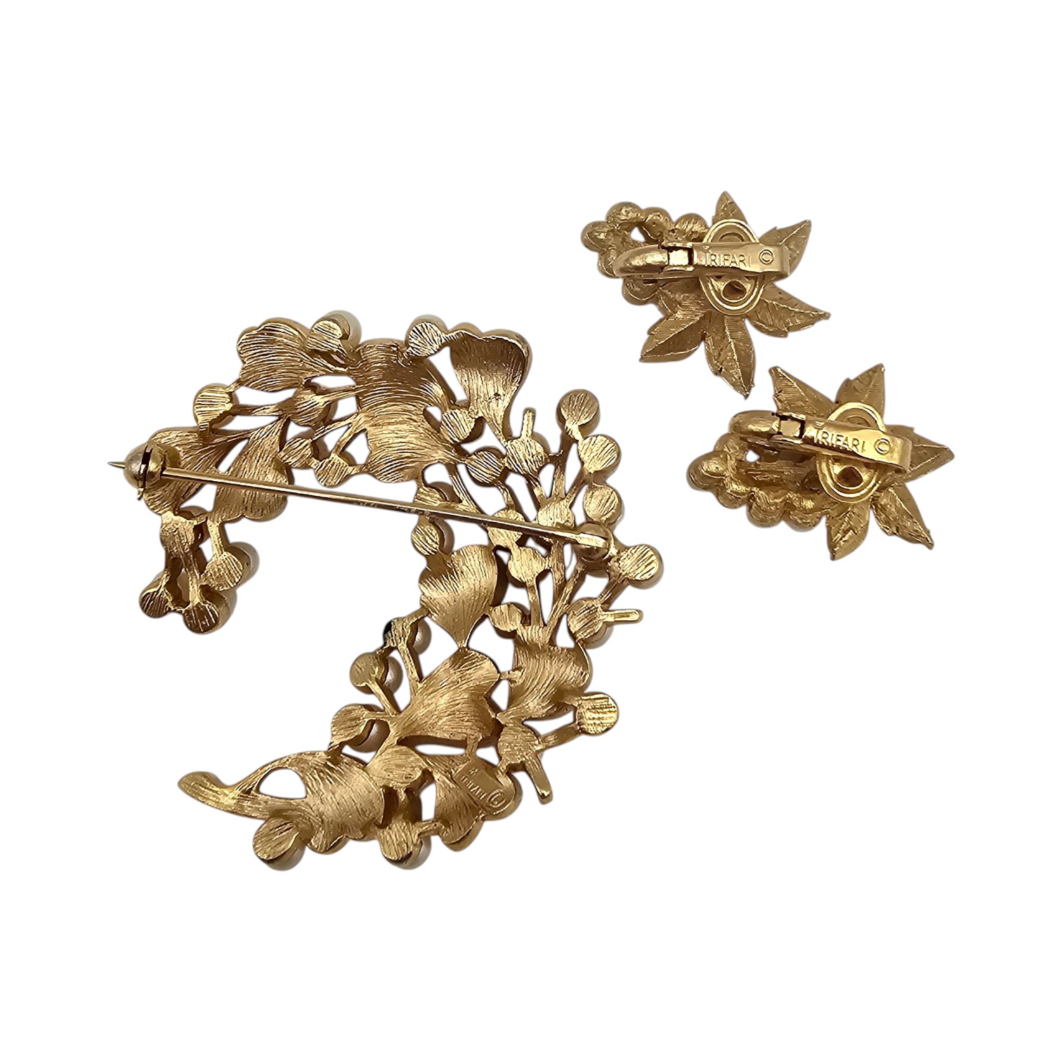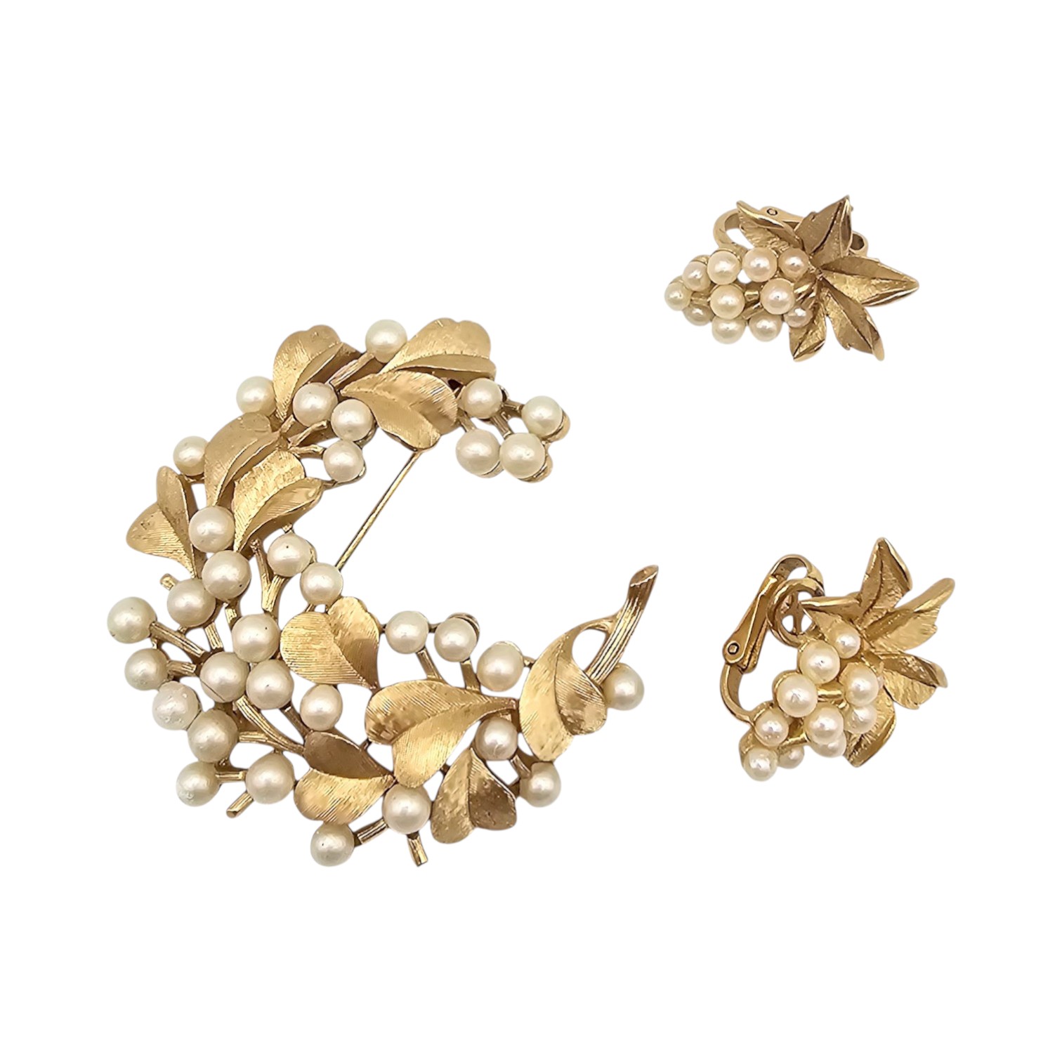 Crown Trifari Faux Pearl Gold Tone Earrings Brooch missing one faux Pearl
