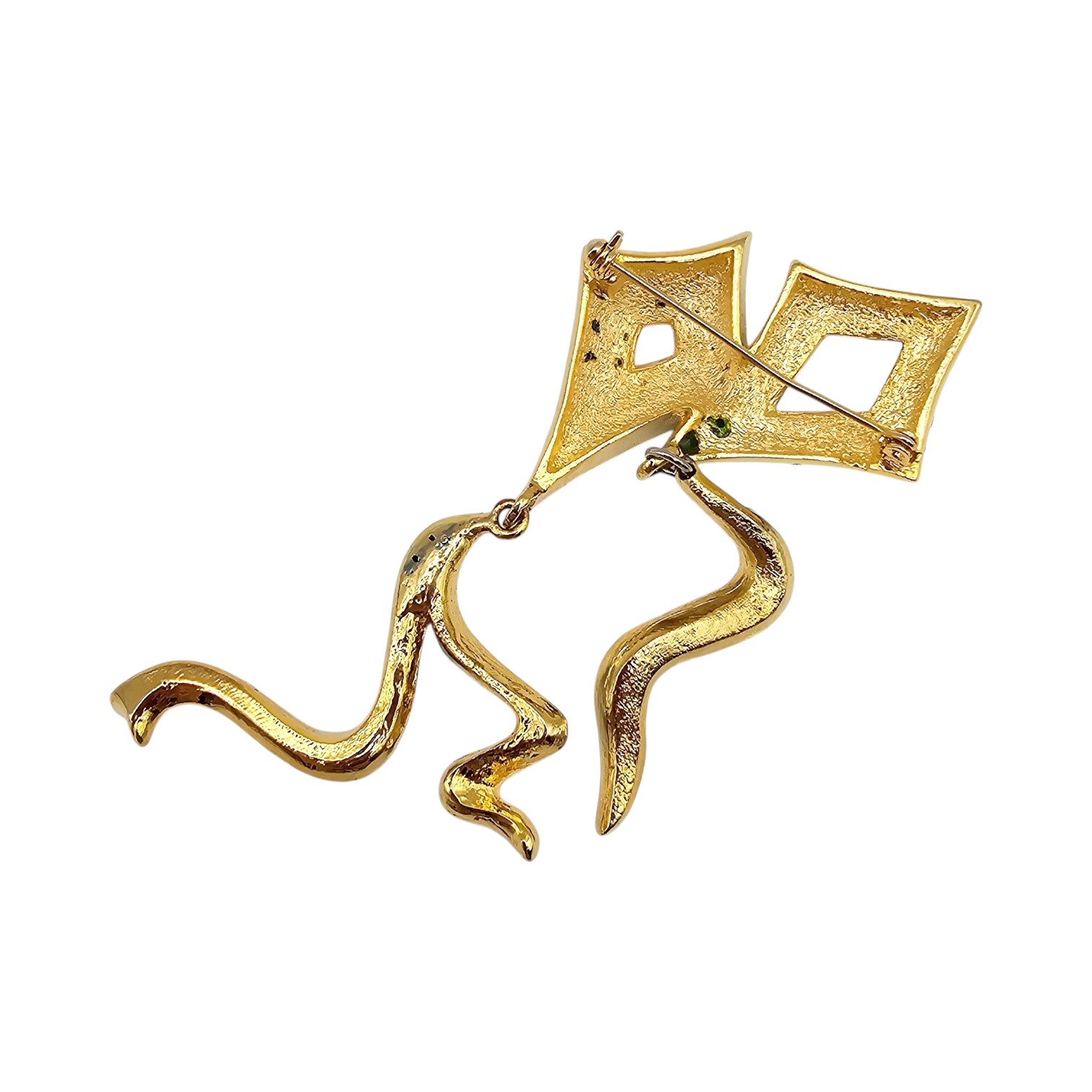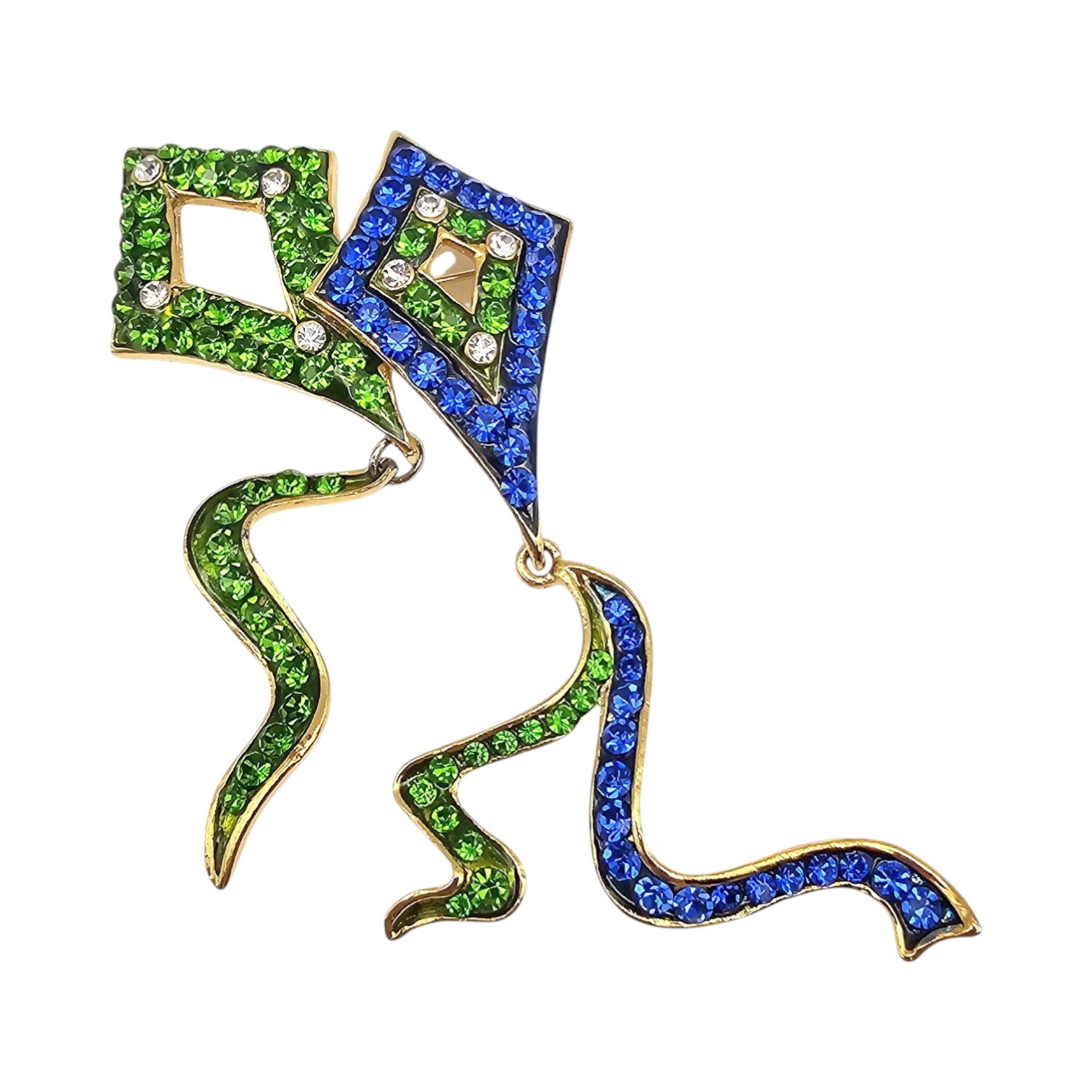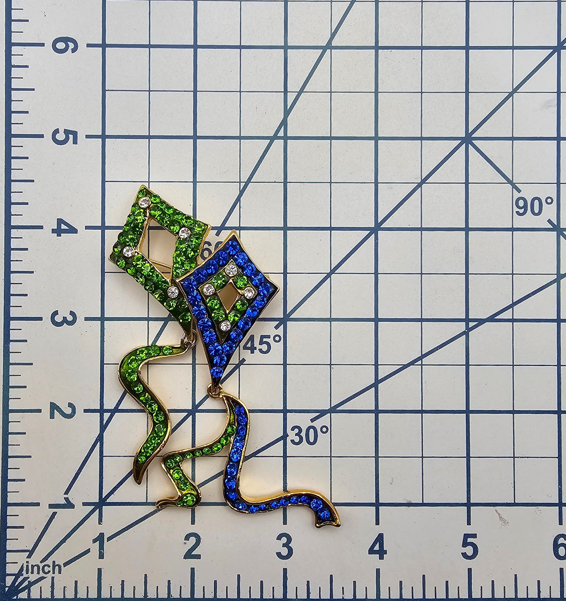 Blue Green Rhinestone Gold Tone Moving kite Brooch