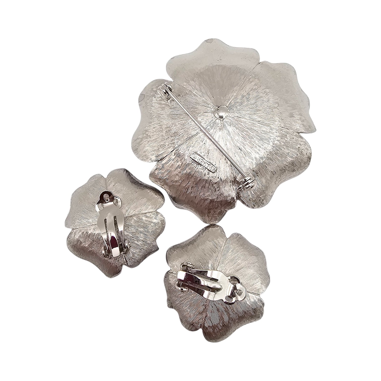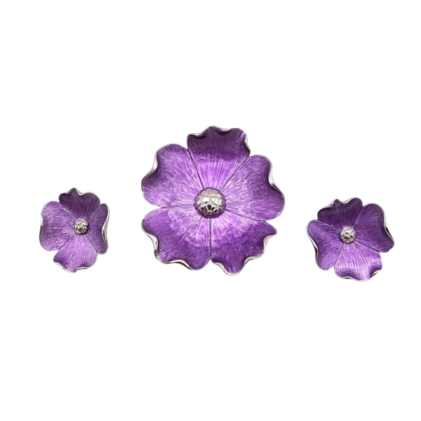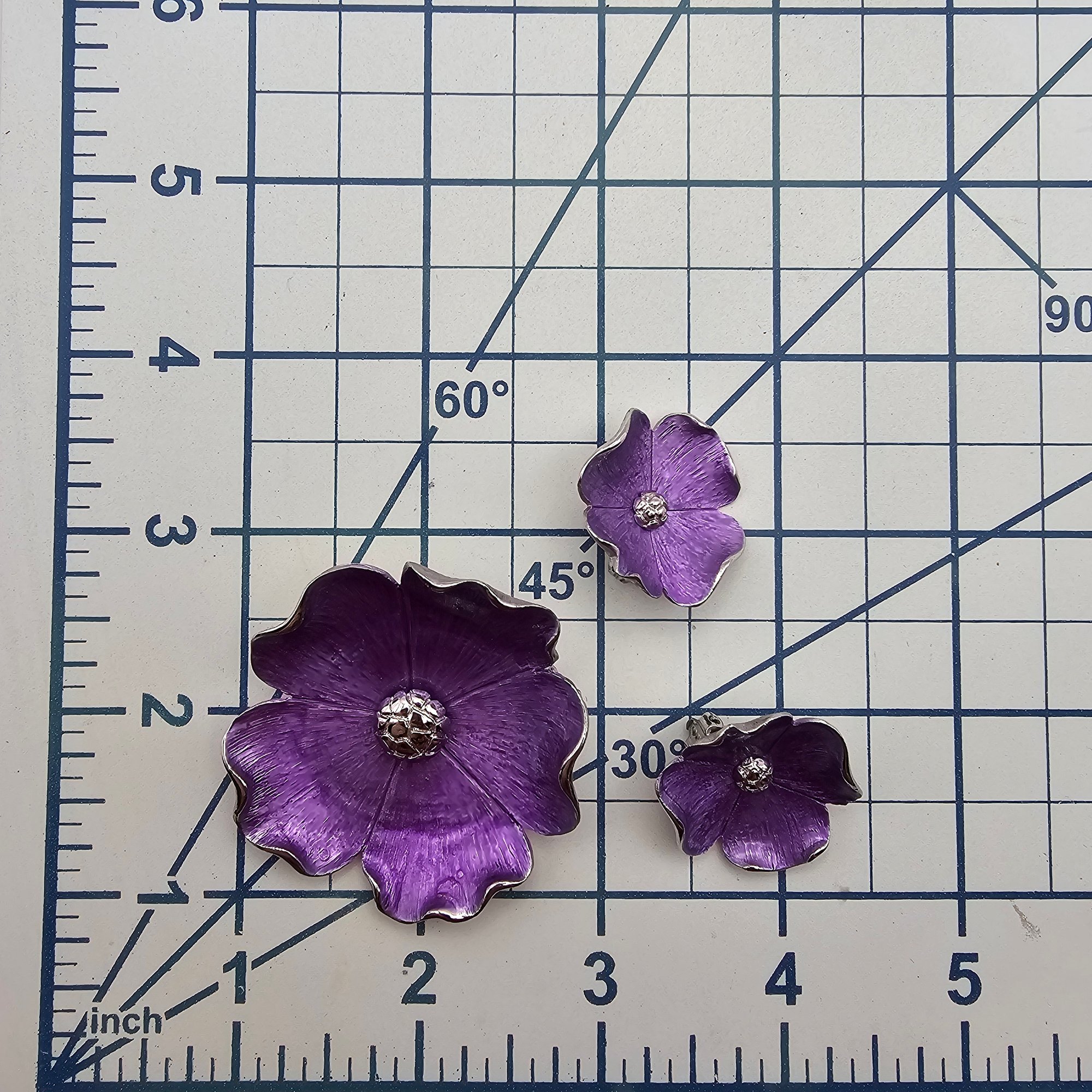 Kramer Vintage Purple Enamel Silver Tone Open Flower Brooch Earrings Set