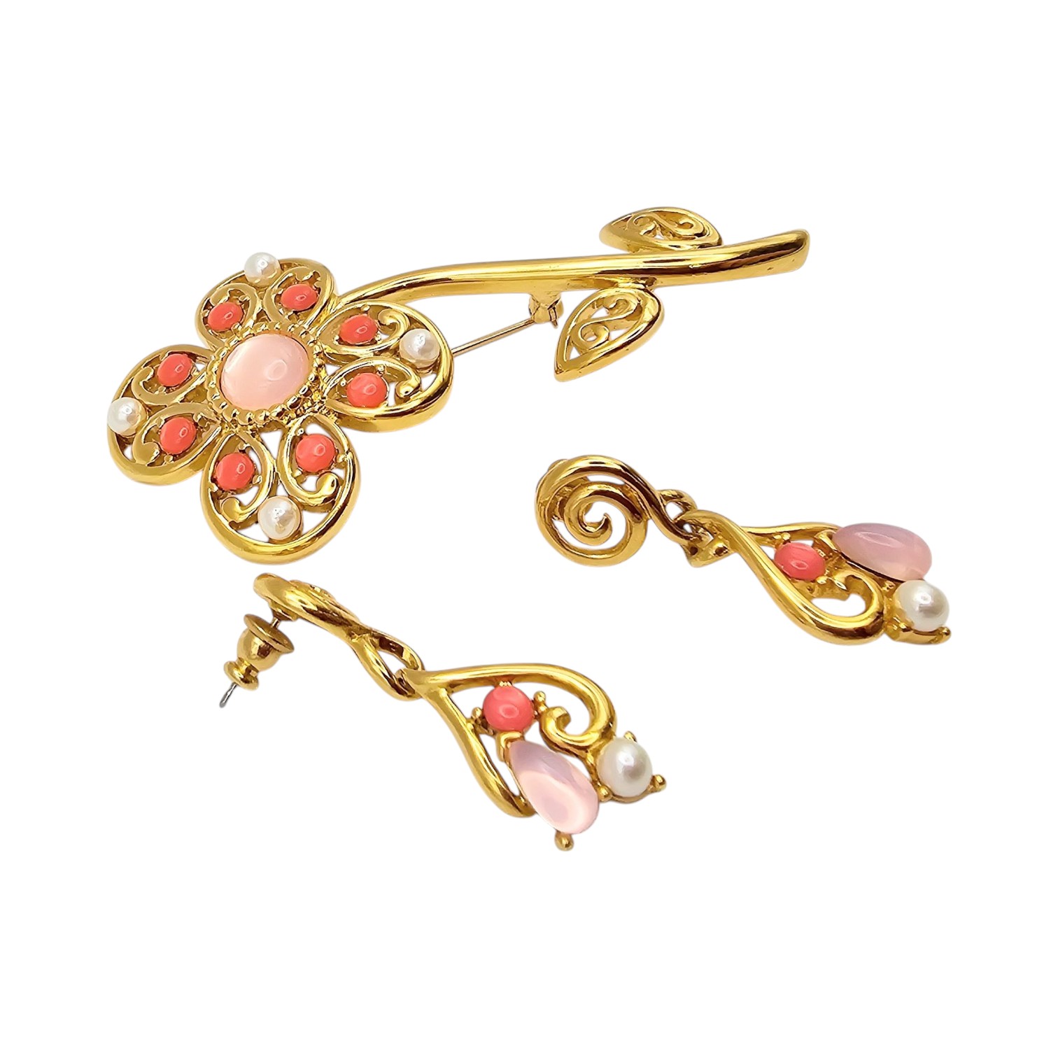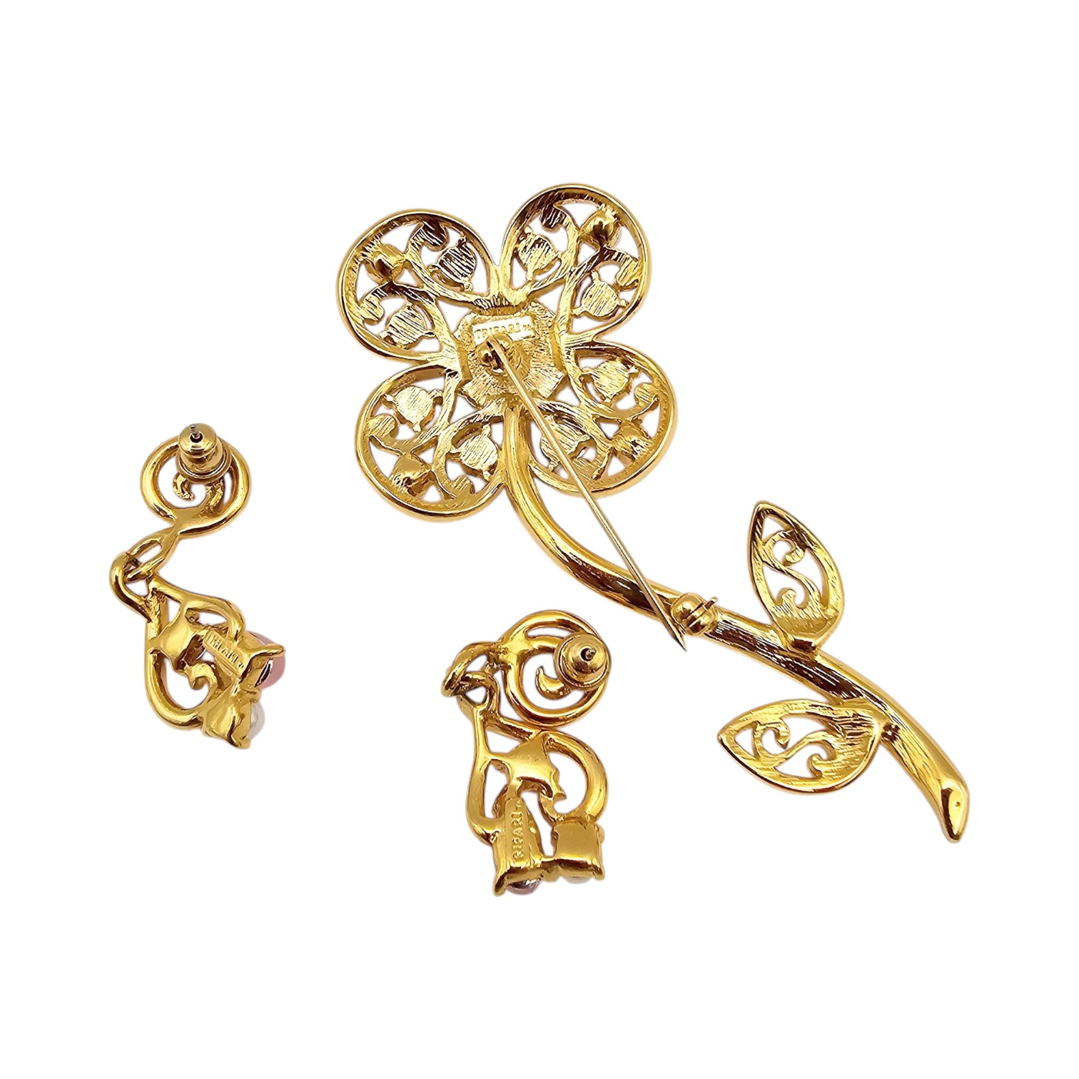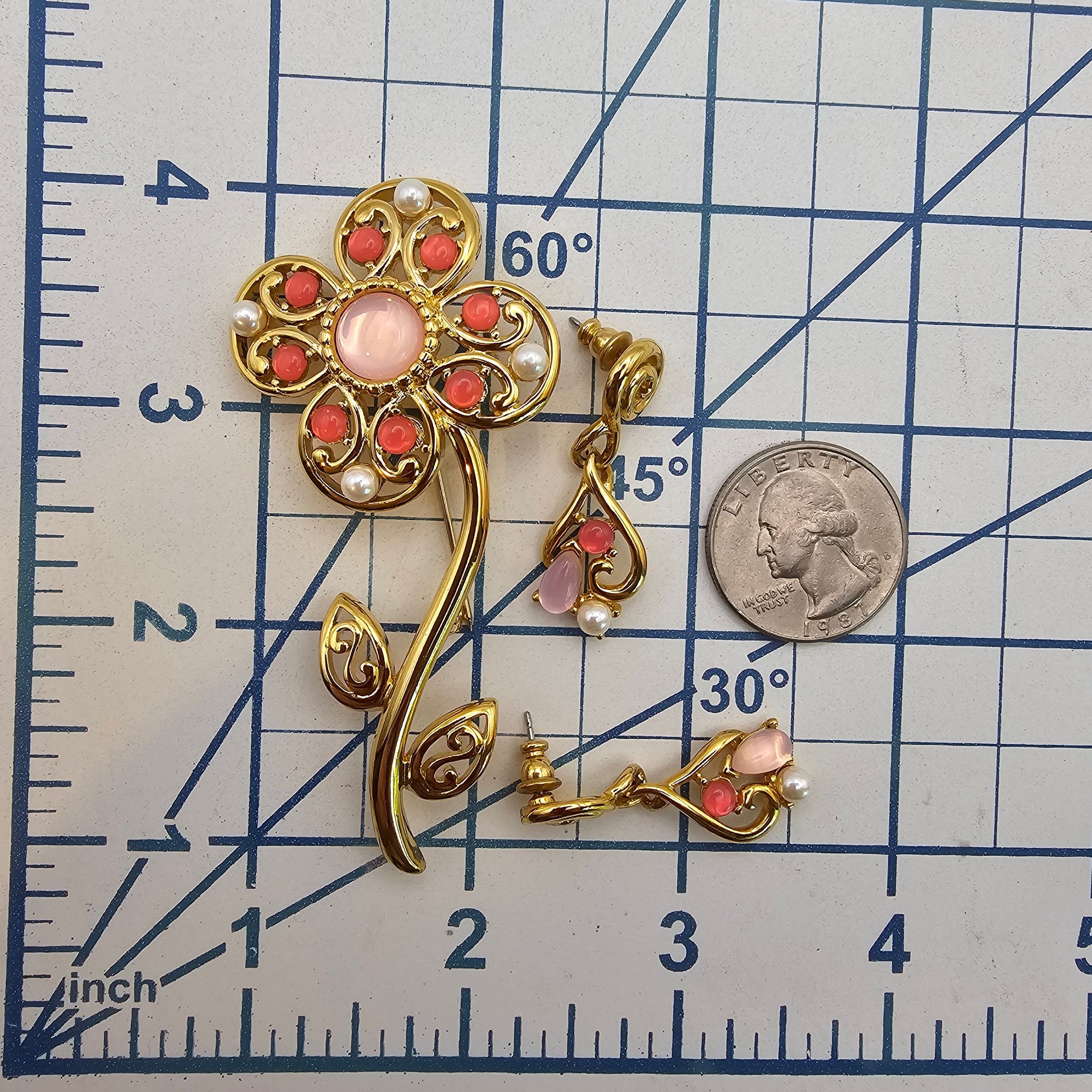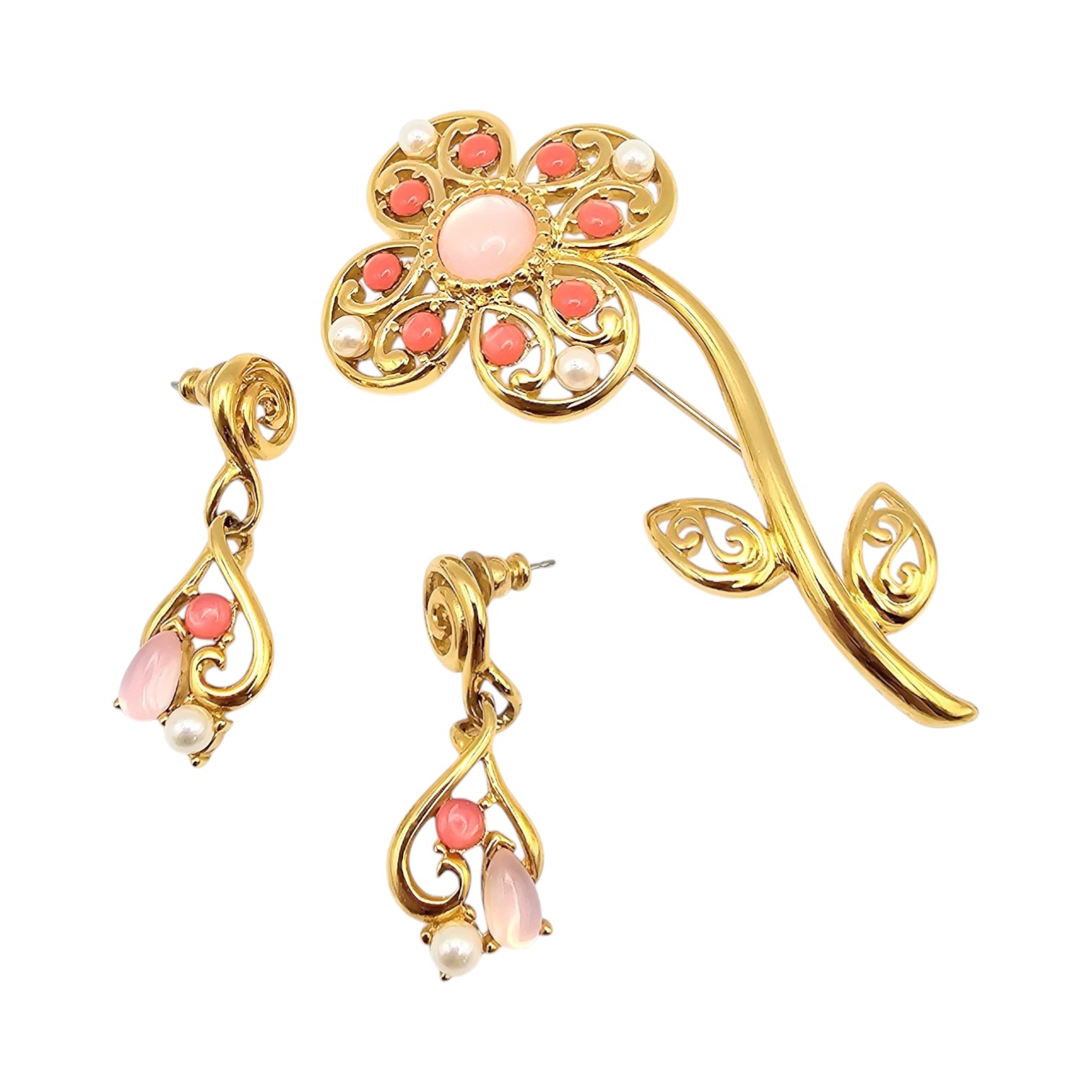 Trifari Gold tone Faux Pearl Pink Flower Brooch Earrings Set