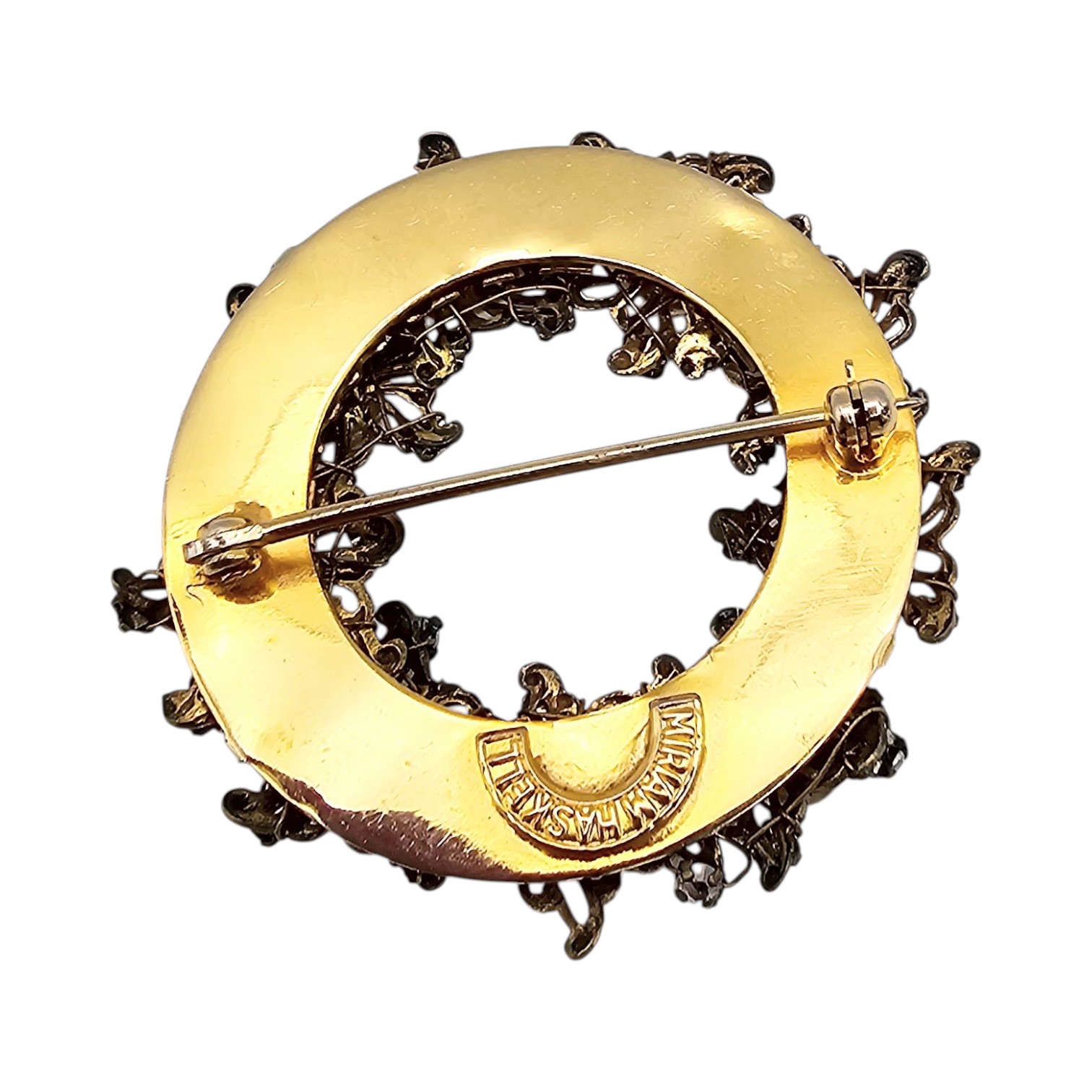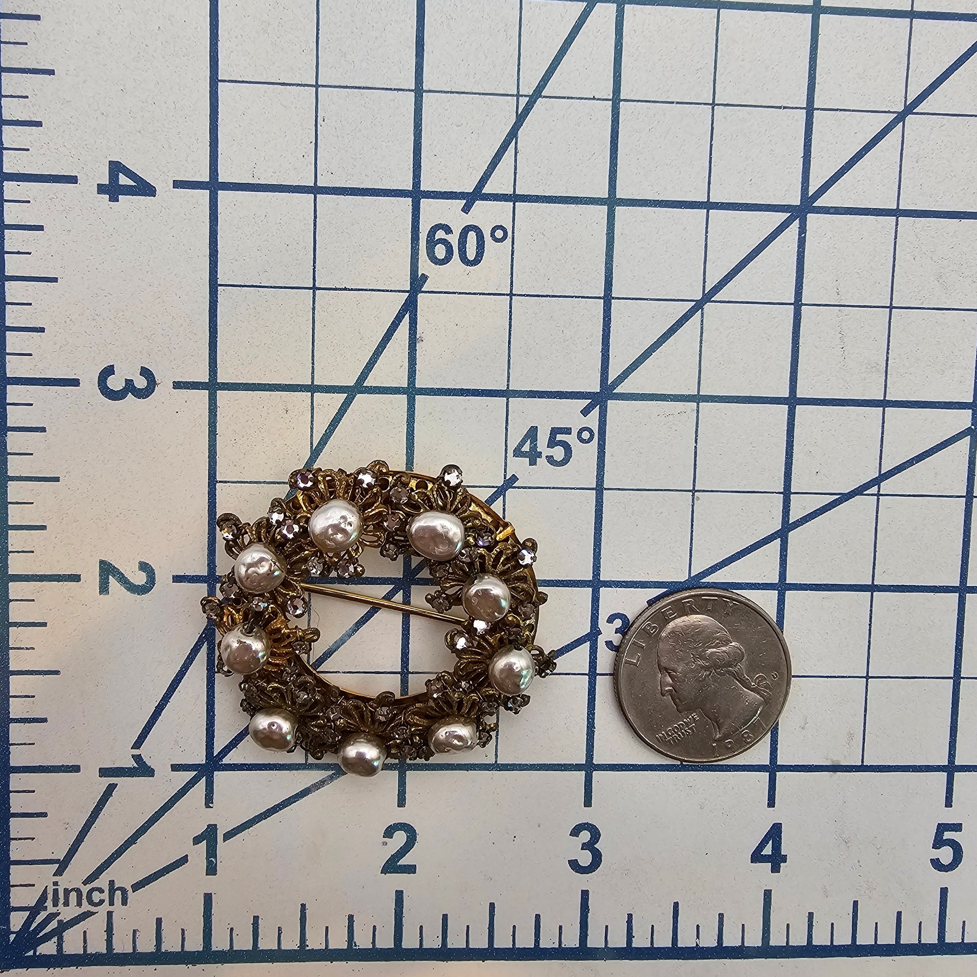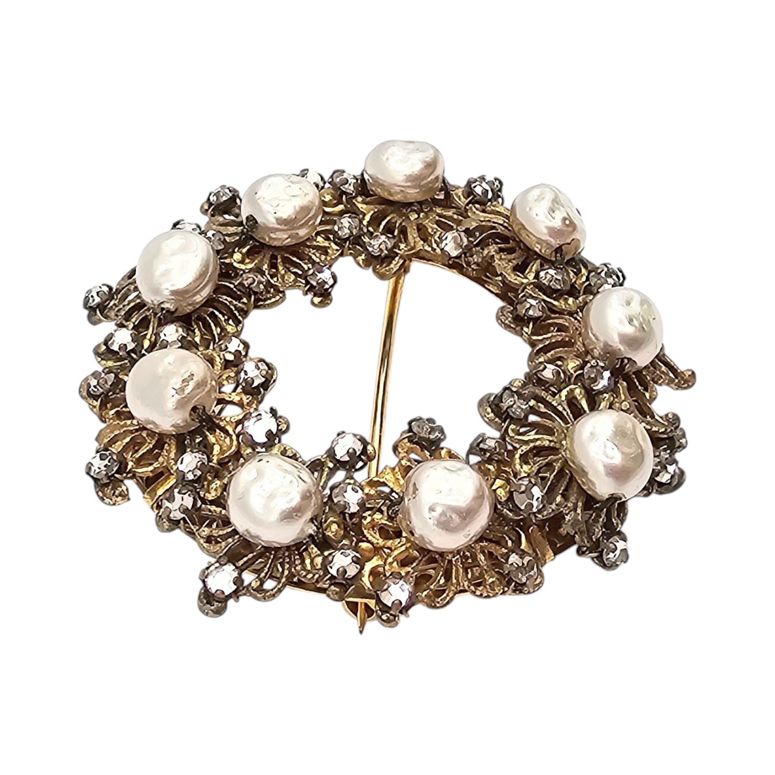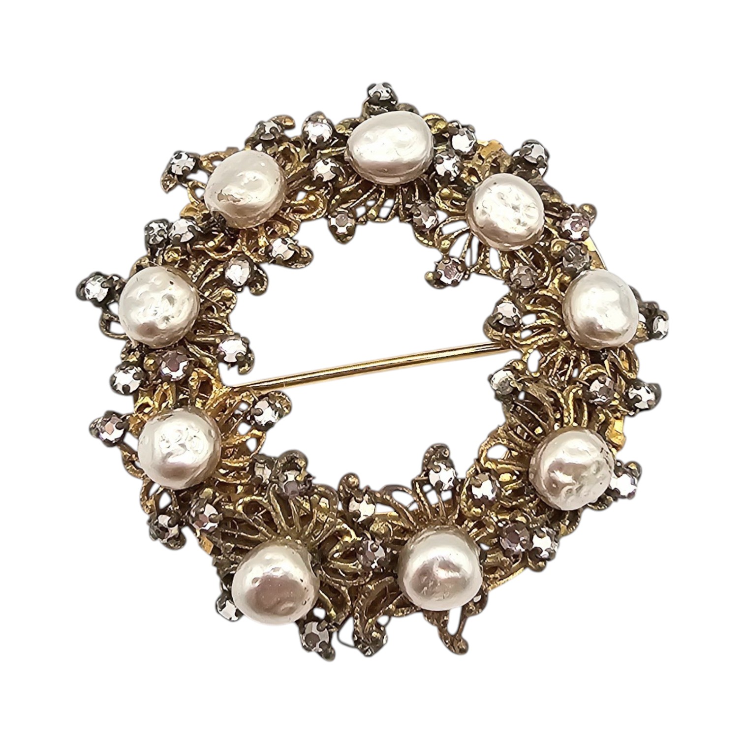 Miriam Haskell Faux Pearl Gold Tone Rhinestone Wreath Brooch