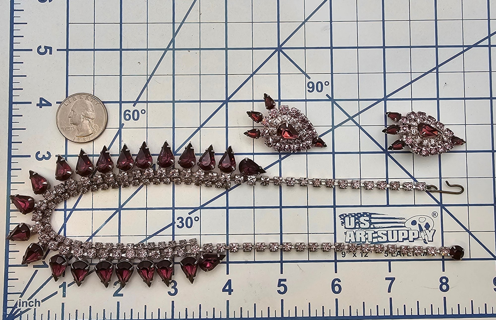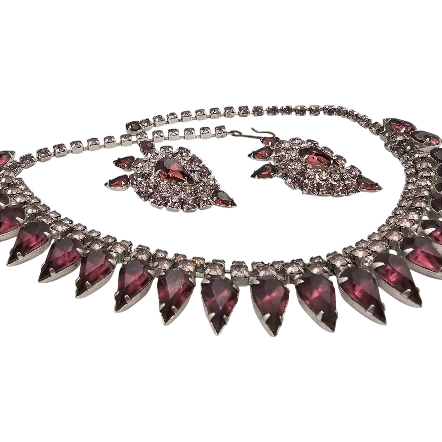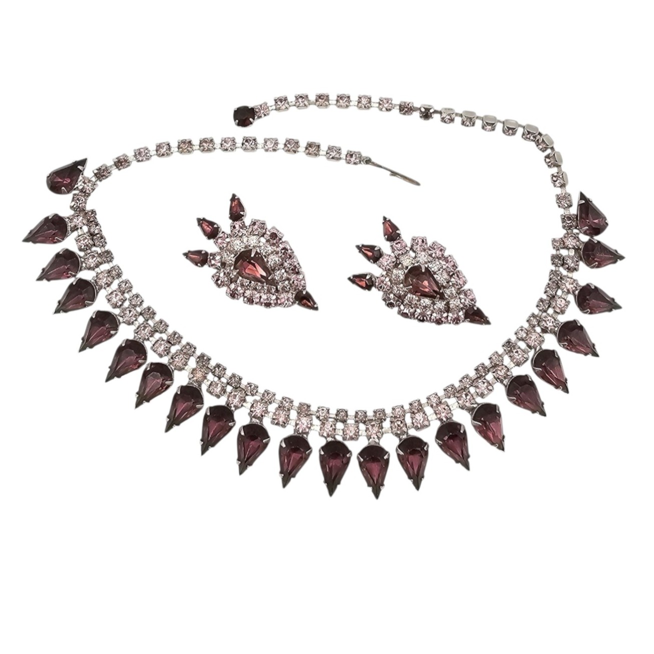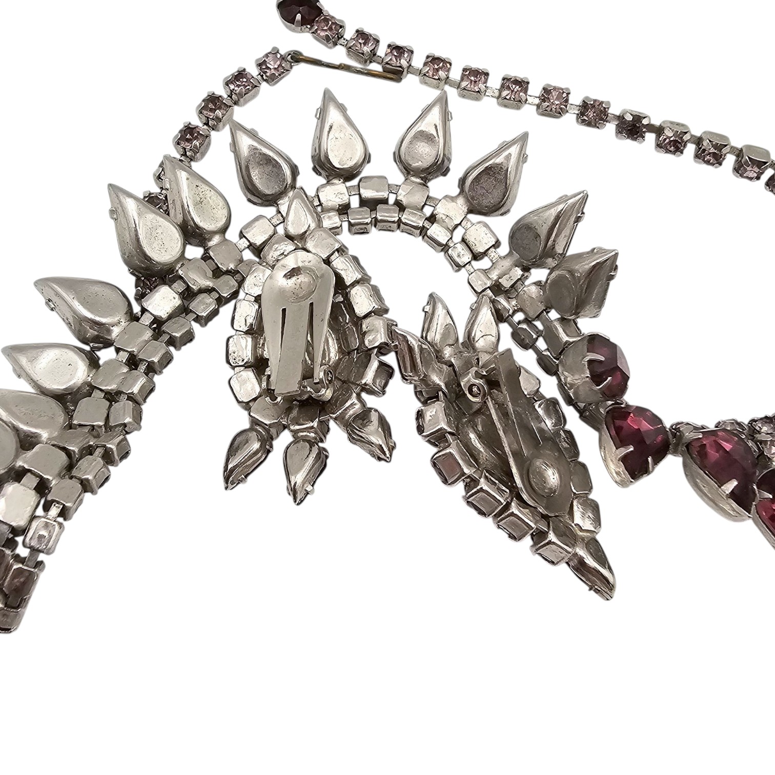 Vintage Purple Pink Rhinestone Collar Necklace Earrings Set