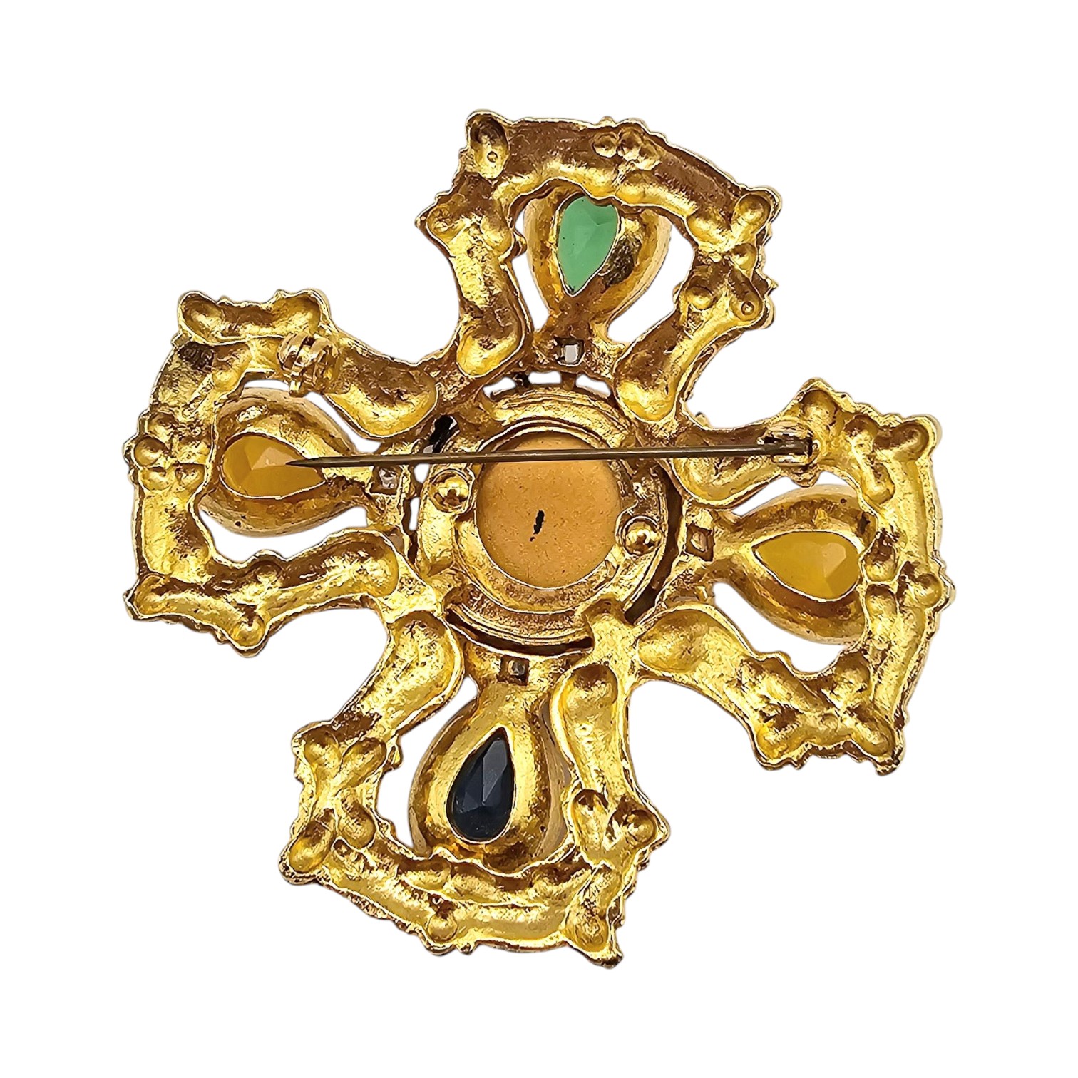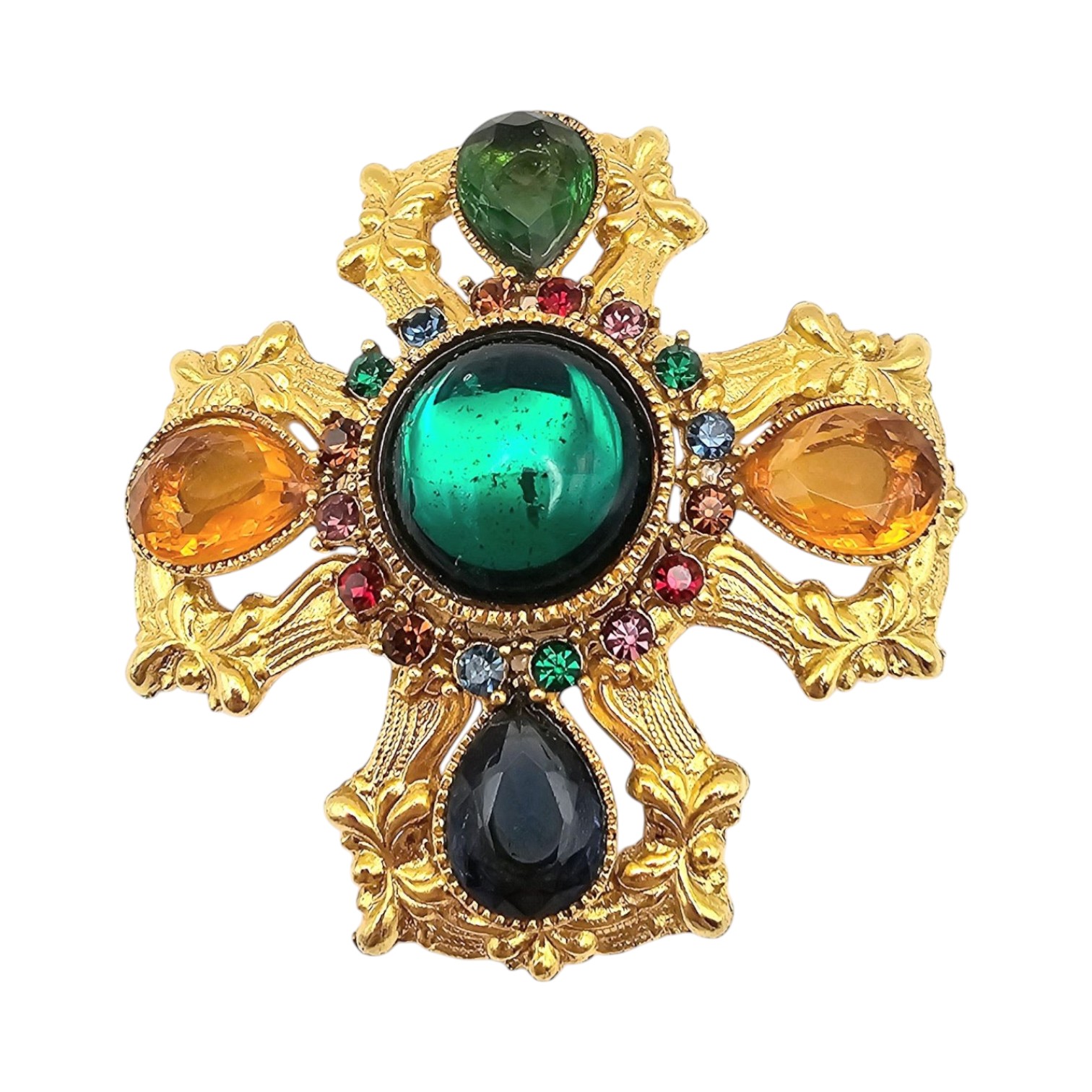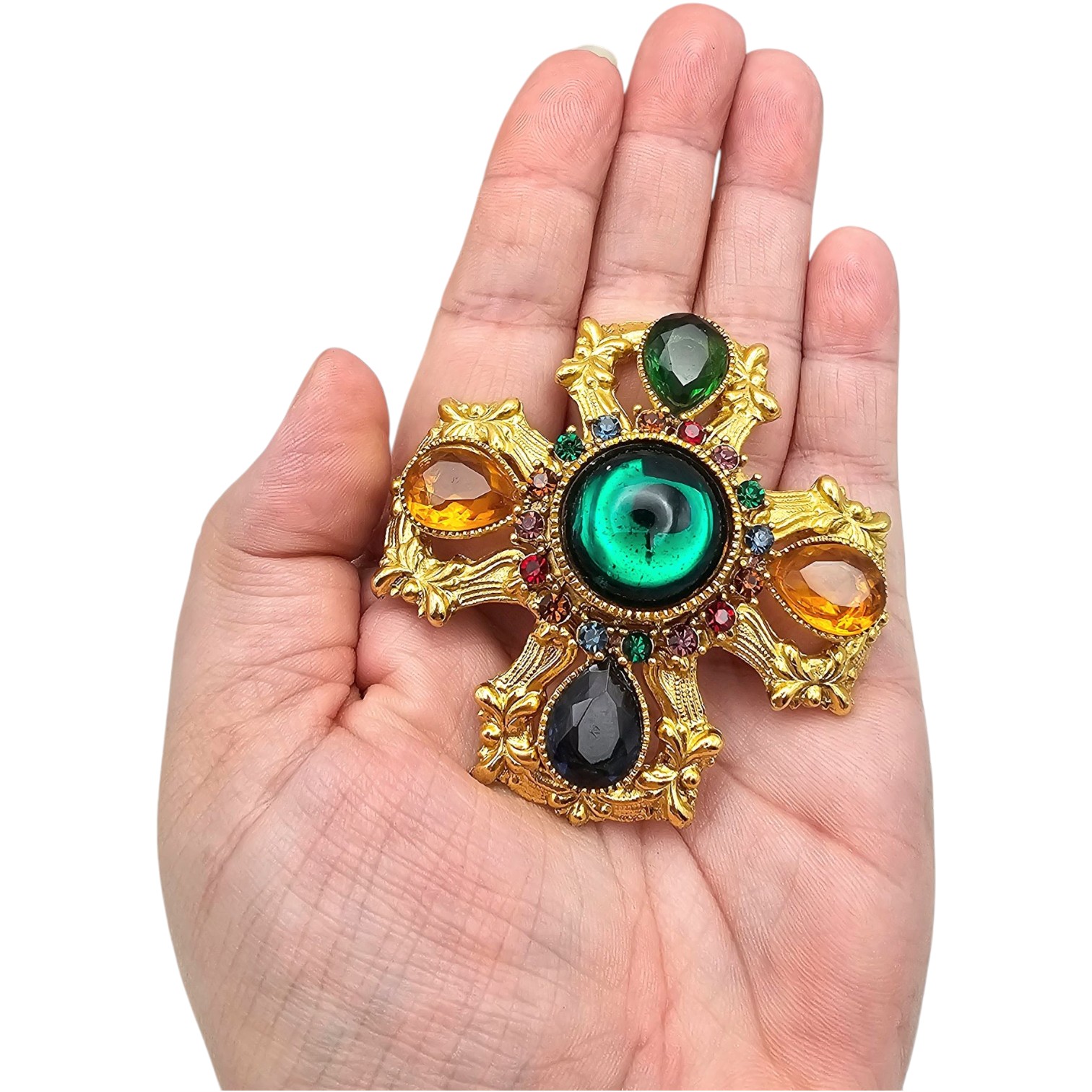 Vintage Oversized Colorful Rhinestone Gold Tone Ornate Brooch