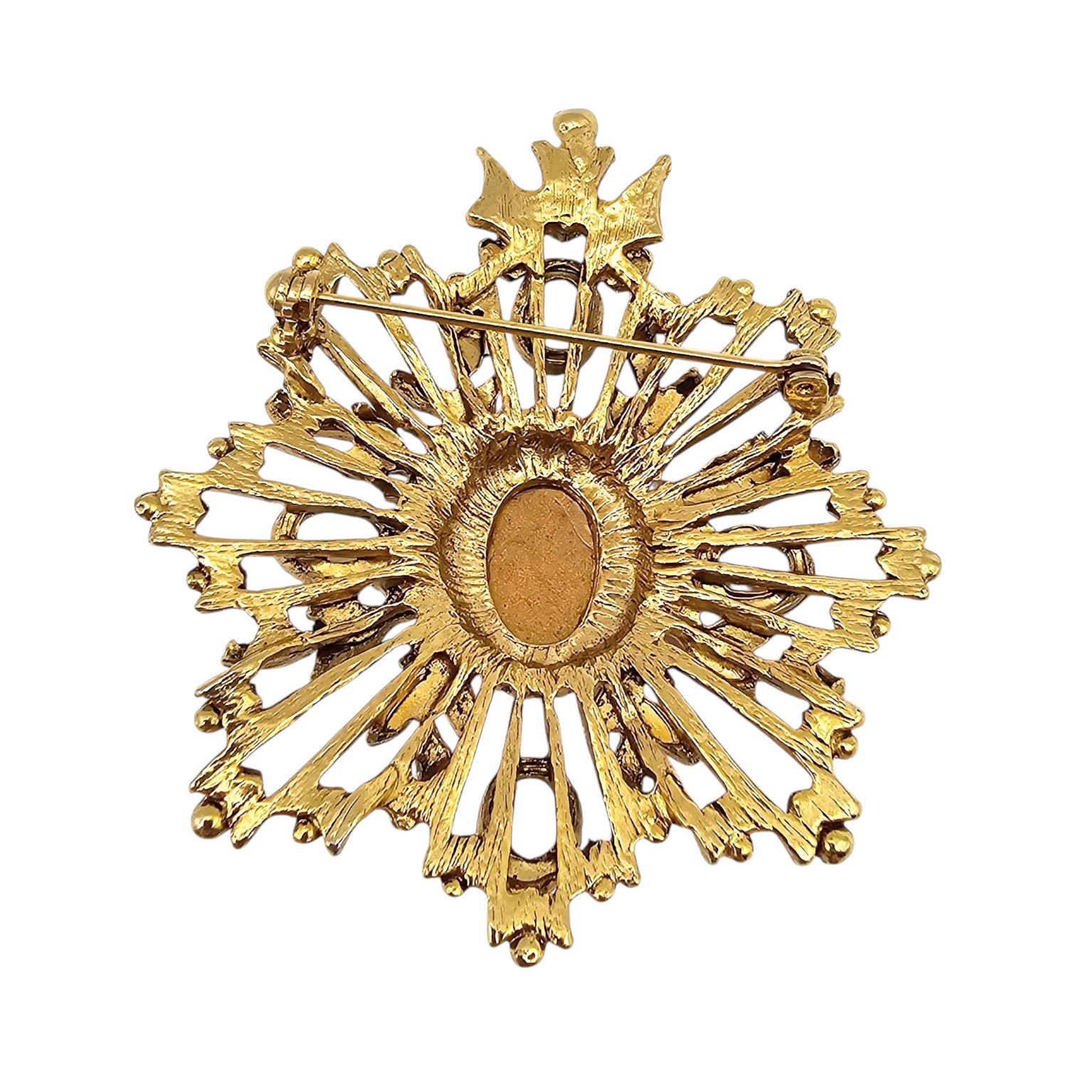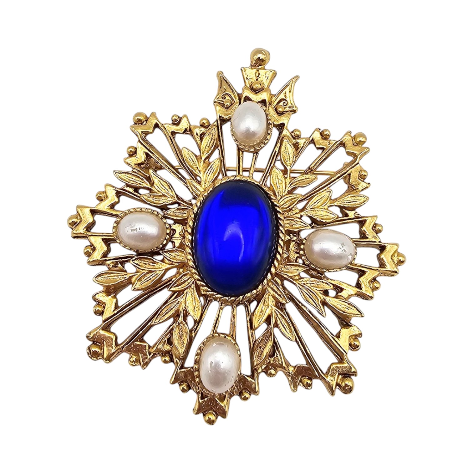 Vintage Large Blue Center Faux Pearl Gold Tone Layered Brooch