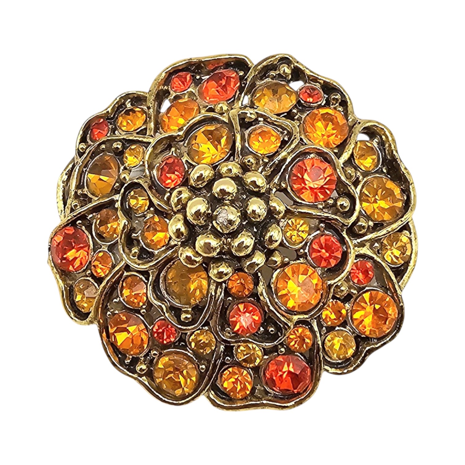Hollycraft Orange Rhinestone Gold Tone Flower Brooch