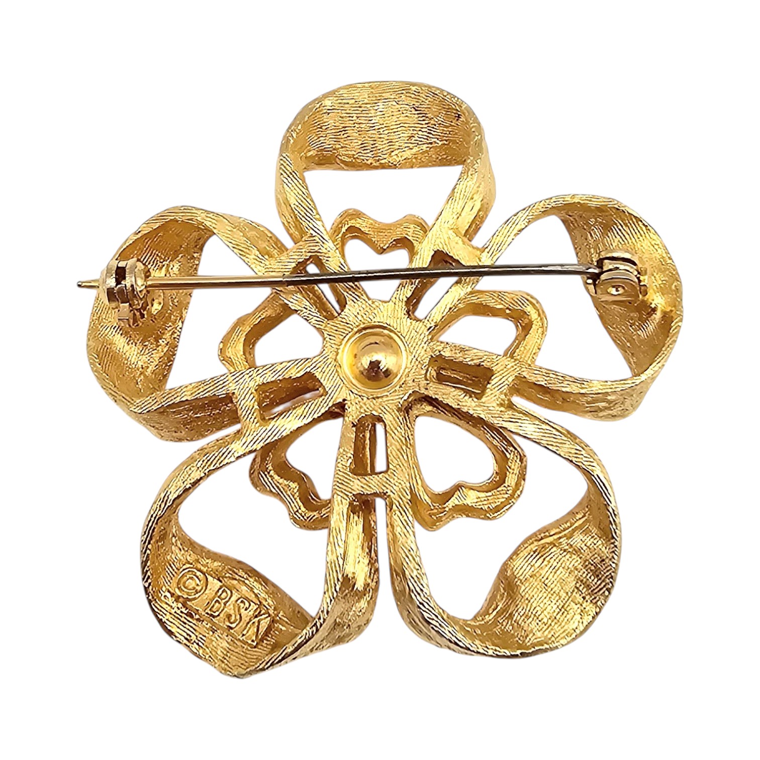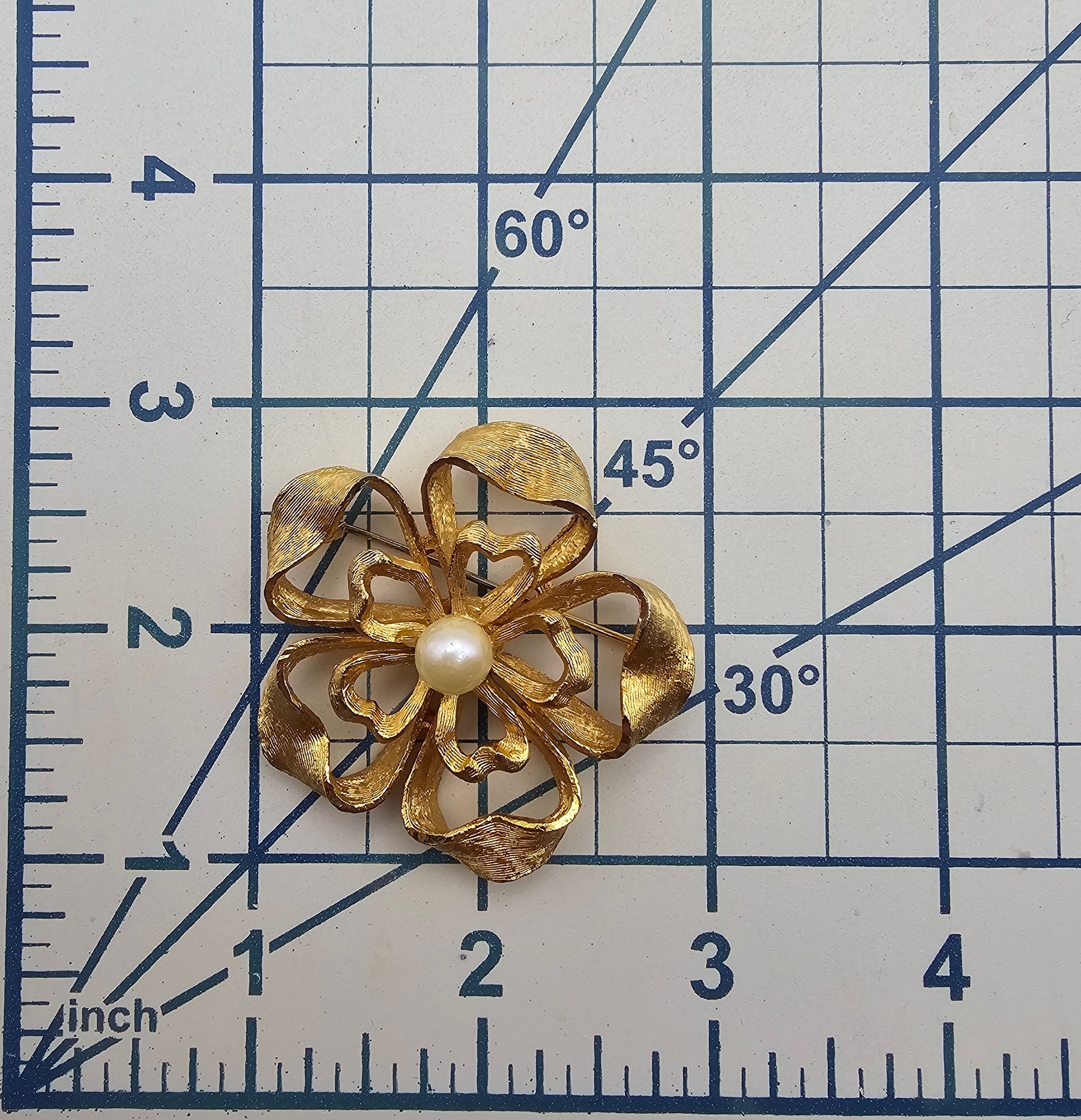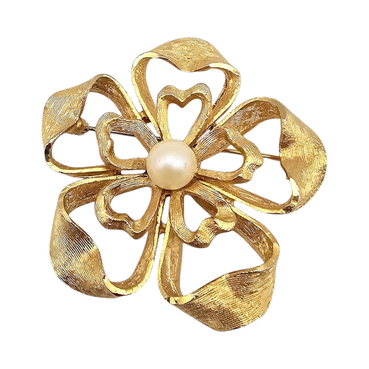 BSK Faux Pearl Brushed Gold Tone Flower Brooch